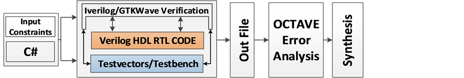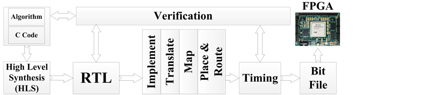 The idea behind the fixed-to-floating point conversion system is similar to the High Level Synthesis (HLS) [18] design flow shown in Figure 4. This design flow model is used to create a proposed conversion tool design flow that is shown in Figure 5 below. The conversion tool generates the RTL design files and verifies them using the generated test bench file with user-defined test vectors. All of the test vectors are verified