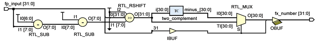To understand the functionality and effectiveness of the conversion tool, six different blocks are designed, verified and implemented using a Xilinx Virtex 7 FPGA with a 303,600 available Look Up Table (LUT) [20] . The conversion tool is used to generate Verilog HDL design and test bench files, and each design is synthesized and implemented using the Xilinx Vivado design suite. The synthesized schematics of 32-bit fixed-to-float and float-to-fixed point are shown in Figure 13 and Figure 14, respectively.