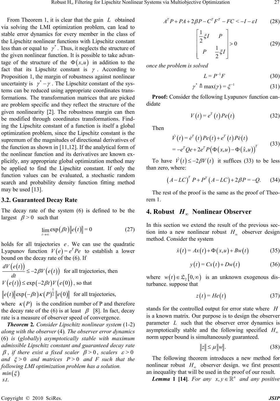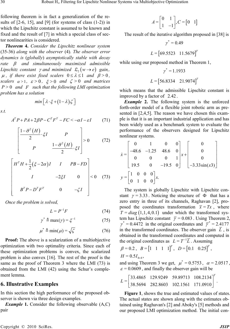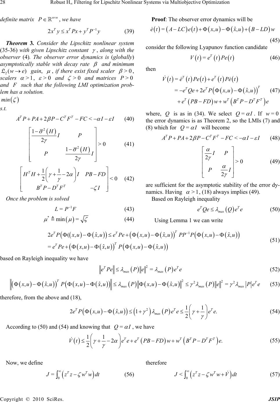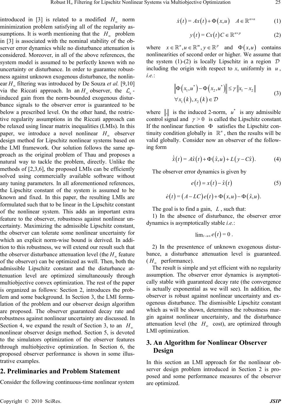 ![]() Journal of Signal and Information Processing, 20 10 , 1, 24 -34 doi:10.4236/jsip.2010.11003 Published Online November 2010 (http://www.SciRP.org/journal/jsip) Copyright © 2010 SciRes. JSIP Robust H∞ Filtering for Lipschitz Nonlinear Systems via Multiobjective Optimization Masoud Abbaszadeh1,2, Horacio J. Marquez1 1Department of Electrical and Computer Engineering, University of Alberta, Edmonton, Canada; 2Department of Research and Development, Maplesoft, Waterloo, Canada. Email: masoud@ece.ualberta.ca, marquez@ece.ualberta.ca Received October 27th, 2010; revised November 15th, 2010; accepted November 18th, 2010. ABSTRACT In this paper, a new method of H filtering for Lipschitz nonlinear systems is proposed in the form of an LMI optimi- zation problem. The proposed filter has guaranteed decay rate (exponential convergence) and is robust against un- known exogenous disturbance. In addition, thanks to the linearity of the proposed LMIs in the admissible Lipschitz con- stant, it can be maximized via LMI optimization. This adds an extra important feature to the observer, robustness against nonlinear uncertainty. Explicit bound on the tolerable nonlinear uncertainty is derived. The new LMI formula- tion also allows optimizations over the disturbance attenuation level ( H cost). Then, the admissible Lipschitz con- stant and the disturbance attenuation level of the H filter are simultaneously optimized through LMI multiobjective optimization. Keywords: Lipschitz Nonlinear Systems, Optimal Filters, Nonlinear H Filtering, LMI Optimization 1. Introduction The design of nonlinear state observers has been an area of constant research for the last three decades and as a result, a wide variety of design techniques for nonlinear observers exist in the literature. Despite important pro- gress, many outstanding problems still remain unsolved. A class of nonlinear systems of special attention is the so-called Lipschitz systems in which the mathematical model of the system satisfies a Lipschitz continuity con- dition. Many practical systems satisfy the Lipschitz con- dition, at least locally. Roughly speaking, in these sys- tems, the rate of growth of the trajectories is bounded by the rate of growth of the states. Observer design for Lipschitz systems was first considered by Thau in his seminal paper [1] where he obtained a sufficient condi- tion to ensure asymptotic stability of the observer. Thau’s condition provides a very useful analysis tool but does not address the fundamental design problem. Encouraged by Thau’s result, several authors studied observer design for Lipschitz systems [2-6]. All these methods share a common structure for the error dynamics of the nonlinear systems; namely the error dynamics can be represented as a linear system with a sector bounded nonlinearity in feedback. This type of problems are both theoretically and numerically tractable because they can be formulated as convex optimization problems [7,8]. Raghavan for- mulated a procedure to tackle the design problem. His algorithm is based on solving an algebraic Riccati equa- tion to obtain the static observer gain [2]. Unfortunately, Raghavan’s algorithm often fails to succeed even when the usual observability assumptions are satisfied. Ragha- van showed that the observer design might still be tracta- ble using state transformations. Another shortcoming of his algorithm is that it does not provide insight into what conditions must be satisfied by the observer gain to en- sure stability. A rather complete solution of these prob- lems was later presented by Rajamani [3]. Rajamani ob- tained necessary and sufficient conditions on the ob- server matrix that ensure asymptotic stability of the ob- server error and formulated a design procedure, based on the use of a gradient based optimization method. He also discussed the equivalence between the stability condition and the minimization of the H norm of a system in the standard form. However, he pointed out that the de- sign problem is not solvable as a standard H optimiza- tion problem since the regularity assumptions required in the H framework are not satisfied. Using Riccati based approach, Pertew et al. [6] showed that the condition ![]() Robust H∞ Filtering for Lipschitz Nonlinear Systems via Multiobjective Optimization Copyright © 2010 SciRes. JSIP 25 introduced in [3] is related to a modified H norm minimization problem satisfying all of the regularity as- sumptions. It is worth mentioning that the H problem in [3] is associated with the nominal stability of the ob- server error dynamics while no disturbance attenuation is considered. Moreover, in all of the above references, the system model is assumed to be perfectly known with no uncertainty or disturbance. In order to guarantee robust- ness against unknown exogenous disturbance, the nonlin- ear H filtering was introduced by De Souza et al. [9,10] via the Riccati approach. In an H observer, the - induced gain from the norm-bounded exogenous distur- bance signals to the observer error is guaranteed to be below a prescribed level. On the other hand, the restric- tive regularity assumptions in the Riccati approach can be relaxed using linear matrix inequalities (LMIs). In this paper, we introduce a novel nonlinear H observer design method for Lipschitz nonlinear systems based on the LMI framework. Our solution follows the same ap- proach as the original problem of Thau and proposes a natural way to tackle the problem, directly. Unlike the methods of [2,3,6], the proposed LMIs can be efficiently solved using commercially available software without any tuning parameters. In all aforementioned references, the Lipschitz constant of the system is assumed to be known and fixed. In this paper, the resulting LMIs are formulated such that to be linear in the Lipschitz constant of the nonlinear system. This adds an important extra feature to the observer, robustness against nonlinear un- certainty. Maximizing the a