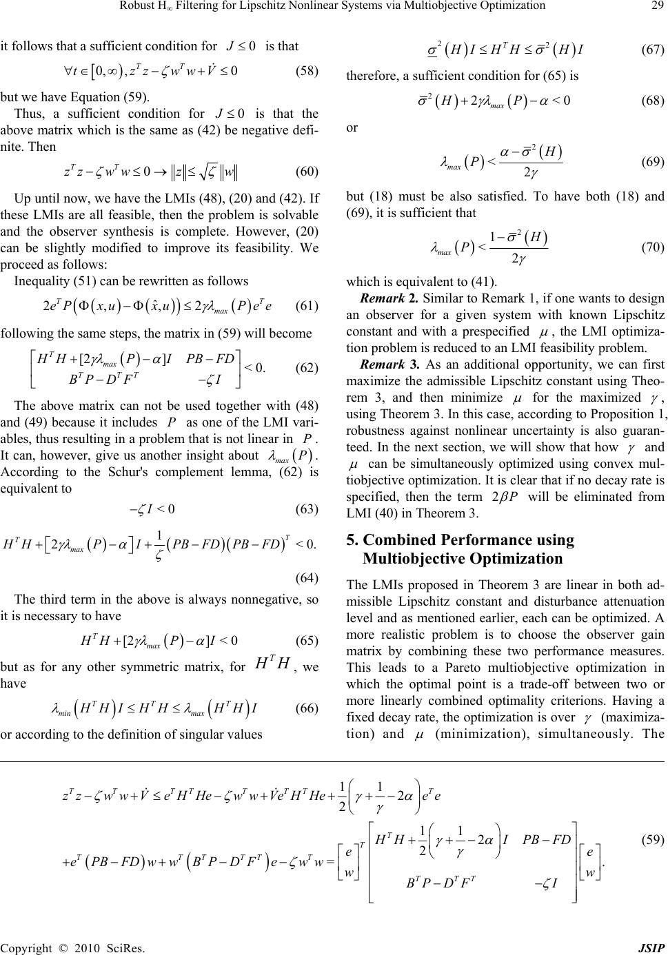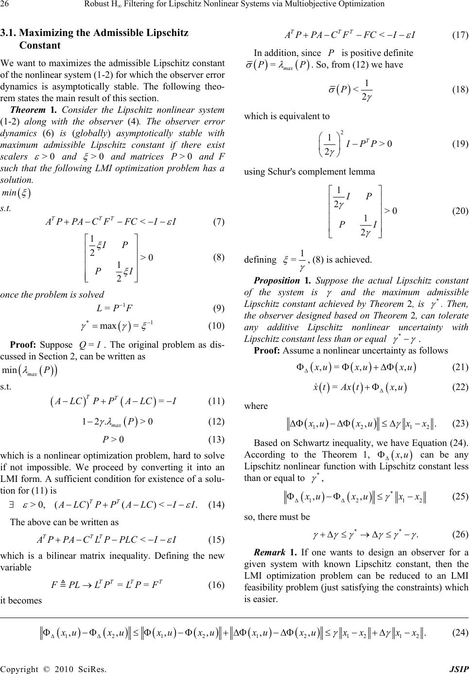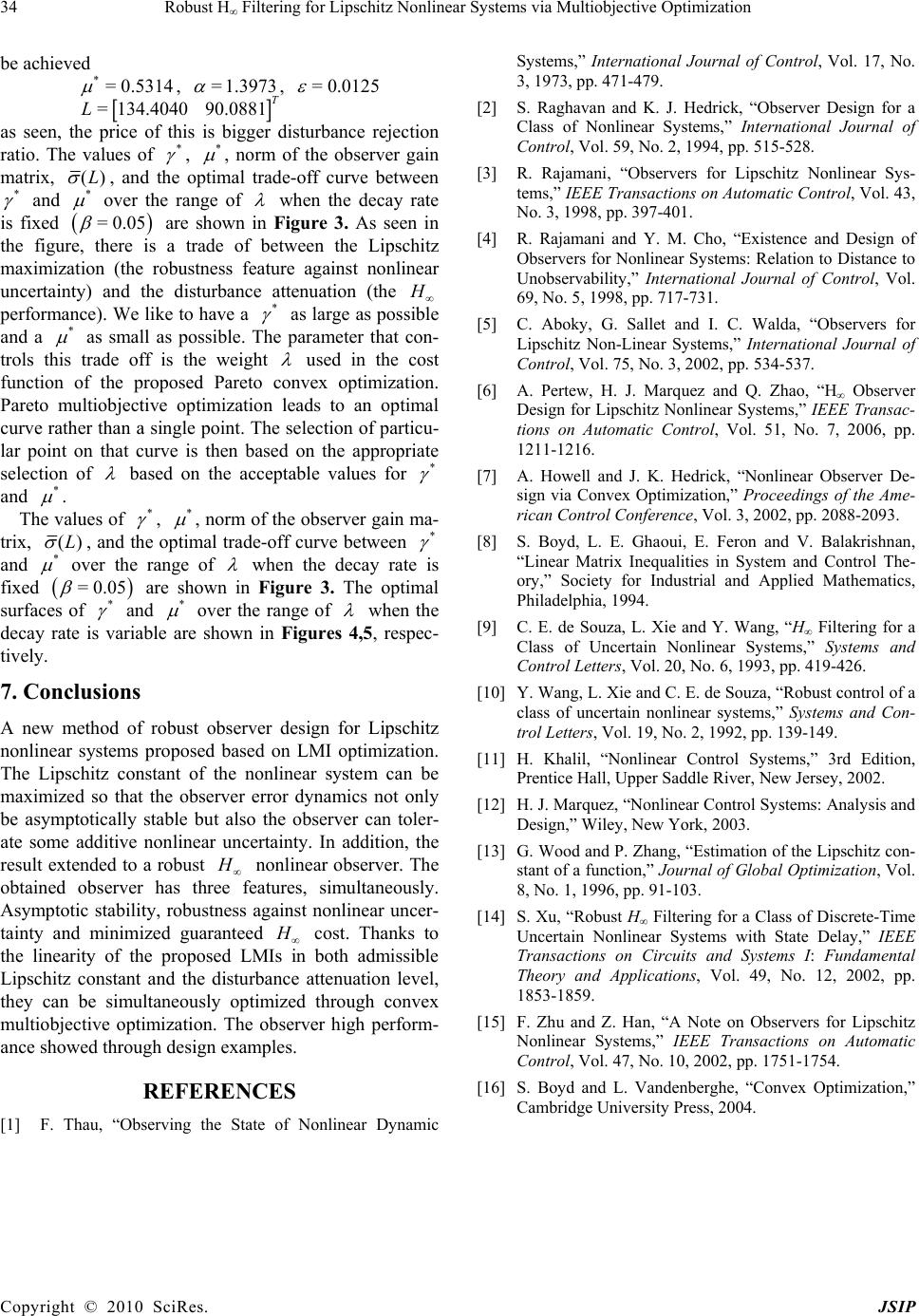 ![]() Journal of Signal and Information Processing, 20 10 , 1, 24 -34 doi:10.4236/jsip.2010.11003 Published Online November 2010 (http://www.SciRP.org/journal/jsip) Copyright © 2010 SciRes. JSIP Robust H∞ Filtering for Lipschitz Nonlinear Systems via Multiobjective Optimization Masoud Abbaszadeh1,2, Horacio J. Marquez1 1Department of Electrical and Computer Engineering, University of Alberta, Edmonton, Canada; 2Department of Research and Development, Maplesoft, Waterloo, Canada. Email: masoud@ece.ualberta.ca, marquez@ece.ualberta.ca Received October 27th, 2010; revised November 15th, 2010; accepted November 18th, 2010. ABSTRACT In this paper, a new method of H filtering for Lipschitz nonlinear systems is proposed in the form of an LMI optimi- zation problem. The proposed filter has guaranteed decay rate (exponential convergence) and is robust against un- known exogenous disturbance. In addition, thanks to the linearity of the proposed LMIs in the admissible Lipschitz con- stant, it can be maximized via LMI optimization. This adds an extra important feature to the observer, robustness against nonlinear uncertainty. Explicit bound on the tolerable nonlinear uncertainty is derived. The new LMI formula- tion also allows optimizations over the disturbance attenuation level ( H cost). Then, the admissible Lipschitz con- stant and the disturbance attenuation level of the H filter are simultaneously optimized through LMI multiobjective optimization. Keywords: Lipschitz Nonlinear Systems, Optimal Filters, Nonlinear H Filtering, LMI Optimization 1. Introduction The design of nonlinear state observers has been an area of constant research for the last three decades and as a result, a wide variety of design techniques for nonlinear observers exist in the literature. Despite important pro- gress, many outstanding problems still remain unsolved. A class of nonlinear systems of special attention is the so-called Lipschitz systems in which the mathematical model of the system satisfies a Lipschitz continuity con- dition. Many practical systems satisfy the Lipschitz con- dition, at least locally. Roughly speaking, in these sys- tems, the rate of growth of the trajectories is bounded by the rate of growth of the states. Observer design for Lipschitz systems was first considered by Thau in his seminal paper [1] where he obtained a sufficient condi- tion to ensure asymptotic stability of the observer. Thau’s condition provides a very useful analysis tool but does not address the fundamental design problem. Encouraged by Thau’s result, several authors studied observer design for Lipschitz systems [2-6]. All these methods share a common structure for the error dynamics of the nonlinear systems; namely the error dynamics can be represented as a linear system with a sector bounded nonlinearity in feedback. This type of problems are both theoretically and numerically tractable because they can be formulated as convex optimization problems [7,8]. Raghavan for- mulated a procedure to tackle the design problem. His algorithm is based on solving an algebraic Riccati equa- tion to obtain the static observer gain [2]. Unfortunately, Raghavan’s algorithm often fails to succeed even when the usual observability assumptions are satisfied. Ragha- van showed that the observer design might still be tracta- ble using state transformations. Another shortcoming of his algorithm is that it does not provide insight into what conditions must be satisfied by the observer gain to en- sure stability. A rather complete solution of these prob- lems was later presented by Rajamani [3]. Rajamani ob- tained necessary and sufficient conditions on the ob- server matrix that ensure asymptotic stability of the ob- server error and formulated a design procedure, based on the use of a gradient based optimization method. He also discussed the equivalence between the stability condition and the minimization of the H norm of a system in the standard form. However, he pointed out that the de- sign problem is not solvable as a standard H optimiza- tion problem since the regularity assumptions required in the H framework are not satisfied. Using Riccati based approach, Pertew et al. [6] showed that the condition ![]() Robust H∞ Filtering for Lipschitz Nonlinear Systems via Multiobjective Optimization Copyright © 2010 SciRes. JSIP 25 introduced in [3] is related to a modified H norm minimization problem satisfying all of the regularity as- sumptions. It is worth mentioning that the H problem in [3] is associated with the nominal stability of the ob- server error dynamics while no disturbance attenuation is considered. Moreover, in all of the above references, the system model is assumed to be perfectly known with no uncertainty or disturbance. In order to guarantee robust- ness against unknown exogenous disturbance, the nonlin- ear H filtering was introduced by De Souza et al. [9,10] via the Riccati approach. In an H observer, the - induced gain from the norm-bounded exogenous distur- bance signals to the observer error is guaranteed to be below a prescribed level. On the other hand, the restric- tive regularity assumptions in the Riccati approach can be relaxed using linear matrix inequalities (LMIs). In this paper, we introduce a novel nonlinear H observer design method for Lipschitz nonlinear systems based on the LMI framework. Our solution follows the same ap- proach as the original problem of Thau and proposes a natural way to tackle the problem, directly. Unlike the methods of [2,3,6], the proposed LMIs can be efficiently solved using commercially available software without any tuning parameters. In all aforementioned references, the Lipschitz constant of the system is assumed to be known and fixed. In this paper, the resulting LMIs are formulated such that to be linear in the Lipschitz constant of the nonlinear system. This adds an important extra feature to the observer, robustness against nonlinear un- certainty. Maximizing the a