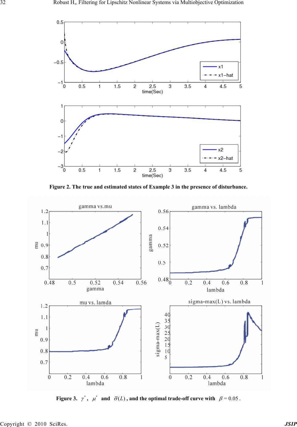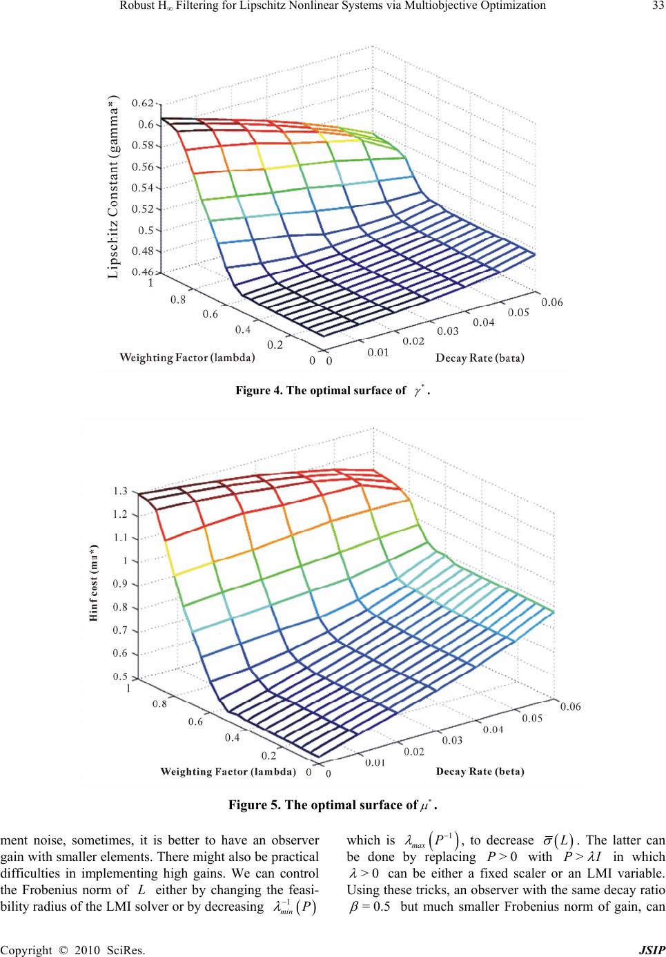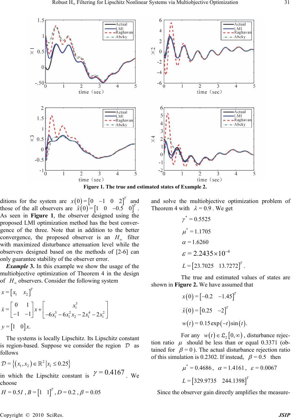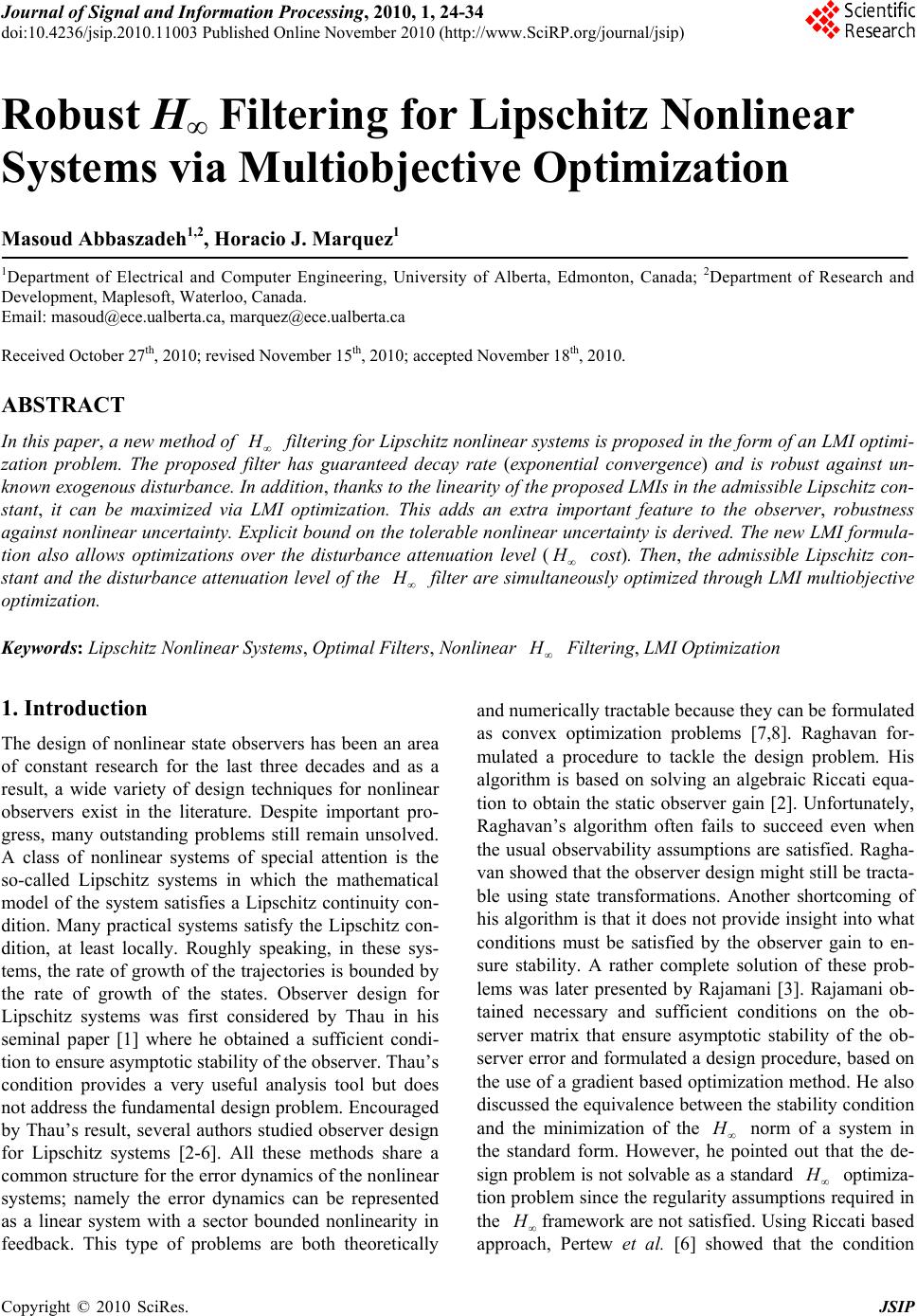 ![]() Journal of Signal and Information Processing, 20 10 , 1, 24 -34 doi:10.4236/jsip.2010.11003 Published Online November 2010 (http://www.SciRP.org/journal/jsip) Copyright © 2010 SciRes. JSIP Robust H∞ Filtering for Lipschitz Nonlinear Systems via Multiobjective Optimization Masoud Abbaszadeh1,2, Horacio J. Marquez1 1Department of Electrical and Computer Engineering, University of Alberta, Edmonton, Canada; 2Department of Research and Development, Maplesoft, Waterloo, Canada. Email: masoud@ece.ualberta.ca, marquez@ece.ualberta.ca Received October 27th, 2010; revised November 15th, 2010; accepted November 18th, 2010. ABSTRACT In this paper, a new method of H filtering for Lipschitz nonlinear systems is proposed in the form of an LMI optimi- zation problem. The proposed filter has guaranteed decay rate (exponential convergence) and is robust against un- known exogenous disturbance. In addition, thanks to the linearity of the proposed LMIs in the admissible Lipschitz con- stant, it can be maximized via LMI optimization. This adds an extra important feature to the observer, robustness against nonlinear uncertainty. Explicit bound on the tolerable nonlinear uncertainty is derived. The new LMI formula- tion also allows optimizations over the disturbance attenuation level ( H cost). Then, the admissible Lipschitz con- stant and the disturbance attenuation level of the H filter are simultaneously optimized through LMI multiobjective optimization. Keywords: Lipschitz Nonlinear Systems, Optimal Filters, Nonlinear H Filtering, LMI Optimization 1. Introduction The design of nonlinear state observers has been an area of constant research for the last three decades and as a result, a wide variety of design techniques for nonlinear observers exist in the literature. Despite important pro- gress, many outstanding problems still remain unsolved. A class of nonlinear systems of special attention is the so-called Lipschitz systems in which the mathematical model of the system satisfies a Lipschitz continuity con- dition. Many practical systems satisfy the Lipschitz con- dition, at least locally. Roughly speaking, in these sys- tems, the rate of growth of the trajectories is bounded by the rate of growth of the states. Observer design for Lipschitz systems was first considered by Thau in his seminal paper [1] where he obtained a sufficient condi- tion to ensure asymptotic stability of the observer. Thau’s condition provides a very useful analysis tool but does not address the fundamental design problem. Encouraged by Thau’s result, several authors studied observer design for Lipschitz systems [2-6]. All these methods share a common structure for the error dynamics of the nonlinear systems; namely the error dynamics can be represented as a linear system with a sector bounded nonlinearity in feedback. This type of problems are both theoretically and numerically tractable because they can be formulated as convex optimization problems [7,8]. Raghavan for- mulated a procedure to tackle the design problem. His algorithm is based on solving an algebraic Riccati equa- tion to obtain the static observer gain [2]. Unfortunately, Raghavan’s algorithm often fails to succeed even when the usual observability assumptions are satisfied. Ragha- van showed that the observer design might still be tracta- ble using state transformations. Another shortcoming of his algorithm is that it does not provide insight into what conditions must be satisfied by the observer gain to en- sure stability. A rather complete solution of these prob- lems was later presented by Rajamani [3]. Rajamani ob- tained necessary and sufficient conditions on the ob- server matrix that ensure asymptotic stability of the ob- server error and formulated a design procedure, based on the use of a gradient based optimization method. He also discussed the equivalence between the stability condition and the minimization of the H norm of a system in the standard form. However, he pointed out that the de- sign problem is not solvable as a standard H optimiza- tion problem since the regularity assumptions required in the H framework are not satisfied. Using Riccati based approach, Pertew et al. [6] showed that the condition ![]() Robust H∞ Filtering for Lipschitz Nonlinear Systems via Multiobjective Optimization Copyright © 2010 SciRes. JSIP 25 introduced in [3] is related to a modified H norm minimization problem satisfying all of the regularity as- sumptions. It is worth mentioning that the H problem in [3] is associated with the nominal stability of the ob- server error dynamics while no disturbance attenuation is considered. Moreover, in all of the above references, the system model is assumed to be perfectly known with no uncertainty or disturbance. In order to guarantee robust- ness against unknown exogenous disturbance, the nonlin- ear H filtering was introduced by De Souza et al. [9,10] via the Riccati approach. In an H observer, the - induced gain from the norm-bounded exogenous distur- bance signals to the observer error is guaranteed to be below a prescribed level. On the other hand, the restric- tive regularity assumptions in the Riccati approach can be relaxed using linear matrix inequalities (LMIs). In this paper, we introduce a novel nonlinear H observer design method for Lipschitz nonlinear systems based on the LMI framework. Our solution follows the same ap- proach as the original problem of Thau and proposes a natural way to tackle the problem, directly. Unlike the methods of [2,3,6], the proposed LMIs can be efficiently solved using commercially available software without any tuning parameters. In all aforementioned references, the Lipschitz constant of the system is assumed to be known and fixed. In this paper, the resulting LMIs are formulated such that to be linear in the Lipschitz constant of the nonlinear system. This adds an important extra feature to the observer, robustness against nonlinear un- certainty. Maximizing the a