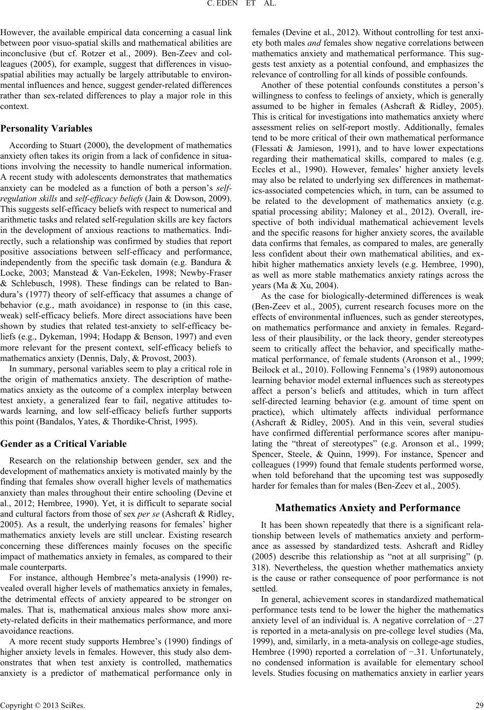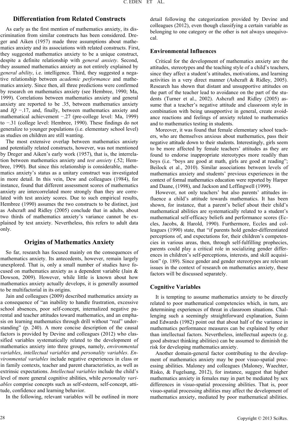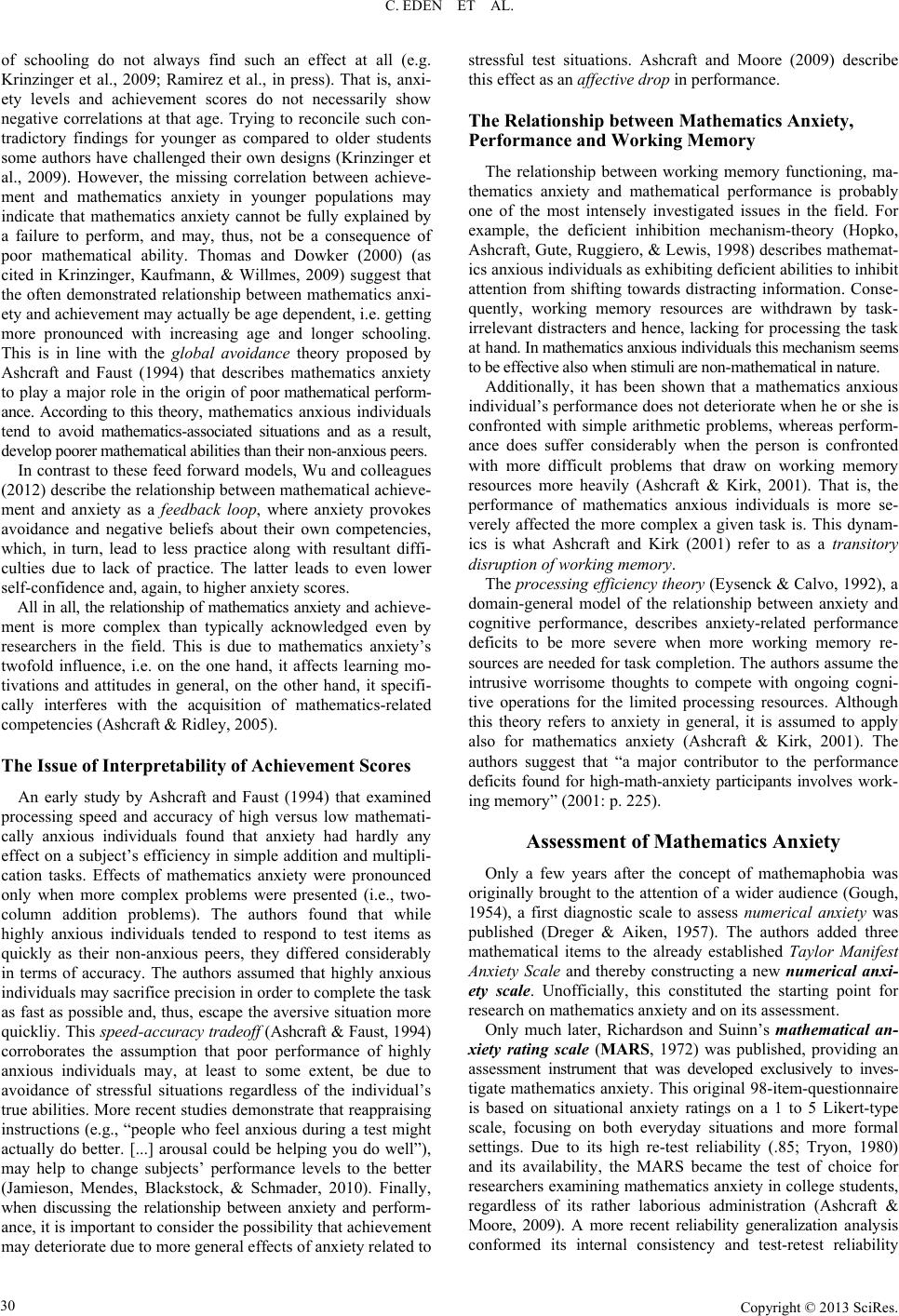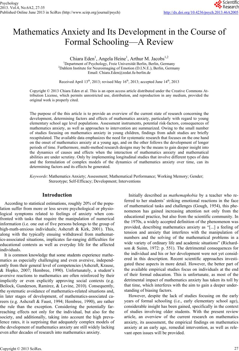 Psychology 2013. Vol.4, No.6A2, 27-35 Published Online June 2013 in SciRes (http://www.scirp.org/journal/psych) http://dx.doi.org/10.4236/psych.2013.46A2005 Copyright © 2013 SciRes. 27 Mathematics Anxiety and Its Development in the Course of Formal Schooling—A Review Chiara Eden1, Angela Heine1, Arthur M. Jacobs1,2 1Department of Psychology, Freie Universität Berlin, Berlin, Germany 2Dahlem Institute for Neuroimaging of Emotion (D.I.N.E.), Berlin, Germany Email: Chiara.Eden@zedat.fu-berlin.de Received April 13th, 2013; revised May 16th, 2013; accepted June 14th, 2013 Copyright © 2013 Chiara Eden et al. This is an open access article distributed under the Creative Commons At- tribution License, which permits unrestricted use, distribution, and reproduction in any medium, provided the original work is properly cited. The purpose of the this article is to provide an overview of the current state of research concerning the development, determining factors and effects of mathematics anxiety, particularly with regard to young elementary school age level populations. Assessment instruments, potential risk-factors, consequences of mathematics anxiety, as well as approaches to intervention are summarized. Owing to the small number of studies focusing on mathematics anxiety in young children, findings from adult studies are briefly recapitulated. The available data emphasizes the need for systematic research that focuses on the one hand on the onset of mathematics anxiety at a young age, and on the other follows the development of longer periods of time. Furthermore, multi-method research designs may be the means to gain deeper insight into the dynamics of causes and effects when the interaction of mathematics anxiety and mathematical abilities are under scrutiny. Only by implementing longitudinal studies that involve different types of data and the formulation of complex models of the dynamics of mathematics anxiety over time, can its determining factors and its effects be generated. Keywords: Mathematics Anxiety; Assessment; Mathematical Performance; Working Memory; Gender; Stereotype; Self-Efficacy; Development; Interventions Introduction According to statistical estimations, roughly 20% of the popu- lation suffer from more or less severe psychological or physio- logical symptoms related to feelings of anxiety when con- fronted with tasks that require the manipulation of numerical information (i.e. one out of five persons belongs to the group of high-math-anxious individuals; Ashcraft & Kirk, 2001). This, along with the typically ensuing withdrawal from mathemat- ics-associated situations, implicates far-ranging difficulties for educational contexts as well as everyday life for the affected individuals. It is common knowledge that some students experience mathe- matics as especially challenging and even aversive, independ- ently from their general level of competencies (Ashcraft, Krause, & Hopko, 2007; Hembree, 1990). Unfortunately, a student’s aversive reactions to mathematics are often reinforced by their implicitly or even explicitly approving social contexts (e.g. Beilock, Gunderson, Ramirez, & Levine, 2010). Consequently, the systematic avoidance of mathematics-related situations and, in later stages of development, of mathematics-associated ca- reers (e.g. Ashcraft & Faust, 1994; Hembree, 1990), are rather the rule than the exception. Considering the potentially far- reaching effects not only for the individual, but also for the society, and additionally, taking into account the high preva- lence rates, it is surprising that adequately complex models of the development of mathematics anxiety are still widely lacking even after decades of research into mathematics anxiety. Initially described as mathemaphobia by a teacher who re- ferred to her students’ striking emotional reactions in the face of mathematical tasks and challenges (Gough, 1954), this phe- nomenon has gained increasing attention not only from the educational practice, but also from the scientific community. In the 1970s, a widely accepted definition of the phenomenon was provided, describing mathematics anxiety as “[...] a feeling of tension and anxiety that interferes with the manipulation of numbers and the solving of the mathematical problems in a wide variety of ordinary life and academic situations” (Richard- son & Suinn, 1972: p. 551). The detrimental consequences for the individual and his or her development were not yet consid- ered in this description. Recent scientific approaches investi- gated these aspects in more detail. However, the better part of the available empirical studies focus on individuals at the end of their formal education. This is unfortunate, as most of the detrimental impact of mathematics anxiety has taken its toll by that time, which interferes with the aim to gain a deeper under- standing of biasing factors. However, despite the lack of studies focusing on the early years of formal schooling (i.e., early elementary school age), considerable insight has been gained, specifically in the context of studies involving older students. With the present review article, an overview of the current research on mathematics anxiety, its assessment, the empirical findings on mathematics anxiety at an early age, remedial intervention, as well as rele- vant open issues will be provided.