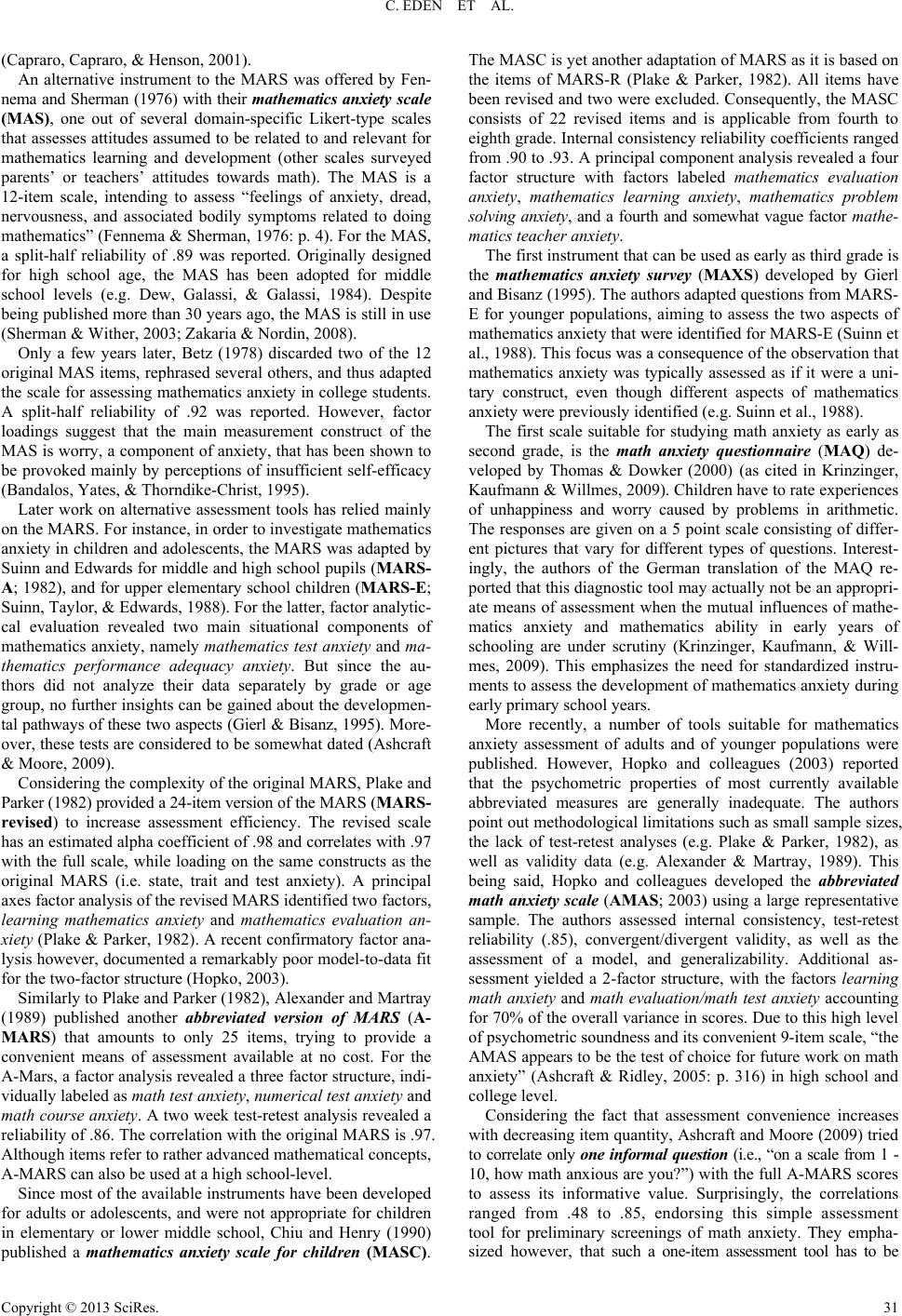 C. EDEN ET AL. (Capraro, Capraro, & Henson, 2001). An alternative instrument to the MARS was offered by Fen- nema and Sherman (1976) with their mathematics anxiety scale (MAS), one out of several domain-specific Likert-type scales that assesses attitudes assumed to be related to and relevant for mathematics learning and development (other scales surveyed parents’ or teachers’ attitudes towards math). The MAS is a 12-item scale, intending to assess “feelings of anxiety, dread, nervousness, and associated bodily symptoms related to doing mathematics” (Fennema & Sherman, 1976: p. 4). For the MAS, a split-half reliability of .89 was reported. Originally designed for high school age, the MAS has been adopted for middle school levels (e.g. Dew, Galassi, & Galassi, 1984). Despite being published more than 30 years ago, the MAS is still in use (Sherman & Wither, 2003; Zakaria & Nordin, 2008). Only a few years later, Betz (1978) discarded two of the 12 original MAS items, rephrased several others, and thus adapted the scale for assessing mathematics anxiety in college students. A split-half reliability of .92 was reported. However, factor loadings suggest that the main measurement construct of the MAS is worry, a component of anxiety, that has been shown to be provoked mainly by perceptions of insufficient self-efficacy (Bandalos, Yates, & Thorndike-Christ, 1995). Later work on alternative assessment tools has relied mainly on the MARS. For instance, in order to investigate mathematics anxiety in children and adolescents, the MARS was adapted by Suinn and Edwards for middle and high school pupils (MARS- A; 1982), and for upper elementary school children (MARS-E; Suinn, Taylor, & Edwards, 1988). For the latter, factor analytic- cal evaluation revealed two main situational components of mathematics anxiety, namely mathematics test anxiety and ma- thematics performance adequacy anxiety. But since the au- thors did not analyze their data separately by grade or age group, no further insights can be gained about the developmen- tal pathways of these two aspects (Gierl & Bisanz, 1995). More- over, these tests are considered to be somewhat dated (Ashcraft & Moore, 2009). Considering the complexity of the original MARS, Plake and Parker (1982) provided a 24-item version of the MARS (MARS- revised) to increase assessment efficiency. The revised scale has an estimated alpha coefficient of .98 and correlates with .97 with the full scale, while loading on the same constructs as the original MARS (i.e. state, trait and test anxiety). A principal axes factor analysis of the revised MARS identified two factors, learning mathematics anxiety and mathematics evaluation an- xiety (Plake & Parker, 1982). A recent confirmatory factor ana- lysis however, documented a remarkably poor model-to-data fit for the two-factor structure (Hopko, 2003). Similarly to Plake and Parker (1982), Alexander and Martray (1989) published another abbreviated version of MARS (A- MARS) that amounts to only 25 items, trying to provide a convenient means of assessment available at no cost. For the A-Mars, a factor analysis revealed a three factor structure, indi- vidually labeled as math test anxiety, numerical test anxiety and math course anxiety. A two week test-retest analysis revealed a reliability of .86. The correlation with the original MARS is .97. Although items refer to rather advanced mathematical concepts, A-MARS can also be used at a high school-level. Since most of the available instruments have been developed for adults or adolescents, and were not appropriate for children in elementary or lower middle school, Chiu and Henry (1990) published a mathematics anxiety scale for children (MASC). The MASC is yet another adaptation of MARS as it is based on the items of MARS-R (Plake & Parker, 1982). All items have been revised and two were excluded. Consequently, the MASC consists of 22 revised items and is applicable from fourth to eighth grade. Internal consistency reliability coefficients ranged from .90 to .93. A principal component analysis revealed a four factor structure with factors labeled mathematics evaluation anxiety, mathematics learning anxiety, mathematics problem solving anxiety, and a fourth and somewhat vague factor mathe- matics teacher anxiety . The first instrument that can be used as early as third grade is the mathematics anxiety survey (MAXS) developed by Gierl and Bisanz (1995). The authors adapted questions from MARS- E for younger populations, aiming to assess the two aspects of mathematics anxiety that were identified for MARS-E (Suinn et al., 1988). This focus was a consequence of the observation that mathematics anxiety was typically assessed as if it were a uni- tary construct, even though different aspects of mathematics anxiety were previously identified (e.g. Suinn et al., 1988). The first scale suitable for studying math anxiety as early as second grade, is the math anxiety questionnaire (MAQ) de- veloped by Thomas & Dowker (2000) (as cited in Krinzinger, Kaufmann & Willmes, 2009). Children have to rate experiences of unhappiness and worry caused by problems in arithmetic. The responses are given on a 5 point scale consisting of differ- ent pictures that vary for different types of questions. Interest- ingly, the authors of the German translation of the MAQ re- ported that this diagnostic tool may actually not be an appropri- ate means of assessment when the mutual influences of mathe- matics anxiety and mathematics ability in early years of schooling are under scrutiny (Krinzinger, Kaufmann, & Will- mes, 2009). This emphasizes the need for standardized instru- ments to assess the development of mathematics anxiety during early primary school years. More recently, a number of tools suitable for mathematics anxiety assessment of adults and of younger populations were published. However, Hopko and colleagues (2003) reported that the psychometric properties of most currently available abbreviate