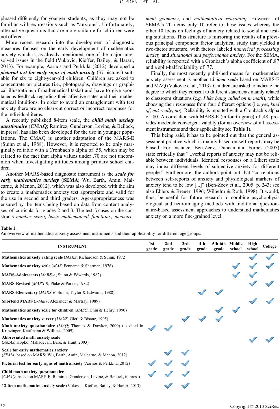 C. EDEN ET AL. Copyright © 2013 SciRes. 32 ment geometry, and mathematical reasoning. However, of SEMA’s 20 items only 10 refer to these issues whereas the other 10 focus on feelings of anxiety related to social and test- ing situations. This structure is mirroring the results of a previ- ous principal component factor analytical study that yielded a two-factor structure, with factors labeled numerical processing anxiety and situational and performance anxiety. For the SEMA, reliability is reported with a Cronbach’s alpha coefficient of .87 and a split-half reliability of .77. phrased differently for younger students, as they may not be familiar with expressions such as “anxious”. Unfortunately, alternative questions that are more suitable for children were not offered. More recent research into the development of diagnostic measures focuses on the early development of mathematics anxiety which is, as already mentioned, one of the major unre- solved issues in the field (Vukovic, Kieffer, Bailey, & Harari, 2013). For example, Aarnos and Perkkilä (2012) developed a pictorial test for early signs of math anxiety (37 pictures) suit- able for six to eight-year-old children. Children are asked to concentrate on pictures (i.e., photographs, drawings or graphi- cal illustrations of mathematical tasks) and have to give spon- taneous feedback regarding their affective states and their mathe- matical intuitions. In order to avoid an entanglement with test anxiety there are no clear-cut correct or incorrect responses for the individual items. Finally, the most recently published means for mathematics anxiety assessment is another 12 item scale based on MARS-E and MAQ (Vukovic et al., 2013). Children are asked to indicate the degree to which they consent to different statements mainly related to classroom situations (e.g. I like being called on in math ), while choosing their responses from four different options (i.e. yes, kind of, not really, no). Reliability is reported with a Cronbach’s alpha of .80. A correlation with MARS-E (in fourth grade) of .48, pro- vides moderate convergent validity (for an overview of all assess- ment instruments and their applicability see Table 1). A recently published 8-item scale, the child math anxiety questionaire (CMAQ; Ramirez, Gunderson, Levine, & Beilock, in press), has also been developed for the use in younger popu- lations. The CMAQ is another adaptation of the MARS-E (Suinn et al., 1988). However, it is reported to be only mar- ginally reliable with a Cronbach’s alpha of .55, which may be related to the fact that alpha values under .70 are not uncom- mon when investigating attitudes among primary school chil- dren. This being said, it has to be pointed out that the general as- sessment practice which is mainly based on self-reports may be biased. For instance, Ben-Zeev, Duncan and Forbes (2005) state critically that “...verbal reports of anxiety may not be reli- able between individuals. Identical responses on a Likert scale may index different levels of subjective anxiety for different people.” Furthermore, the authors point out that “correlations between self-reports of anxiety and physiological markers of anxiety tend to be low [...]” (Ben-Zeev et al., 2005: p. 243; see also Ehlers & Breuer, 1996; Wilhelm & Roth, 1998). It would, thus, be useful for future research to combine psychophysi- ological and neuroimaging methods with traditional question- naire-based assessment approaches to understand mathematics anxiety on a more fine-grained level. Another MARS-based diagnostic instrument is the scale for early mathematics anxiety (SEMA; Wu, Barth, Amin, Mal- carne, & Menon, 2012), which was also developed with the aim to create a mathematics anxiety test appropriate and valid for the use in second and third graders. Age-appropriateness was ensured by the items being based on data from content analy- ses of curricula for grades 2 and 3. The test focuses on the con- structs number sense , basic mathematical functions, measure- Table 1. An overview of mathematics anxiety assessment instruments and their applicability for different age groups. INSTRUMENT 1st grade 2nd grade 3rd grade 4th grade 5th-6th grade Middle school High school College Mathemat i cs anxiety rating scale (MARS; Richardson & Suinn, 1972) Mathema t i cs anxiety scale (MAS; Fennema & Sherman, 1976) MARS-Adolescents (MARS -A; Suinn & Edwards, 1982) MARS-Revised (MARS-R; Plake & Parker, 1982) MARS-Elementary (MARS-E; Suinn, Taylor & Edwards, 1988) Shortend MARS (s-Mars; Alexander & Martray, 1989) Mathematics anxiety scale for children (MASC; Chiu & Henry, 1990) Mathema t i cs anxiety survey (MAXS; Gierl & Bisanz, 1995) Math anxiety questionnaire (MAQ; Thomas & Dowker, 2000) (as cited in Krinzinger, Kaufmann & Willmes, 2009) Abbreviated math anxiety scale (AMAS, Hopko, Mahadevan, Bare, & Hunt, 2003) Scale for e arly mathematics anxiety (SEMA, based on MARS; Wu, Barth, Amin, Malcarne, & Menon, 2012) Pictorial test for early signs of math anxiety (Aarnos & Perkkilä, 2012) Child math a n xiety questionnaire (CMAQ, based on MARS-E; Ramirez, Gunderson, Levine, & Beilock, in press) 12-item mathematics anxiety scal e (Vukovic, Kieffer, Bailey, & Harari, 2013)