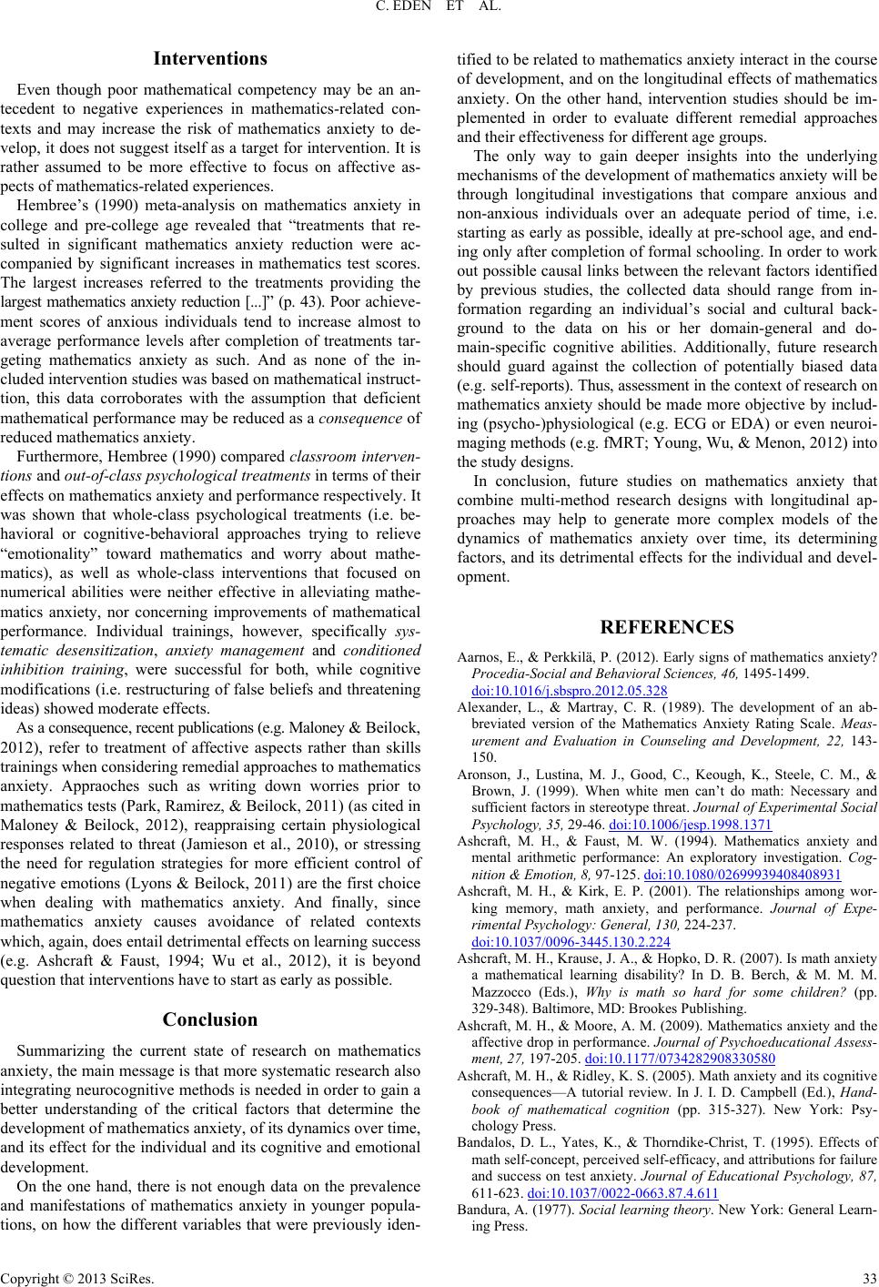 C. EDEN ET AL. Interventions Even though poor mathematical competency may be an an- tecedent to negative experiences in mathematics-related con- texts and may increase the risk of mathematics anxiety to de- velop, it does not suggest itself as a target for intervention. It is rather assumed to be more effective to focus on affective as- pects of mathematics-related experiences. Hembree’s (1990) meta-analysis on mathematics anxiety in college and pre-college age revealed that “treatments that re- sulted in significant mathematics anxiety reduction were ac- companied by significant increases in mathematics test scores. The largest increases referred to the treatments providing the largest mathematics anxiety reduction [...]” (p. 43). Poor achieve- ment scores of anxious individuals tend to increase almost to average performance levels after completion of treatments tar- geting mathematics anxiety as such. And as none of the in- cluded intervention studies was based on mathematical instruct- tion, this data corroborates with the assumption that deficient mathematical performance may be reduced as a consequence of reduced mathematics anxiety. Furthermore, Hembree (1990) compared classroom interven- tions and out-of-class psychological treatments in terms of their effects on mathematics anxiety and performance respectively. It was shown that whole-class psychological treatments (i.e. be- havioral or cognitive-behavioral approaches trying to relieve “emotionality” toward mathematics and worry about mathe- matics), as well as whole-class interventions that focused on numerical abilities were neither effective in alleviating mathe- matics anxiety, nor concerning improvements of mathematical performance. Individual trainings, however, specifically sys- tematic desensitization, anxiety management and conditioned inhibition training, were successful for both, while cognitive modifications (i.e. restructuring of false beliefs and threatening ideas) showed moderate effects. As a consequence, recent publications (e.g. Maloney & Beilock, 2012), refer to treatment of affective aspects rather than skills trainings when considering remedial approaches to mathematics anxiety. Appraoches such as writing down worries prior to mathematics tests (Park, Ramirez, & Beilock, 2011) (as cited in Maloney & Beilock, 2012), reappraising certain physiological responses related to threat (Jamieson et al., 2010), or stressing the need for regulation strategies for more efficient control of negative emotions (Lyons & Beilock, 2011) are the first choice when dealing with mathematics anxiety. And finally, since mathematics anxiety causes avoidance of related contexts which, again, does entail detrimental effects on learning success (e.g. Ashcraft & Faust, 1994; Wu et al., 2012), it is beyond question that interventions have to start as early as possible. Conclusion Summarizing the current state of research on mathematics anxiety, the main message is that more systematic research also integrating neurocognitive methods is needed in order to gain a better understanding of the critical factors that determine the development of mathematics anxiety, of its dynamics over time, and its effect for the individual and its cognitive and emotional development. On the one hand, there is not enough data on the prevalence and manifestations of mathematics anxiety in younger popula- tions, on how the different variables that were previously iden- tified to be related to mathematics anxiety interact in the course of development, and on the longitudinal effects of mathematics anxiety. On the other hand, intervention studies should be im- plemented in order to evaluate different remedial approaches and their effectiveness for different age groups. The only way to gain deeper insights into the underlying mechanisms of the development of mathematics anxiety will be through longitudinal investigations that compare anxious and non-anxious individuals over an adequate period of time, i.e. starting as early as possible, ideally at pre-school age, and end- ing only after completion of formal schooling. In order to work out possible causal links between the relevant factors identified by previous studies, the collected data should range from in- formation regarding an individual’s social and cultural back- ground to the data on his or her domain-general and do- main-specific cognitive abilities. Additionally, future research should guard against the collection of potentially biased data (e.g. self-reports). Thus, assessment in the context of research on mathematics anxiety should be made more objective by includ- ing (psycho-)physiological (e.g. ECG or EDA) or even neuroi- maging methods (e.g. fMRT; Young, Wu, & Menon, 2012) into the study designs. In conclusion, future studies on mathematics anxiety that combine multi-method research designs with longitudinal ap- proaches may help to generate more complex models of the dynamics of mathematics anxiety over time, its determining factors, and its detrimental effects for the individual and devel- opment. REFERENCES Aarnos, E., & Perkkilä, P. (2012). Early signs of mathematics anxiety? Procedia-Social and Behavioral Sciences, 46, 1495-1499. doi:10.1016/j.sbspro.2012.05.328 Alexander, L., & Martray, C. R. (1989). The development of an ab- breviated version of the Mathematics Anxiety Rating Scale. Meas- urement and Evaluation in Counseling and Development, 22, 143- 150. Aronson, J., Lustina, M. J., Good, C., Keough, K., Steele, C. M., & Brown, J. (1999). When white men can’t do math: Necessary and sufficient factors in stereotype threat. Journal of Experimental Social Psychology, 35, 29-46. doi:10.1006/jesp.1998.1371 Ashcraft, M. H., & Faust, M. W. (1994). Mathematics anxiety and mental arithmetic performance: An exploratory investigation. Cog- nition & Emotion, 8, 97-125. doi:10.1080/02699939408408931 Ashcraft, M. H., & Kirk, E. P. (2001). The relationships among wor- king memory, math anxi
