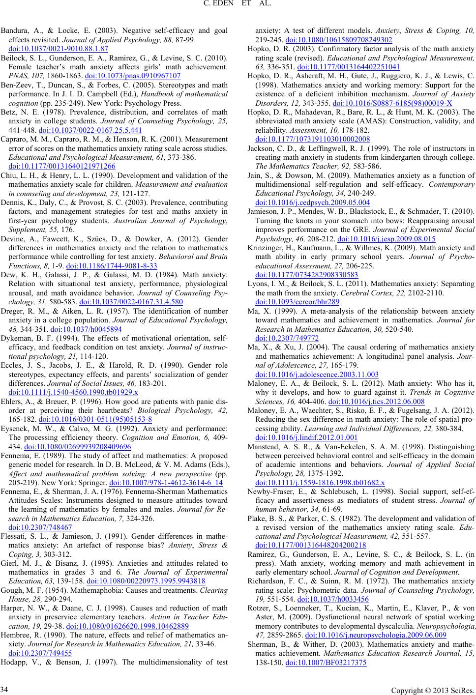 C. EDEN ET AL. Bandura, A., & Locke, E. (2003). Negative self-efficacy and goal effects revisited. Journal of Applied Psychology, 88, 87-99. doi:10.1037/0021-9010.88.1.87 Beilock, S. L., Gunderson, E. A., Ramirez, G., & Levine, S. C. (2010). Female teacher’s math anxiety affects girls’ math achievement. PNAS, 107, 1860-1863. doi:10.1073/pnas.0910967107 Ben-Zeev, T., Duncan, S., & Forbes, C. (2005). Stereotypes and math performance. In J. I. D. Campbell (Ed.), Handbook of mathematical cognition (pp. 235-249). New York: Psychology Press. Betz, N. E. (1978). Prevalence, distribution, and correlates of math anxiety in college students. Journal of Counseling Psychology, 25, 441-448. doi:10.1037/0022-0167.25.5.441 Capraro, M. M., Capraro, R. M., & Henson, R. K. (2001). Measurement error of scores on the mathematics anxiety rating scale across studies. Educational and Psychological Measuremen t, 61, 373-386. doi:10.1177/00131640121971266 Chiu, L. H., & Henry, L. L. (1990). Development and validation of the mathematics anxiety scale for children. Measurement and evaluation in counseling and development, 23, 121-127. Dennis, K., Daly, C., & Provost, S. C. (2003). Prevalence, contributing factors, and management strategies for test and maths anxiety in first-year psychology students. Australian Journal of Psychology, Supplement, 55, 176. Devine, A., Fawcett, K., Szűcs, D., & Dowker, A. (2012). Gender differences in mathematics anxiety and the relation to mathematics performance while controlling for test anxiety. Behavioral and Brain Functions, 8, 1-9. doi:10.1186/1744-9081-8-33 Dew, K. H., Galassi, J. P., & Galassi, M. D. (1984). Math anxiety: Relation with situational test anxiety, performance, physiological arousal, and math avoidance behavior. Journal of Counseling Psy- chology, 31, 580-583. doi:10.1037/0022-0167.31.4.580 Dreger, R. M., & Aiken, L. R. (1957). The identification of number anxiety in a college population. Journal of Educational Psychology, 48, 344-351. doi:10.1037/h0045894 Dykeman, B. F. (1994). The effects of motivational orientation, self- efficacy, and feedback condition on test anxiety. Journal of instruc- tional psychology, 21, 114-120. Eccles, J. S., Jacobs, J. E., & Harold, R. D. (1990). Gender role stereotypes, expectancy effects, and parents’ socialization of gender differences. Journal of Social Issues, 46, 183-201. doi:10.1111/j.1540-4560.1990.tb01929.x Ehlers, A., & Breuer, P. (1996). How good are patients with panic dis- order at perceiving their heartbeats? Biological Psychology, 42, 165-182. doi:10.1016/0301-0511(95)05153-8 Eysenck, M. W., & Calvo, M. G. (1992). Anxiety and performance: The processing efficiency theory. Cognition and Emotion, 6, 409- 434. doi:10.1080/02699939208409696 Fennema, E. (1989). The study of affect and mathematics: A proposed generic model for research. In D. B. McLeod, & V. M. Adams (Eds.), Affect and mathematical problem solving: A new perspective (pp. 205-219). New York: Springer. doi:10.1007/978-1-4612-3614-6_14 Fennema, E., & Sherman, J. A. (1976). Fennema-Sherman Mathematics Attitudes Scales: Instruments designed to measure attitudes toward the learning of mathematics by females and males. Journal for Re- search in Mathematics Education, 7, 324-326. doi:10.2307/748467 Flessati, S. L., & Jamieson, J. (1991). Gender differences in mathe- matics anxiety: An artefact of response bias? Anxiety, Stress & Coping, 3, 303-312. Gierl, M. J., & Bisanz, J. (1995). Anxieties and attitudes related to mathematics in grades 3 and 6. The Journal of Experimental Education, 63, 139-158. doi:10.1080/00220973.1995.9943818 Gough, M. F. (1954). Mathemaphobia: Causes and treatments. Clearing House, 28, 290-294. Harper, N. W., & Daane, C. J. (1998). Causes and reduction of math anxiety in preservice elementary teachers. Action in Teacher Edu- cation, 19, 29-38. doi:10.1080/01626620.1998.10462889 Hembree, R. (1990). The nature, effects and relief of mathematics an- xiety. Journal for Research in Mathematics Education, 21, 33-46. doi:10.2307/749455 Hodapp, V., & Benson, J. (1997). The multidimensionality of test anxiety: A test of different models. Anxiety, Stress & Coping, 10, 219-245. doi:10.1080/10615809708249302 Hopko, D. R. (2003). Confirmatory factor analysis of the math anxiety rating scale (revised). Educational and Psychological Measurement, 63, 336-351. doi:10.1177/0013164402251041 Hopko, D. R., Ashcraft, M. H., Gute, J., Ruggiero, K. J., & Lewis, C. (1998). Mathematics anxiety and working memory: Support for the existence of a deficient inhibition mechanism. Journal of Anxiety Disorders, 12, 343-355. doi:10.1016/S0887-6185(98)00019-X Hopko, D. R., Mahadevan, R., Bare, R. L., & Hunt, M. K. (2003). The abbreviated math anxiety scale (AMAS): Construction, validity, and reliability. Assessment, 10, 178-182. doi:10.1177/1073191103010002008 Jackson, C. D., & Leffingwell, R. J. (1999). The role of instructors in creating math anxiety in students from kindergarten through college. The Mathematics Teacher, 92, 583-586. Jain, S., & Dowson, M. (2009). Mathematics anxiety as a function of multidimensional self-regulation and self-efficacy. Contemporary Educational Psychology, 3 4, 240-249. doi:10.1016/j.cedpsych.2009.05.004 Jamieson, J. P., Mendes, W. B., Blackstock, E., & Schmader, T. (2010). Turning the knots in your stomach into bows: Reappraising arousal improves performance on the GRE. Journal of Experimental Social Psychology, 46, 208-212. doi:10.1016/j.jesp.2009.08.015 Krinzinger, H., Kaufmann, L., & Willmes, K. (2009). Math anxiety and math ability in early primary school years. Journal of Psycho- educational Assessment, 27, 206-225. doi:10.1177/0734282908330583 Lyons, I. M., & Beilock, S. L. (2011). Mathematics anxiety: Separating the math from the anxiety. Cerebral Cortex, 22, 2102-2110. doi:10.1093/cercor/bhr289 Ma, X. (1999). A meta-analysis of the relationship between anxiety toward mathematics and achievement in mathematics. Journal for Re