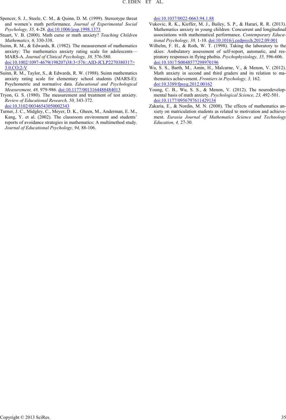 C. EDEN ET AL. Copyright © 2013 SciRes. 35 Spencer, S. J., Steele, C. M., & Quinn, D. M. (1999). Stereotype threat and women’s math performance. Journal of Experimental Social Psychology, 35, 4-28. doi:10.1006/jesp.1998.1373 Stuart, V. B. (2000). Math curse or math anxiety? Teaching Children Mathematics, 6, 330-338. Suinn, R. M., & Edwards, R. (1982). The measurement of mathematics anxiety: The mathematics anxiety rating scale for adolescents— MARS-A. Journal of Clinical Psychology, 38, 576-580. doi:10.1002/1097-4679(198207)38:3<576::AID-JCLP2270380317> 3.0.CO;2-V Suinn, R. M., Taylor, S., & Edwards, R. W. (1988). Suinn mathematics anxiety rating scale for elementary school students (MARS-E): Psychometric and normative data. Educational and Psychological Measurement, 48, 979-986. doi:10.1177/0013164488484013 Tryon, G. S. (1980). The measurement and treatment of test anxiety. Review of Educational Research, 50, 343-372. doi:10.3102/00346543050002343 Turner, J. C., Midgley, C., Meyer, D. K., Gheen, M., Anderman, E. M., Kang, Y. et al. (2002). The classroom environment and students’ reports of avoidance strategies in mathematics: A multimethod study. Journal of Educational Psychology, 94, 88-106. doi:10.1037/0022-0663.94.1.88 Vukovic, R. K., Kieffer, M. J., Bailey, S. P., & Harari, R. R. (2013). Mathematics anxiety in young children: Concurrent and longitudinal associations with mathematical performance. Contemporary Educa- tional Psychology, 38, 1-10. doi:10.1016/j.cedpsych.2012.09.001 Wilhelm, F. H., & Roth, W. T. (1998). Taking the laboratory to the skies: Ambulatory assessment of self-report, automatic, and res- piratory responses in flying phobia. Psychophysiology, 35, 596-606. doi:10.1017/S0048577298970196 Wu, S. S., Barth, M., Amin, H., Malcarne, V., & Menon, V. (2012). Math anxiety in second and third graders and its relation to ma- thematics achievement. Frontiers in Psychology, 3, 162. doi:10.3389/fpsyg.2012.00162 Young, C. B., Wu, S. S., & Menon, V. (2012). The neurodevelop- mental basis of math anxiety. Psychological Science , 23, 492-501. doi:10.1177/0956797611429134 Zakaria, E., & Nordin, M. N. (2008). The effects of mathematics an- xiety on matriculation students as related to motivation and achieve- ment. Eurasia Journal of Mathematics Science and Technology Education, 4, 27-30.