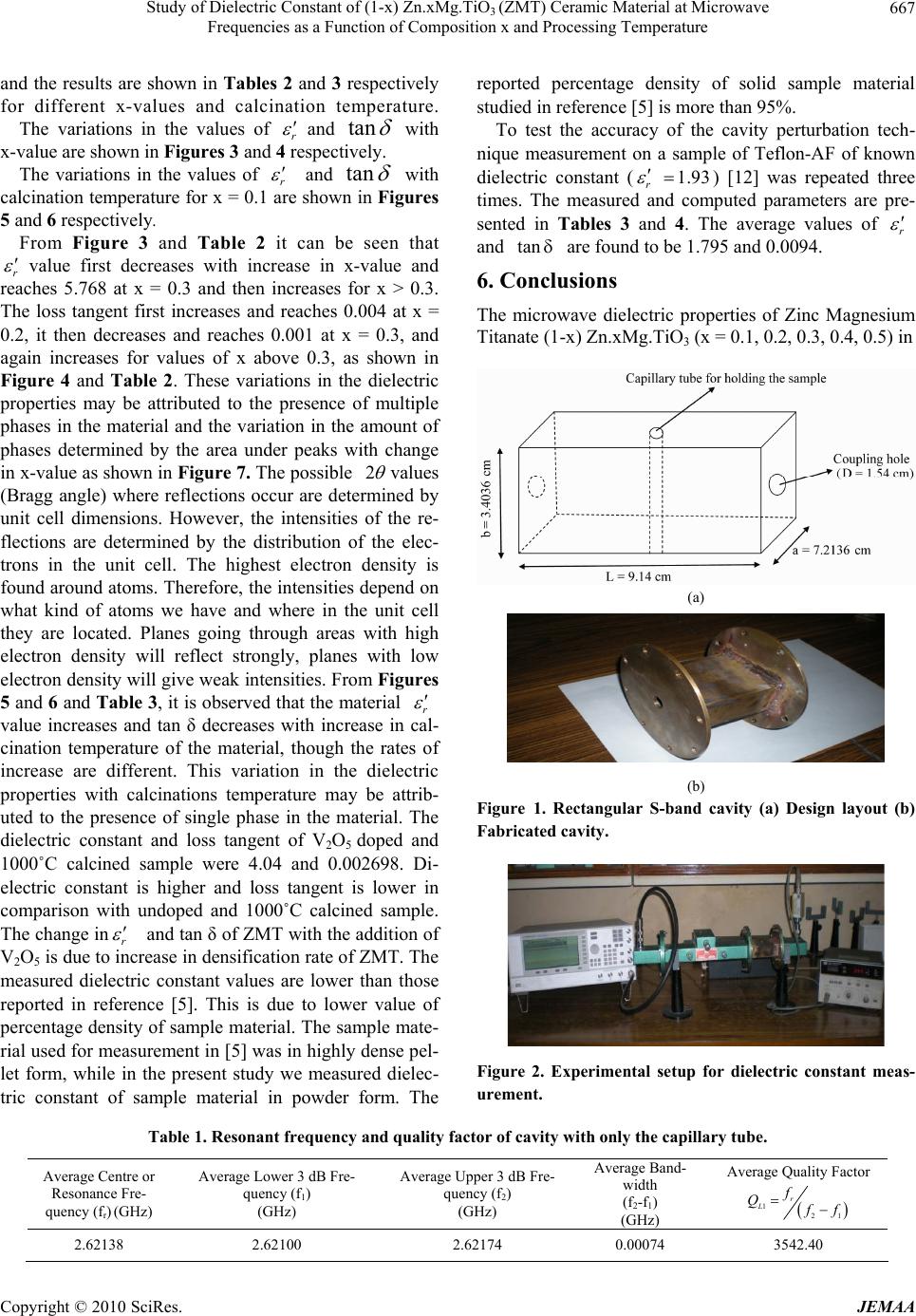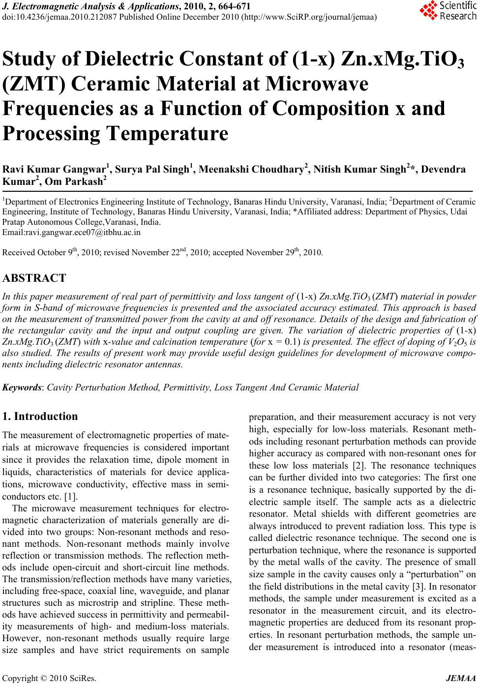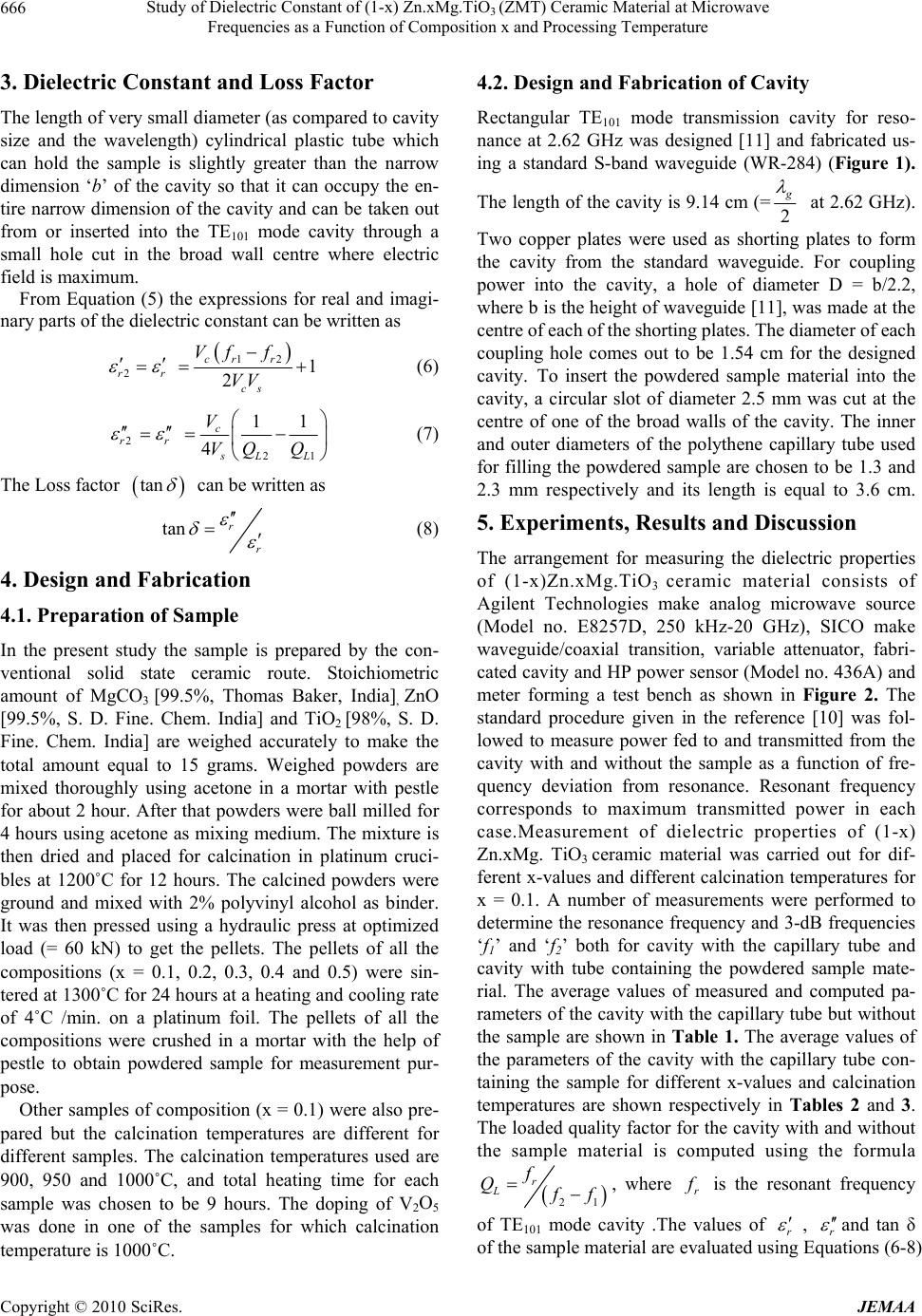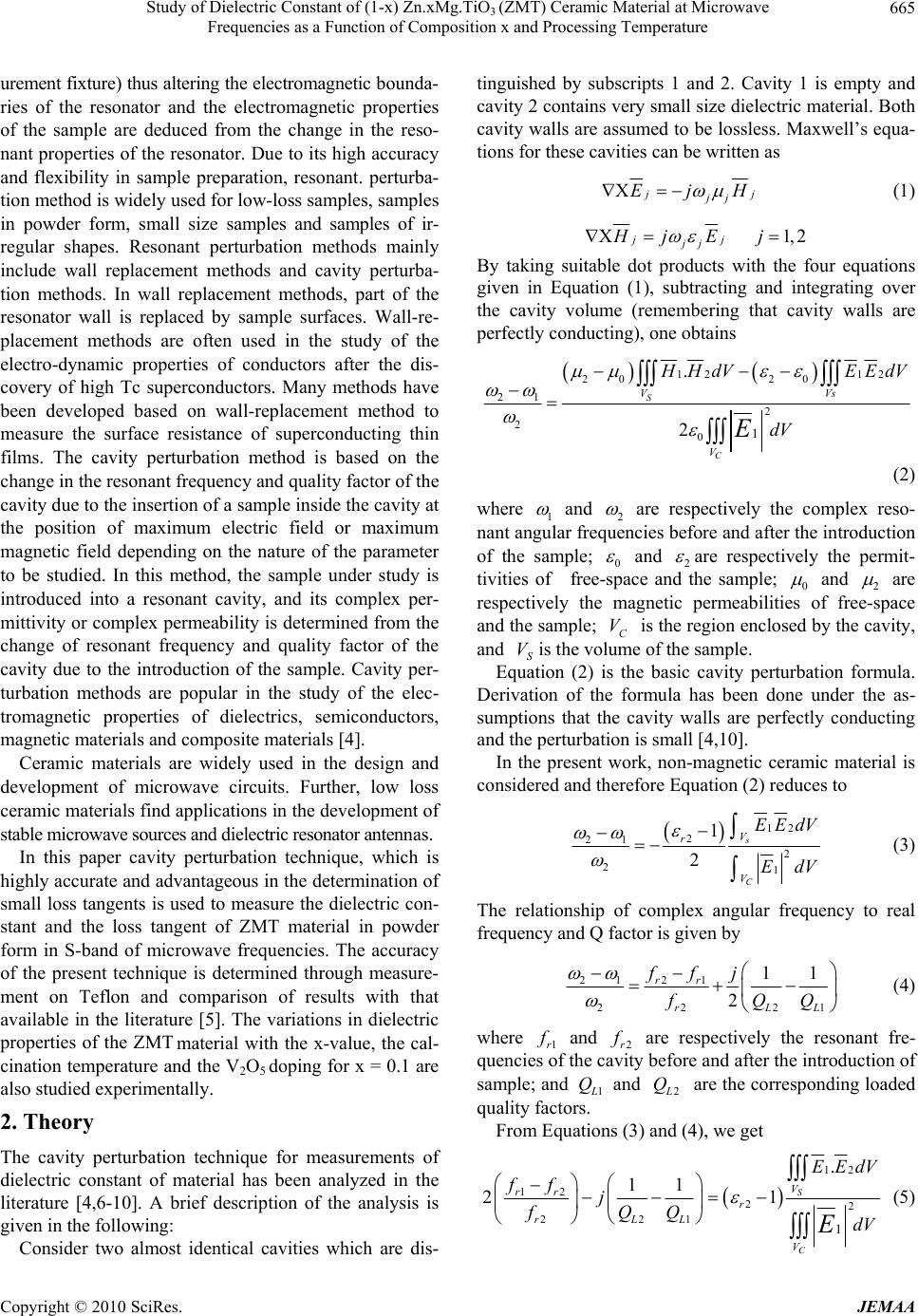 ![]() J. Electromagnetic Analysis & Applications, 2010, 2, 664-671 doi:10.4236/jemaa.2010.212087 Published Online December 2010 (http://www.SciRP.org/journal/jemaa) Copyright © 2010 SciRes. JEMAA Study of Dielectric Constant of (1-x) Zn.xMg.TiO3 (ZMT) Ceramic Material at Microwave Frequencies as a Function of Composition x and Processing Temperature Ravi Kumar Gangwar1, Surya Pal Singh1, Meenakshi Choudhary2, Nitish Kumar Singh2*, Devendra Kumar2, Om Parkash2 1Department of Electronics Engineering Institute of Technology, Banaras Hindu University, Varanasi, India; 2Department of Ceramic Engineering, Institute of Technology, Banaras Hindu University, Varanasi, India; *Affiliated address: Department of Physics, Udai Pratap Autonomous College,Varanasi, India. Email:ravi.gangwar.ece07@itbhu.ac.in Received October 9th, 2010; revised November 22nd, 2010; accepted November 29th, 2010. ABSTRACT In this paper measurement of real part of permittivity a nd loss tangent of (1-x) Zn.xMg.TiO3 (ZMT) material in powder form in S-band of microwave frequencies is presented and the associated accuracy estimated. This approach is based on the measurement of transmitted power from the cavity at and off resonance. Details of the design and fabrication of the rectangular cavity and the input and output coupling are given. The variation of dielectric properties of (1-x) Zn.xMg.TiO3 (ZMT) with x-value and calcination temperature (for x = 0.1) is presented. The effect of doping of V2O5 is also studied. The results of present work may provide useful design guidelines for development of microwave compo- nents including dielectric resonator antennas. Keywords: Cavity Perturbation Method, Permittivity, Loss Tangent And Ceramic Material 1. Introduction The measurement of electromagnetic properties of mate- rials at microwave frequencies is considered important since it provides the relaxation time, dipole moment in liquids, characteristics of materials for device applica- tions, microwave conductivity, effective mass in semi- conductors etc. [1]. The microwave measurement techniques for electro- magnetic characterization of materials generally are di- vided into two groups: Non-resonant methods and reso- nant methods. Non-resonant methods mainly involve reflection or transmission methods. The reflection meth- ods include open-circuit and short-circuit line methods. The transmission/reflection methods have many varieties, including free-space, coaxial line, waveguide, and planar structures such as microstrip and stripline. These meth- ods have achieved success in permittivity and permeabil- ity measurements of high- and medium-loss materials. However, non-resonant methods usually require large size samples and have strict requirements on sample preparation, and their measurement accuracy is not very high, especially for low-loss materials. Resonant meth- ods including resonant perturbation methods can provide higher accuracy as compared with non-resonant ones for these low loss materials [2]. The resonance techniques can be further divided into two categories: The first one is a resonance technique, basically supported by the di- electric sample itself. The sample acts as a dielectric resonator. Metal shields with different geometries are always introduced to prevent radiation loss. This type is called dielectric resonance technique. The second one is perturbation technique, where the resonance is supported by the metal walls of the cavity. The presence of small size sample in the cavity causes only a “perturbation” on the field distributions in the metal cavity [3]. In resonator methods, the sample under measurement is excited as a resonator in the measurement circuit, and its electro- magnetic properties are deduced from its resonant prop- erties. In resonant perturbation methods, the sample un- der measurement is introduced into a resonator (meas- ![]() Study of Dielectric Constant of (1-x) Zn.xMg.TiO(ZMT) Ceramic Material at Microwave 665 3 Frequencies as a Function of Composition x and Processing Temperature urement fixture) thus altering the electromagnetic bounda- ries of the resonator and the electromagnetic properties of the sample are deduced from the change in the reso- nant properties of the resonator. Due to its high accuracy and flexibility in sample preparation, resonant. perturba- tion method is widely used for low-loss samples, samples in powder form, small size samples and samples of ir- regular shapes. Resonant perturbation methods mainly include wall replacement methods and cavity perturba- tion methods. In wall replacement methods, part of the resonator wall is replaced by sample surfaces. Wall-re- placement methods are often used in the study of the electro-dynamic properties of conductors after the dis- covery of high Tc superconductors. Many methods have been developed based on wall-replacement method to measure the surface resistance of superconducting thin films. The cavity perturbation method is based on the change in the resonant frequency and quality factor of the cavity due to the insertion of a sample inside the cavity at the position of maximum electric field or maximum magnetic field depending on the nature of the parameter to be studied. In this method, the sample under study is introduced into a resonant cavity, and its complex per- mittivity or complex permeability is determined from the change of resonant frequency and quality factor of the cavity due to the introduction of the sample. Cavity per- turbation methods are popular in the study of the elec- tromagnetic properties of dielectrics, semiconductors, magnetic materials and composite materials [4]. Ceramic materials are widely used in the design and development of microwave circuits. Further, low loss ceramic materials find applications in the development of stable microwave sources and dielectric resonator antennas. In this paper cavity perturbation technique, which is highly accurate and advantageous in the determination