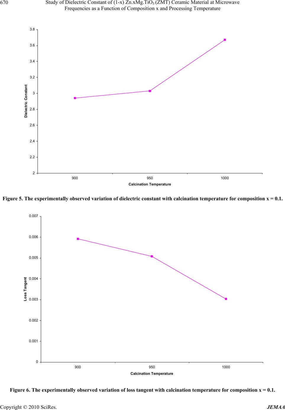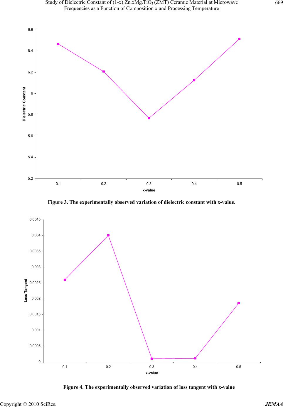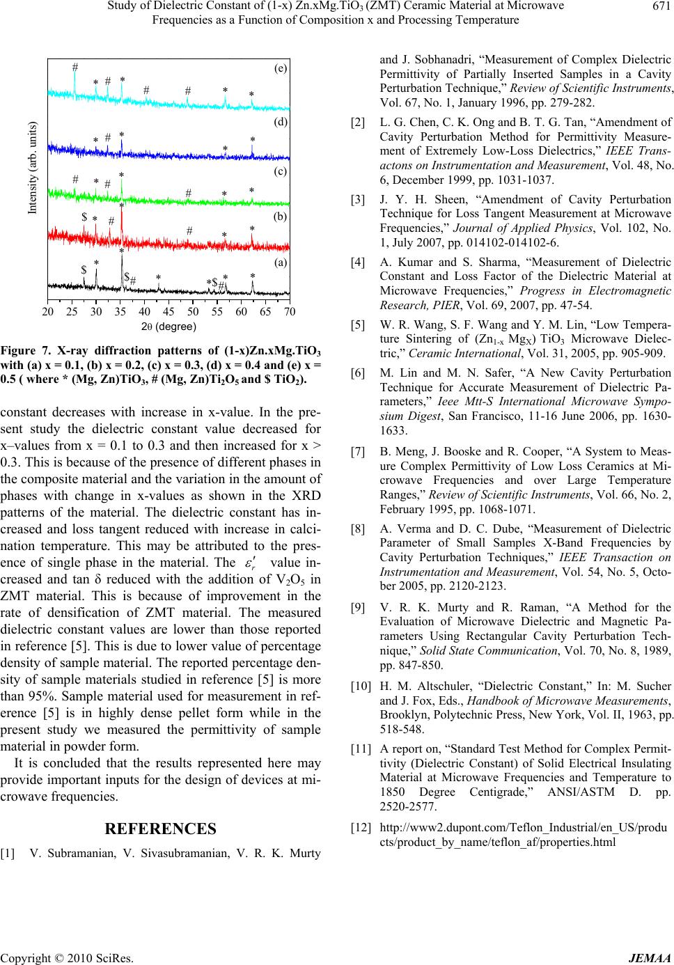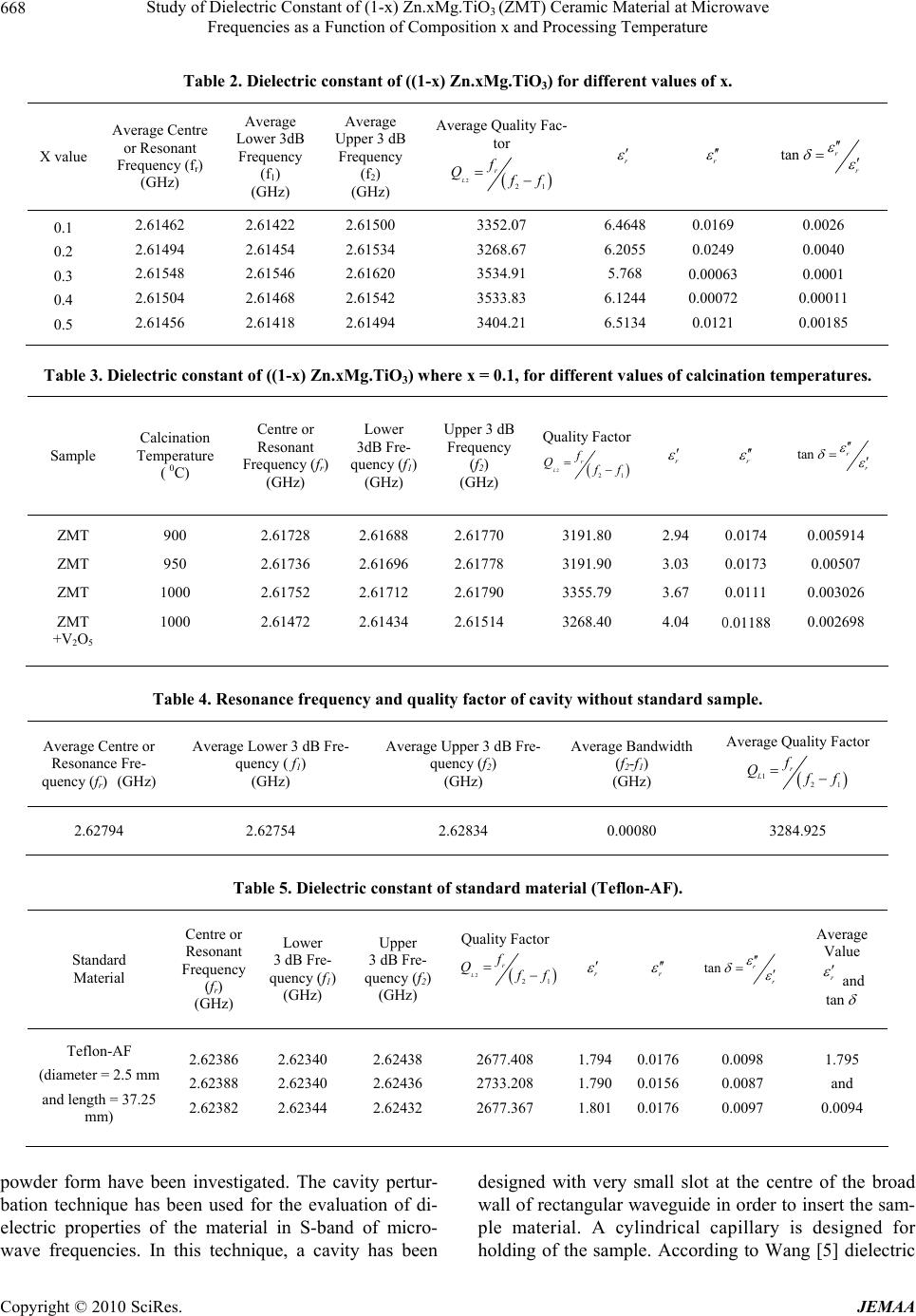 ![]() J. Electromagnetic Analysis & Applications, 2010, 2, 664-671 doi:10.4236/jemaa.2010.212087 Published Online December 2010 (http://www.SciRP.org/journal/jemaa) Copyright © 2010 SciRes. JEMAA Study of Dielectric Constant of (1-x) Zn.xMg.TiO3 (ZMT) Ceramic Material at Microwave Frequencies as a Function of Composition x and Processing Temperature Ravi Kumar Gangwar1, Surya Pal Singh1, Meenakshi Choudhary2, Nitish Kumar Singh2*, Devendra Kumar2, Om Parkash2 1Department of Electronics Engineering Institute of Technology, Banaras Hindu University, Varanasi, India; 2Department of Ceramic Engineering, Institute of Technology, Banaras Hindu University, Varanasi, India; *Affiliated address: Department of Physics, Udai Pratap Autonomous College,Varanasi, India. Email:ravi.gangwar.ece07@itbhu.ac.in Received October 9th, 2010; revised November 22nd, 2010; accepted November 29th, 2010. ABSTRACT In this paper measurement of real part of permittivity a nd loss tangent of (1-x) Zn.xMg.TiO3 (ZMT) material in powder form in S-band of microwave frequencies is presented and the associated accuracy estimated. This approach is based on the measurement of transmitted power from the cavity at and off resonance. Details of the design and fabrication of the rectangular cavity and the input and output coupling are given. The variation of dielectric properties of (1-x) Zn.xMg.TiO3 (ZMT) with x-value and calcination temperature (for x = 0.1) is presented. The effect of doping of V2O5 is also studied. The results of present work may provide useful design guidelines for development of microwave compo- nents including dielectric resonator antennas. Keywords: Cavity Perturbation Method, Permittivity, Loss Tangent And Ceramic Material 1. Introduction The measurement of electromagnetic properties of mate- rials at microwave frequencies is considered important since it provides the relaxation time, dipole moment in liquids, characteristics of materials for device applica- tions, microwave conductivity, effective mass in semi- conductors etc. [1]. The microwave measurement techniques for electro- magnetic characterization of materials generally are di- vided into two groups: Non-resonant methods and reso- nant methods. Non-resonant methods mainly involve reflection or transmission methods. The reflection meth- ods include open-circuit and short-circuit line methods. The transmission/reflection methods have many varieties, including free-space, coaxial line, waveguide, and planar structures such as microstrip and stripline. These meth- ods have achieved success in permittivity and permeabil- ity measurements of high- and medium-loss materials. However, non-resonant methods usually require large size samples and have strict requirements on sample preparation, and their measurement accuracy is not very high, especially for low-loss materials. Resonant meth- ods including resonant perturbation methods can provide higher accuracy as compared with non-resonant ones for these low loss materials [2]. The resonance techniques can be further divided into two categories: The first one is a resonance technique, basically supported by the di- electric sample itself. The sample acts as a dielectric resonator. Metal shields with different geometries are always introduced to prevent radiation loss. This type is called dielectric resonance technique. The second one is perturbation technique, where the resonance is supported by the metal walls of the cavity. The presence of small size sample in the cavity causes only a “perturbation” on the field distributions in the metal cavity [3]. In resonator methods, the sample under measurement is excited as a resonator in the measurement circuit, and its electro- magnetic properties are deduced from its resonant prop- erties. In resonant perturbation methods, the sample un- der measurement is introduced into a resonator (meas- ![]() Study of Dielectric Constant of (1-x) Zn.xMg.TiO(ZMT) Ceramic Material at Microwave 665 3 Frequencies as a Function of Composition x and Processing Temperature urement fixture) thus altering the electromagnetic bounda- ries of the resonator and the electromagnetic properties of the sample are deduced from the change in the reso- nant properties of the resonator. Due to its high accuracy and flexibility in sample preparation, resonant. perturba- tion method is widely used for low-loss samples, samples in powder form, small size samples and samples of ir- regular shapes. Resonant perturbation methods mainly include wall replacement methods and cavity perturba- tion methods. In wall replacement methods, part of the resonator wall is replaced by sample surfaces. Wall-re- placement methods are often used in the study of the electro-dynamic properties of conductors after the dis- covery of high Tc superconductors. Many methods have been developed based on wall-replacement method to measure the surface resistance of superconducting thin films. The cavity perturbation method is based on the change in the resonant frequency and quality factor of the cavity due to the insertion of a sample inside the cavity at the position of maximum electric field or maximum magnetic field depending on the nature of the parameter to be studied. In this method, the sample under study is introduced into a resonant cavity, and its complex per- mittivity or complex permeability is determined from the change of resonant frequency and quality factor of the cavity due to the introduction of the sample. Cavity per- turbation methods are popular in the study of the elec- tromagnetic properties of dielectrics, semiconductors, magnetic materials and composite materials [4]. Ceramic materials are widely used in the design and development of microwave circuits. Further, low loss ceramic materials find applications in the development of stable microwave sources and dielectric resonator antennas. In this paper cavity perturbation technique, which is highly accurate and advantageous in the determination