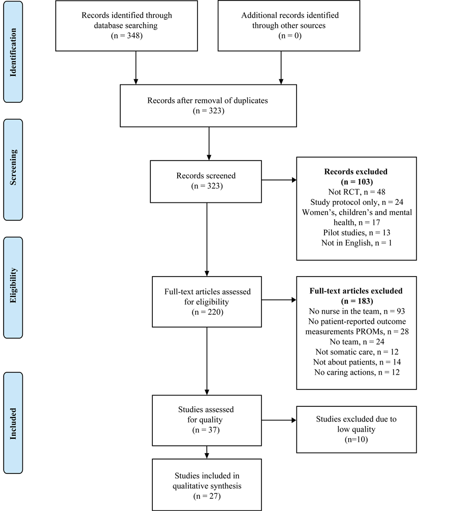 A study protocol inspired by the Preferred Reporting Items for Systematic reviews and Meta-Analyses (PRISMA) statement [23] was used to guide the review team through the data extraction process. All retrieved titles and abstracts were screened to determine eligibility. Studies were excluded based on: non-RCTs, only study protocols, only pilot studies or not in English. Full-text copies of 220 publications were assessed by the review team and 183 of these were excluded based on; no nurse in the team, or non-PROM, non-teamcare, non-somatic care, non-patient-directed, non-caring actions (Figure 1).
