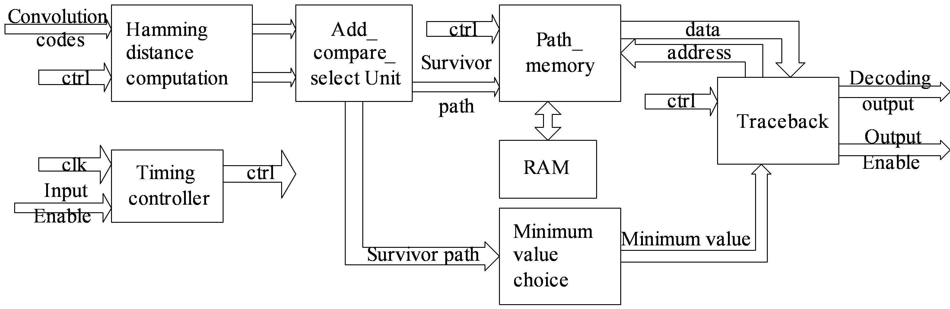 In this paper, hamming distance computation module, ACS module, survivor path storage and management module, trace-back module, timing controller module and minimum value choice module are included for the Viterbi decoder.