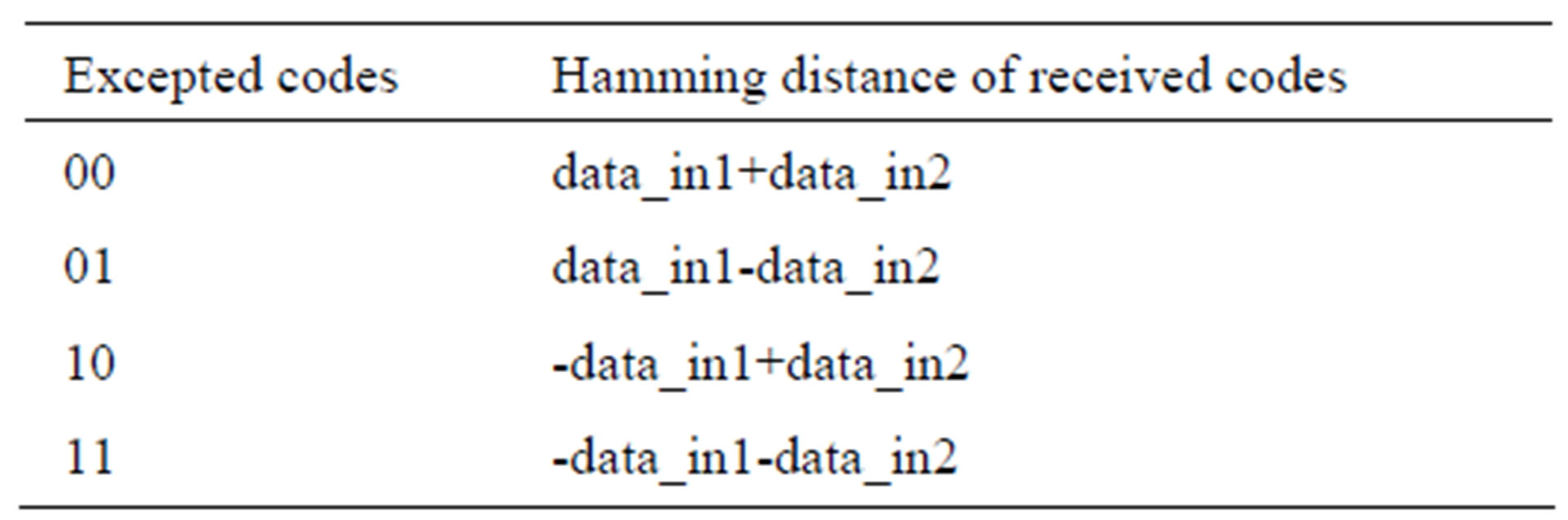 Table 1 gives the algorithm expressions for the hamming distance calculation of two received codes under the four possible values of the excepted codes, where data_in1 and data_in2 stand for the two-bit inputs in the trellis.