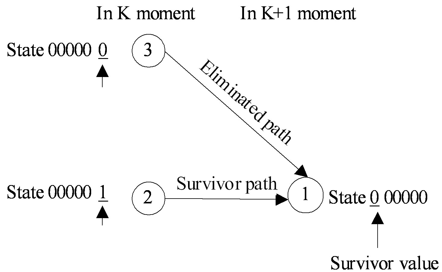 As shown in Figure 6, from the K moment to K + 1 moment, there are two optional paths to reach the state 000000 and they originate from the state 000000 and 000001. There is a difference between the lowest orders of the two states; the lowest order stands for the input bit of the Viterbi encoder five clock pulses before, the rest bits represent others from different moments. The top digit of the state 000000 is the survivor value at the K + 1 moment. It indicates the input bit in the K + 1 moment, in other words, also the decoded value. All these survivor values constitute the only survivor path. A counter with thirty six count cycles is designed for recording the trace-back time to determine the trace-back end. Survivor