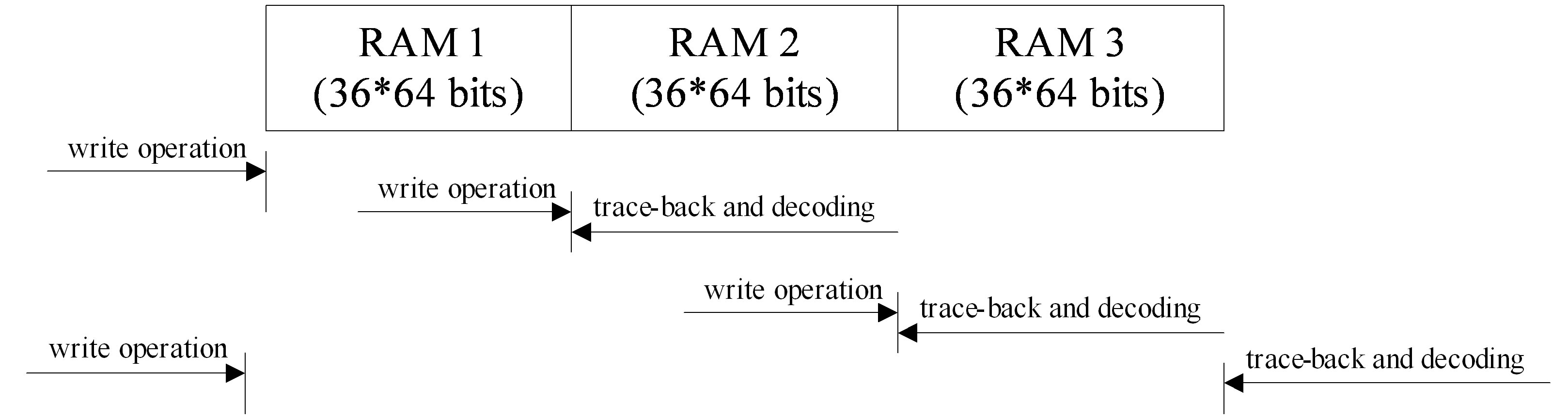 Step 2, the second RAM block begins to be written to survivor paths like the first one. After another decoding depth the second one begins to trace-back and the third one begins to be written to survivor paths.