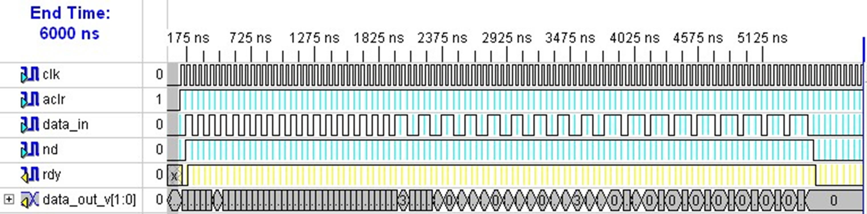 Figure 8. Simulation waveforms of convolutional decoder for OFDM-WLAN, 10-bit errors are corrected.