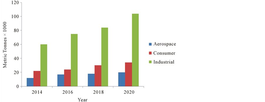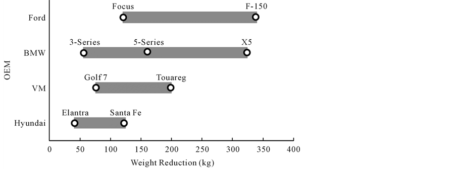 By the year 2020, automotive market is expected to grow to 100 million new vehicles per year. “Lightweighting” in transport industry has become a major theme of research in recent years; the main motives being anticipated fuel savings and meeting stricter environmental legislations in various jurisdictions such as Europe, North America, and Asia. In order to meet the CO2 emission targets set for Europe in 2020, i.e., 95 g CO2/km, a 200 - 300 kg weight reduction of the vehicle is required [19] . North American automotive OEMs are striving hard to reduce their overall fleet weight in significant numbers for both luxury and standard cars; in fact some companies have set an ambitious target of reducing up to 350 kg (about 20%) of car weight by 2020 [20] as shown in Figure 6.