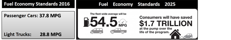 Figure 2. Current and projected trends of fuel efficiency standards in USA; data source [5] [6] .