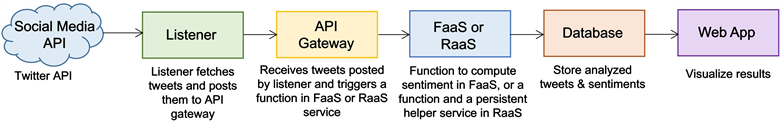 To evaluate the proposed approach, we developed a reference application for sentiment analysis of social media posts such as tweets from Twitter as shown in Figure 4. A custom listener component fetches tweets using the Twitter API and posts the tweets to an API gateway endpoint which triggers a function in a serverless offering to compute sentiment of each tweet. The computed sentiments are stored in a database. A web application presents the sentiment analysis results.