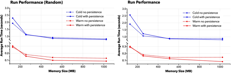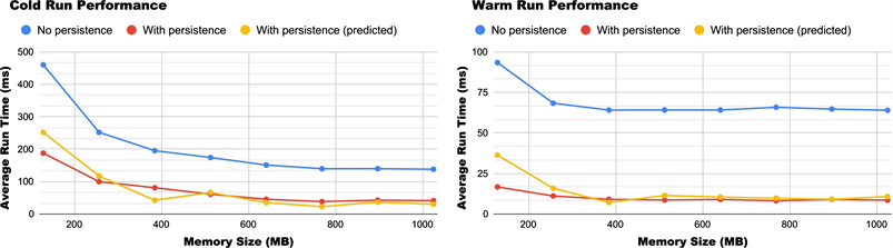 We evaluated the cold run and warm run performance of the functions in the FaaS and RaaS versions. The cold runs measure the behavior of functions when provisioned for the very first time. We took a number of measurements of function run times by varying the container memory size. Figure 5 shows the cold and warm run performance for FaaS and RaaS versions. For reference, we also show the predicted performance with persistence, which is estimated using the model described in Section 3.3. As seen from the cold and warm run charts, the predicted performance closely matches the actual performance.