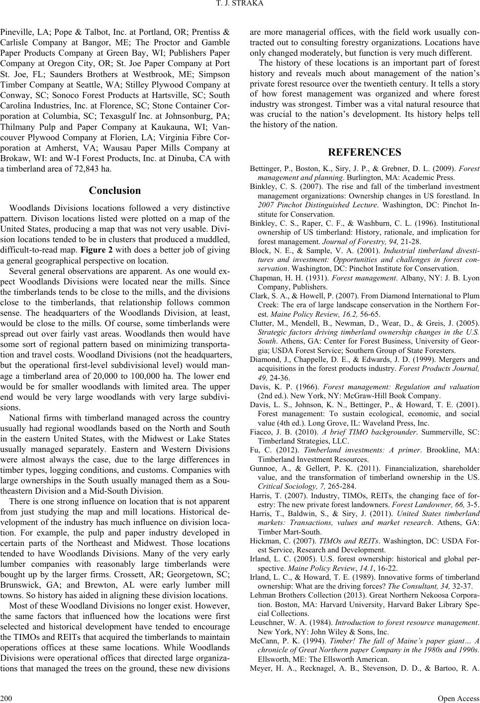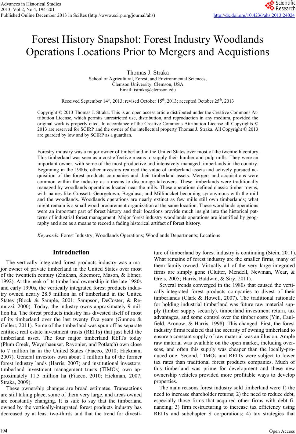 Advances in Historical Studies 2013. Vol.2, No.4, 194-201 Published Online December 2013 in SciRes (http://www.scirp.org/journal/ahs) http://dx.doi.org/10.4236/ahs.2013.24024 Open Access 194 Forest History Snapshot: Forest Industry Woodlands Operations Locations Prior to Mergers and Acquistions Thomas J. Straka School of Agricult ural, Forest, an d E nv i ronmental Sciences, Clemson University, Clemson, USA Email: tstraka@clemson.edu Received September 14th, 2013; revised October 15th, 2013; accepted October 25th, 2013 Copyright © 2013 Thomas J. Straka. This is an open access article distributed under the Creative Commons At- tribution License, which permits unrestricted use, distribution, and reproduction in any medium, provided the original work is properly cited. In accordance of the Creative Commons Attribution License all Copyrights © 2013 are reserved for SCIRP and the owner of the intellectual property Thomas J. Straka. All Copyright © 2013 are guarded by low and by SCIRP as a guardian. Forestry industry was a major owner of timberland in the United States over most of the twentieth century. This timberland was seen as a cost-effective means to supply their lumber and pulp mills. They were an important owner, with some of the most productive and intensively-managed timberlands in the country. Beginning in the 1980s, other investors realized the value of timberland assets and actively pursued ac- quisition of the forest products companies and their timberland assets. Mergers and acquisitions were common within the industry as a means to discourage takeovers. These timberlands were traditionally managed by woodlands operations located near the mills. These operations defined classic timber towns, with names like Crossett, Georgetown, Bogalusa, and Millinocket becoming synonymous with the mill and the woodlands. Woodlands operations are nearly extinct as few mills still own timberlands; what might remain is a small wood procurement organization at the same location. These woodlands operations were an important part of forest history and their locations provide much insight into the historical pat- terns of industrial forest management. Major forest industry woodlands operations are identified by geog- raphy and size as a means to record a fading historical artifact of forest history. Keywords: Forest Industry; Woodlands Operations; Woodlands Departments; Locations Introduction The vertically-integrated forest products industry was a ma- jor owner of private timberland in the United States over most of the twentieth century (Zinkhan, Sizemore, Mason, & Ebner, 1992). At the peak of its timberland ownership in the late 1980s and early 1990s, the vertically in tegrated forest products indus- try owned nearly 28.5 million ha of timberland in the United States (Block & Sample, 2001; Sampson, DeCoster, & Re- muzzi, 2000). Today, the industry owns approximately 9 mil- lion ha. The forest products industry has divested itself of most of its timberland over the last twenty five years (Gunnoe & Gellert, 2011). Some of the timberland was spun off as separate entities; real estate investment trusts (REITs) that just held the timberland asset. The four major timberland REITs today (Plum Creek, Weyerhaeuser, Rayonier, and Potlatch) own close to 7 million ha in the United States (Fiacco, 2010; Hickman, 2007). General investors own about 1 million ha of the former forest industry lands (Harris, 2007) and institutional investors, timberland investment management trusts (TIMOs) own ap- proximately 11.5 million ha (Fiacco, 2010; Hickman, 2007; Straka, 2009). These ownership changes are broad estimates. Transactions are still taking place, some of them very large, and areas owned are constantly changing. It is safe to say that the timberland owned by the vertically-integrated forest products industry has decreased by at least two-thirds and that the trend for divesti- ture of timberland by forest industry is continuing (Stein, 2011). What remains of forest industry are the smaller firms, many of them family-owned. Virtually all of the very large integrated firms are simply gone (Clutter, Mendell, Newman, Wear, & Greis, 2005; Harris, Baldwin, & Siry, 2011). Several trends converged in the 1980s that caused the verti- cally-integrated forest products companies to divest of their timberlands (Clark & Howell, 2007). The traditional rationale for holding industrial timberland was future raw material sup- ply (timber supply security), timberland investment return, tax advantages, and some control over the timber costs (Yin, Caul- field, Aronow, & Harris, 1998). This changed. First, the forest industry firms realized that the security of owning timberland to ensure a constant supply of raw material was an illusion. Ample raw material was av ailable on the open market, including over- seas, and often this supply was cheaper than the locally-pro- duced one. Second, TIMOs and REITs were subject to lower tax rates than traditional forest products companies. Much of this timberland was prime for development and these new ownership vehicles provided more profitable ways to develop properties. The main reasons forest industry sold timberland were 1) the need to increase shareholder returns; 2) the need to reduce debt, especially those firms that acquired other firms with debt fi- nancing; 3) firm restructuring to increase tax efficiency using REITs and subchapter S corporations; 4) tax strategies that