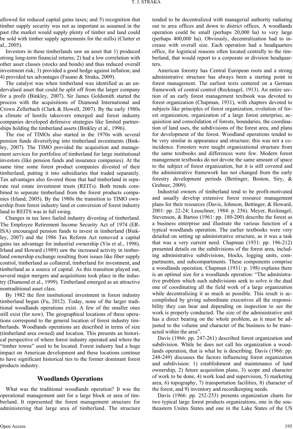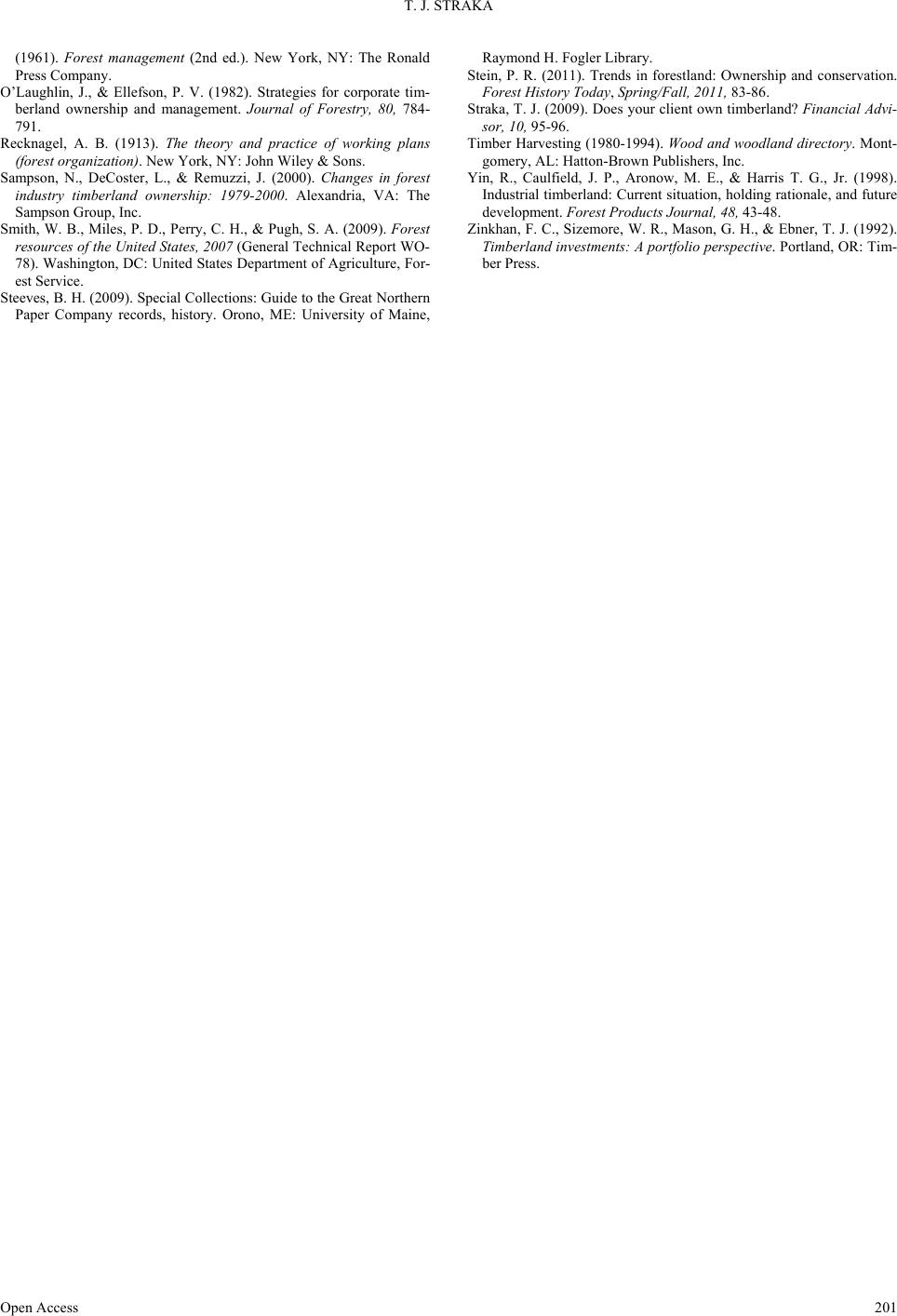 T. J. STRAKA Open Access 201 (1961). Forest management (2nd ed.). New York, NY: The Ronald Press Company. O’Laughlin, J., & Ellefson, P. V. (1982). Strategies for corporate tim- berland ownership and management. Journal of Forestry, 80, 784- 791. Recknagel, A. B. (1913). The theory and practice of working plans (forest organizati on). New York, NY: John Wiley & Sons. Sampson, N., DeCoster, L., & Remuzzi, J. (2000). Changes in forest industry timberland ownership: 1979-2000. Alexandria, VA: The Sampson Group, Inc. Smith, W. B., Miles, P. D., Perry, C. H., & Pugh, S. A. (2009). Forest resources of the United States, 2007 (General Technical Report WO- 78). Washington, DC: United States Department of Agriculture, For- est Service. Steeves, B. H. (2009). Special Collections: Guide to the Great Northern Paper Company records, history. Orono, ME: University of Maine, Raymond H. Fogler Library. Stein, P. R. (2011). Trends in forestland: Ownership and conservation. Forest History Today, Spring/Fall, 2011, 83-86. Straka, T. J. (2009). Does your client own timberland? Financial Advi- sor, 10, 95-96. Timber Harvesting (1980-1994). Wood and woodland directory. Mont- gomery, AL: Hatton-Brown Publishers, Inc. Yin, R., Caulfield, J. P., Aronow, M. E., & Harris T. G., Jr. (1998). Industrial timberland: Current situation, holding rationale, and future development. Forest Products Journal, 48, 43-48. Zinkhan, F. C., Sizemore, W. R., Mason, G. H., & Ebner, T. J. (1992). Timberland investments: A portfolio perspective. Portland, OR: Tim- ber Press.