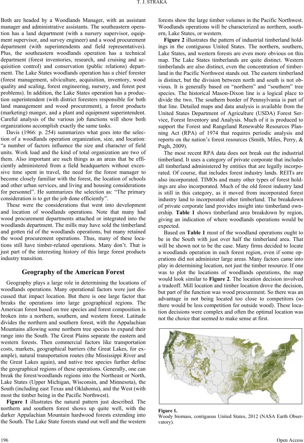 T. J. STRAKA Both are headed by a Woodlands Manager, with an assistant manager and administrative assistants. The southeastern opera- tion has a land department (with a nursery supervisor, equip- ment supervisor, and survey engineer) and a wood procurement department (with superintendents and field representatives). Plus, the southeastern woodlands operation has a technical department (forest inventories, research, and cruising and ac- quisition control) and conservation (public relations) depart- ment. The Lake States woodlands operation has a chief forester (forest management, silviculture, acquisition, inventory, wood quality and scaling, forest engineering, nursery, and forest pest problems). In addition, the Lake States operation has a produc- tion superintendent (with district foresters responsible for both land management and wood procurement), a forest products (marketing) manger, and a plant and equipment superintendent. Careful analysis of the various job functions will show both organizations accomplish exactly the same tasks. Davis (1966: p. 254) summarizes what goes into the selec- tion of a woodlands operation organization, size, and location: “a number of factors influence the size and character of field units. Work load and the kind of total organization are two of them. Also important are such things as an areas that be effi- ciently administered from a field headquarters without exces- sive time spent in travel, the need for the forest manager to become closely familiar with the forest, the location of schools and other urban services, and living and housing considerations for personnel”. He summarizes the selection as: “The primary consideration is to get the job done efficiently”. These were the considerations that went into development and location of woodlands operations. Note that many had wood procurement departments attached or integrated into the woodlands department. The mills may have sold the timberland and gotten rid of the woodlands operations, but many retained the wood procurement operations. Thus, many of these loca- tions still have timber-related operations. Many don’t. That is just part of the interesting history of this large forest products industry transition. Geography of the American Forest Geography plays a large role in determining the locations of woodlands operations. Many operational factors were just dis- cussed that impact location. But there is one large factor that breaks the operations into large geographical regions. The American forest based on tree species and forest composition is broken into a northern, southern, and western forest. Latitude divides the northern and southern forest, with the Appalachian Mountains allowing some northern tree species to expand their range into the South. The Great Plains separate the eastern and western forests. Then commercial factors like transportation costs, markets, geographical barriers (the Great Lakes, for ex- ample), natural transportation routes (the Mississippi River and the Great Lakes again), and native tree species further define the geographical regions of these operations. Generally, one can break the forest/woodlands regions into the Northeast or North, Lake States (Upper Michigan, Wisconsin, and Minnesota), the South (including east Texas and Oklahoma), and the West (with most the timber being in the Pacific Northwest). Figure 1 illustrates the natural pattern just described. The northern and southern forest shows up quite well, with the darker Appalachian Mountain hardwood forests extending into the South. The Lake State forests stand out well and the western forests show the large timber volumes i n the Pacific Northwest. Woodlands operations will be characterized as northern, south- ern, Lake States, or western. Figure 2 illustrates the pattern of industrial timberland hold- ings in the contiguous United States. The northern, southern, Lake States, and western forests are even more obvious on this map. The Lake States timberlands are quite distinct. Western timberlands are also distinct, even the concentration of timber- land in the Pacific Northwest stands out. The eastern timberland is distinct, but the division between north and south is not ob- vious. It is generally based on “northern” and “southern” tree species. The historical Mason-Dixon line is a logical place to divide the two. The southern border of Pennsylvania is part of that line. Detailed maps and data analysis is available from the United States Department of Agriculture (USDA) Forest Ser- vice, Forest Inventory and Analysis. Much of it is produced to support the Forest and Rangeland Renewable Resources Plan- ning Act (RPA) of 1974 that requires periodic analysis and reports on the nation’s forest resources (Smith, Miles, Perry, & Pugh, 2009). The most recent RPA data does not break out the industrial timberland. It uses a category of private corporate that includes all timberland administered by entities that are legally incorpo- rated. Of course, that includes forest industry lands. REITs are also incorporated. TIMOs and many other types of forest hold- ings are also incorporated. Much of the old forest industry land is still in this category, as it moved from incorporated forest industry land to incorporated other timberland. The breakdown of private corporate land provides insight into timberland own- ership. Table 1 shows timberland area breakdown by region, giving an indication of where woodlands operations would be expected. Based on Table 1 most of the woodland operations ought to be in the South with just over half the timberland area. That will be shown not to be the case. Many firms decided to locate a woodlands operation in each forest region, even if some op- erations did not administer large areas. Many factors came into play in determining location, not just the timber resource. If one was to plot the locations of woodlands operations, the map would look similar to Figure 2. The 