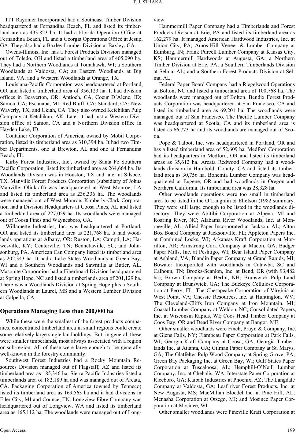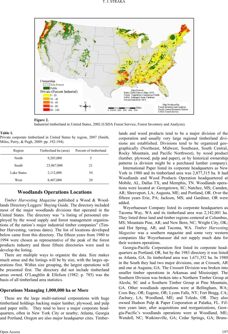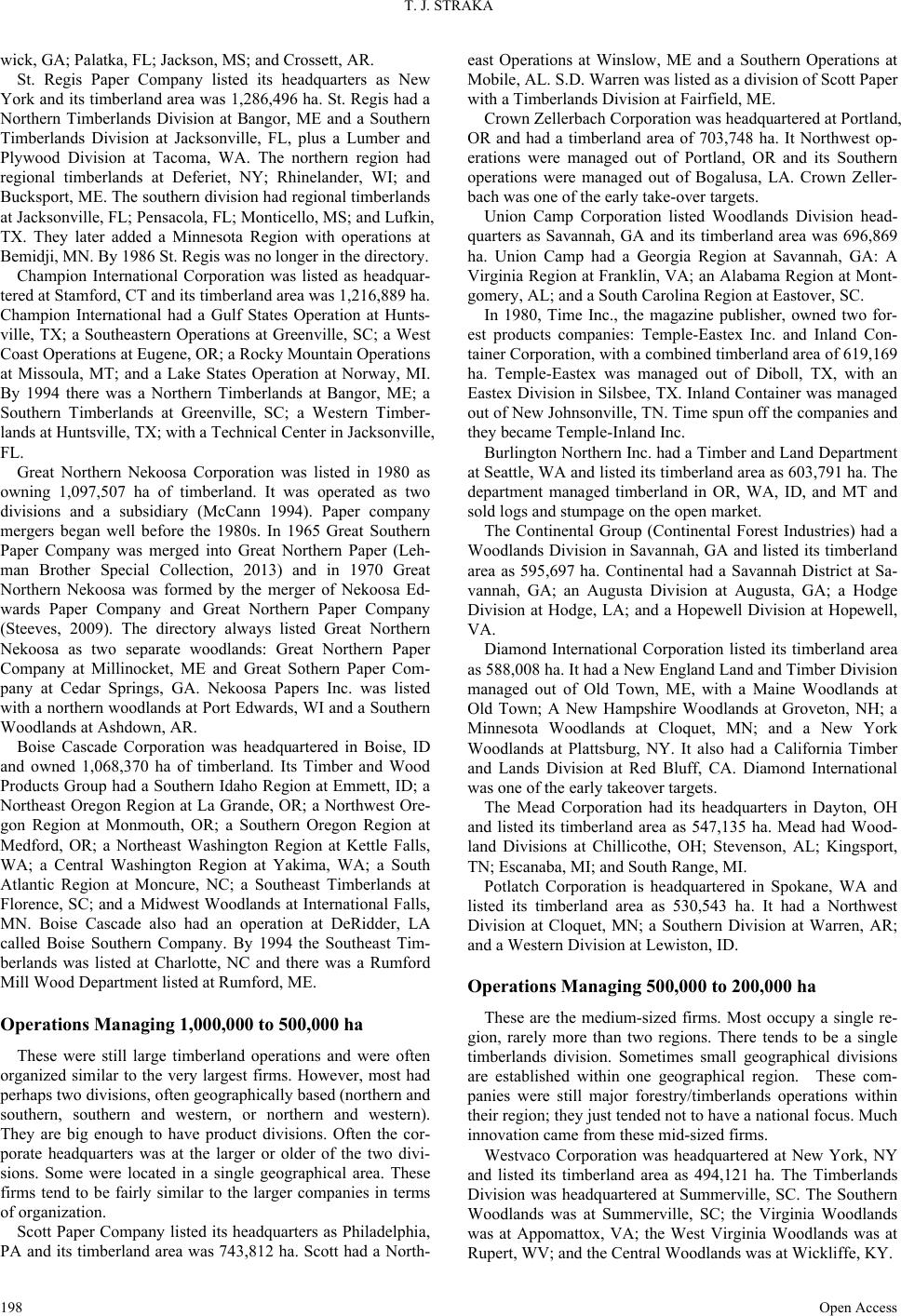 T. J. STRAKA Open Access 197 Figure 2. Industrial timberland in United States, 2002 (USDA Forest Service, Forest Inventory and Analy s is). Table 1. Private corporate timberland in United States by region, 2007 (Smith, Miles, Perry, & Pugh, 2009: pp. 192-194). Region Timberla nd ha (area) Percent of tim berland North 9,283,000 5 South 23,067,000 21 Lake States 2,112,000 54 West 8,487,000 20 Woodlands Operations Locations Timber Harvesting Magazine published a Wood & Wood- lands Directory/Loggers’ Buying Guide. The directory included most of the major woodlands divisions that operated in the United States. The directory was “a listing of personnel em- ployed by the wood supply and forest management organiza- tions of the nation’s major industrial timber companies” (Tim- ber Harvesting, various dates). The list of locations developed below came from this directory. The fifteen years from 1980 to 1994 were chosen as representative of the peak of the forest products industry and those fifteen directories were used to develop the listing. There are multiple ways to organize the data. Size makes much sense and the listings will be by size, with the larges op- erations first. Within size grouping, the largest operations will be presented first. The directory did not include timberland areas owned. O’Laughlin & Ellefson (1982: p. 785) was the basis of all timberland area statistics. Operations Man agi n g 1, 0 00 ,000 ha or More These are the large multi-national corporations with huge timberland holdings backing major lumber, plywood, and pulp and paper mills. They tend to have a major corporate head- quarters, often in New York City or nearby; Atlanta, Georgia and Portland, Oregon are also major headquarter cites. Timber- lands and wood products tend to be a major division of the corporation and usually very large regional timberland divi- sions are established. Divisions tend to be organized geo- graphically (Northeast, Midwest, Southeast, South Central, Rocky Mountain, and Pacific Northwest), by wood product (lumber, plywood, pulp and paper), or by historical ownership patterns (a division might be a purchased lumber company). International Paper listed its corporate headquarters as New York in 1980 and its timberland area was 2,877,315 ha. It had Woodlands and Wood Products Operation headquartered at Mobile, AL, Dallas TX, and Memphis, TN. Woodlands opera- tions were located at: Georgetown, SC; Natchez, MS; Camden, AR; Shreveport, LA; Augusta, ME; and Portland, OR. Over the fifteen years Erie, PA; Jackson, MS; and Gardiner, OR were added. Weyerhaeuser Company listed its corporate headquarters as Tacoma Way, WA and its timberland area was 2,142,001 ha. They listed three land and timber regions centered at Columbus, MS; Mountain Pine, AR; and New Bern, NC; Wright City, OK; and Hot Spring, AR; and Tacoma, WA. Timber Harvesting Magazine was a southern magazine and some very western companies like Weyerhaeuser did not supply much data for their western operations. Georgia-Pacific Corporation first listed its corporate head- quarters as Portland, OR, but by the 1983 directory it was listed as Atlanta, GA. Its timberland area was 1,671,352 ha. In 1980 in the South they had two major divisions, one at Crossett, AR and one at Augusta, GA. The Crossett Division was broken into smaller timber operations in Arkansas and Mississippi. The Southern Division was broken into a Northern Timber Group at Alcolu, SC and a Southern Timber Group at Pine Mountain, GA. Other woodlands operations were at Bellingham, WA; Coos Bay, OR; Eugene, OR; Lyons Falls, NY; Fort Bragg, CA; Zachary, LA; Woodland, ME; and Toledo, OR. They also owned Hudson Pulp & Paper Corporation at Palatka, FL. Fif- teen years later, after acquisitions and reorganizations, Geor- gia-Pacific’s woodlands operations were at Woodland, ME; Wendell, NC; Watkinsville, GA; Cedar Springs, GA; Bruns-