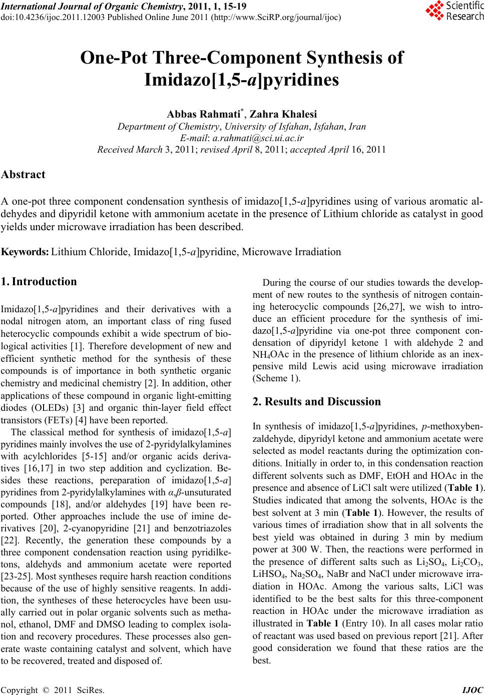 International Journal of Organic Chemistry, 2011, 1, 15-19 doi:10.4236/ijoc.2011.12003 Published Online June 2011 (http://www.SciRP.org/journal/ijoc) Copyright © 2011 SciRes. IJOC One-Pot Three-Component Synthesis of Imidazo[1,5-a]pyridines Abbas Rahmati*, Zahra Khalesi Department of Chemistry, University of Isfahan, Isfahan, Iran E-mail: a.rahmati@sci.ui.ac.ir Received March 3, 2011; revised April 8, 2 011; accepted April 16, 2011 Abstract A one-pot three component condensation synthesis of imidazo[1,5-a]pyridines using of various aromatic al- dehydes and dipyridil ketone with ammonium acetate in the presence of Lithium chloride as catalyst in good yields under microwave irradiation has been described. Keywords: Lithium Chloride, Imidazo[1,5-a]pyridine, Microwave Irradiation 1. Introduction Imidazo[1,5-a]pyridines and their derivatives with a nodal nitrogen atom, an important class of ring fused heterocyclic compounds exhibit a wide spectrum of bio- logical activities [1]. Therefore development of new and efficient synthetic method for the synthesis of these compounds is of importance in both synthetic organic chemistry and medicinal chemistry [2 ]. In addition, oth er applications of these compound in organic light-emitting diodes (OLEDs) [3] and organic thin-layer field effect transistors (FETs) [4] have been reported. The classical method for synthesis of imidazo[1,5-a] pyridines mainly involves the use of 2-pyr i dyla l kylamin e s with acylchlorides [5-15] and/or organic acids deriva- tives [16,17] in two step addition and cyclization. Be- sides these reactions, pereparation of imidazo[1,5-a] pyridines from 2-pyridylalkylamines with α,β-unsuturated compounds [18], and/or aldehydes [19] have been re- ported. Other approaches include the use of imine de- rivatives [20], 2-cyanopyridine [21] and benzotriazoles [22]. Recently, the generation these compounds by a three component condensation reaction using pyridilke- tons, aldehyds and ammonium acetate were reported [23-25]. Most syntheses require harsh reaction cond itions because of the use of highly sensitive reagents. In addi- tion, the syntheses of these heterocycles have been usu- ally carried out in polar organic solvents such as metha- nol, ethanol, DMF and DMSO leading to complex isola- tion and recovery procedures. These processes also gen- erate waste containing catalyst and solvent, which have to be recovered, treated and disposed of. During the course of our studies towards the develop- ment of new routes to the synthesis of nitrogen contain- ing heterocyclic compounds [26,27], we wish to intro- duce an efficient procedure for the synthesis of imi- dazo[1,5-a]pyridine via one-pot three component con- densation of dipyridyl ketone 1 with aldehyde 2 and NH4OAc in the presence of lithium chloride as an inex- pensive mild Lewis acid using microwave irradiation (Scheme 1). 2. Results and Discussion In synthesis of imidazo[1,5-a]pyridines, p-methoxyben- zaldehyde, dipyridyl ketone and ammonium acetate were selected as model reactants during the optimization con- ditions. Initially in order to, in this condensation reaction different solvents such as DMF, EtOH and HOAc in the presence and absen ce of LiCl salt were utili zed ( Ta bl e 1). Studies indicated that among the solvents, HOAc is the best solvent at 3 min (Table 1). However, the results of various times of irradiation show that in all solvents the best yield was obtained in during 3 min by medium power at 300 W. Then, the reactions were performed in the presence of different salts such as Li2SO4, Li2CO3, LiHSO4, Na2SO4, NaBr and NaCl under micr owave irra- diation in HOAc. Among the various salts, LiCl was identified to be the best salts for this three-component reaction in HOAc under the microwave irradiation as illustrated in Tab le 1 (Entry 10). In all cases molar ratio of reactant was used based on previous report [21]. After good consideration we found that these ratios are the best.