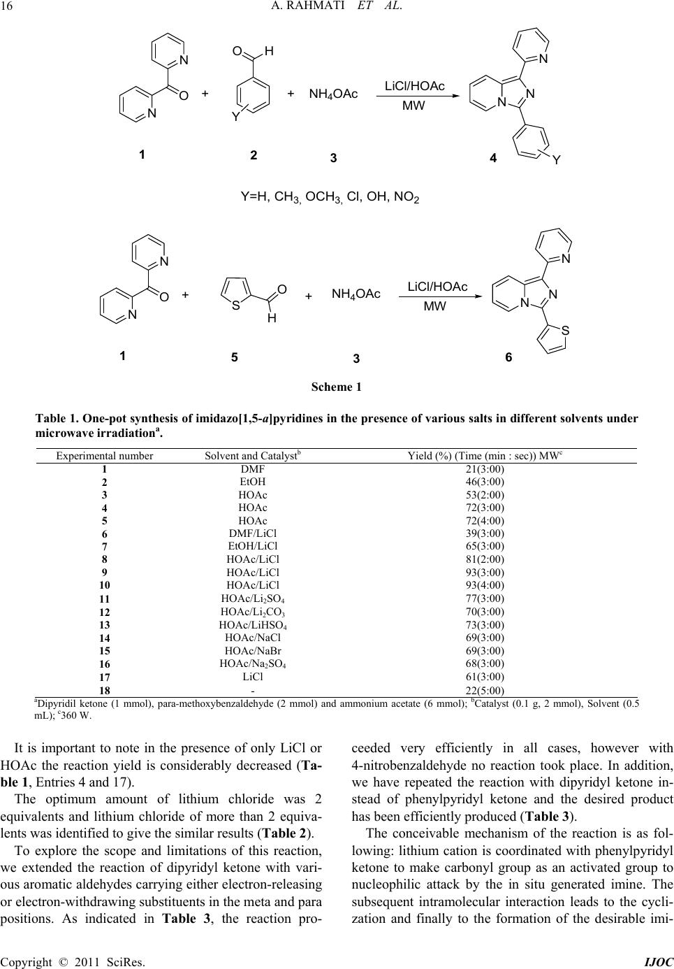 A. RAHMATI ET AL. 16 N O NO H Y ++ 12 NH 4 OAc NN N Y 34 LiCl/HOAc Y=H , CH 3, OCH3, Cl, OH, NO2 N O N ++ 15 NH 4 OAc NN N 3 LiCl/HOA c SO HS 6 MW MW Scheme 1 Table 1. One-pot synthesis of imidazo[1,5-a]pyridines in the presence of various salts in different solvents under microwave irradiationa. Experimental number Solvent and Catalystb Yield (%) (Time (m in : sec)) MWc 1 DMF 21(3:00) 2 EtOH 46(3:00) 3 HOAc 53(2:00) 4 HOAc 72(3:00) 5 HOAc 72(4:00) 6 DMF/LiCl 39(3:00) 7 EtOH/LiCl 65(3:00) 8 HOAc/LiCl 81(2:00) 9 HOAc/LiCl 93(3:00) 10 HOAc/LiCl 93(4:00) 11 HOAc/Li2SO4 77(3:00) 12 HOAc/Li2CO3 70(3:00) 13 HOAc/LiHSO4 73(3:00) 14 HOAc/NaCl 69(3:00) 15 HOAc/NaBr 69(3:00) 16 HOAc/Na2SO4 68(3:00) 17 LiCl 61(3:00) 18 - 22(5:00) aDipyridil ketone (1 mmol), para-methoxybenzaldehyde (2 mmol) and ammonium acetate (6 mmol); bCatalyst (0.1 g, 2 mmol), Solvent (0.5 mL); c360 W. It is important to note in the presence of only LiCl or HOAc the reaction yield is considerably decreased (Ta- ble 1, Entries 4 and 17). The optimum amount of lithium chloride was 2 equivalents and lithium chloride of more than 2 equiva- lents was identified to give the similar results (Table 2). To explore the scope and limitations of this reaction, we extended the reaction of dipyridyl ketone with vari- ous aromatic aldehydes carrying either electron-releasing or electron-withdrawing subs tituen ts in the meta and para positions. As indicated in Table 3, the reaction pro- ceeded very efficiently in all cases, however with 4-nitrobenzaldehyde no reaction took place. In addition, we have repeated the reaction with dipyridyl ketone in- stead of phenylpyridyl ketone and the desired product has been efficiently produced (Table 3). The conceivable mechanism of the reaction is as fol- lowing: lithium cation is coordinated with phenylpyridyl ketone to make carbonyl group as an activated group to nucleophilic attack by the in situ generated imine. The subsequent intramolecular interaction leads to the cycli- zation and finally to the formation of the desirable imi- Copyright © 2011 SciRes. IJOC