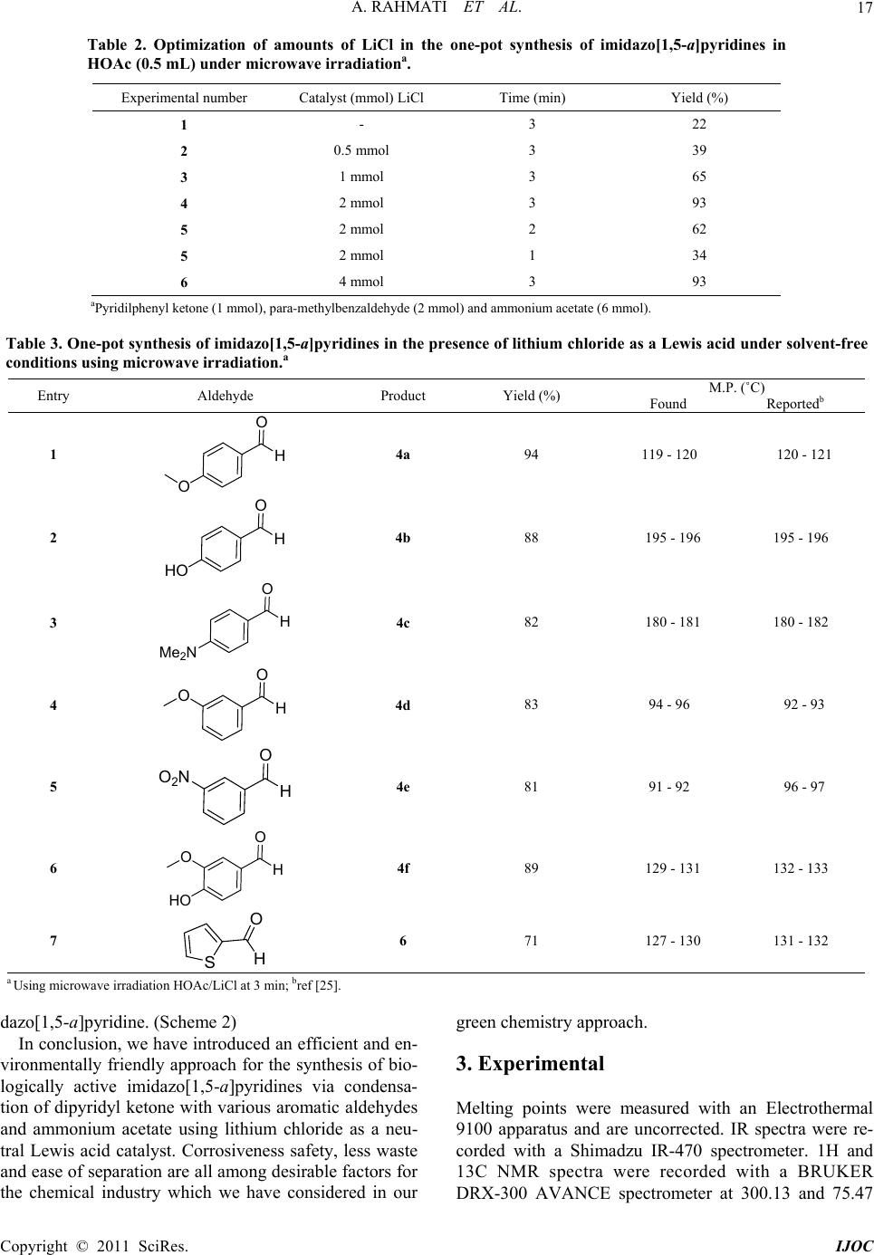 A. RAHMATI ET AL.17 Table 2. Optimization of amounts of LiCl in the one-pot synthesis of imidazo[1,5-a]pyridines in HOAc (0.5 mL) under microwave irradiationa. Experimental number Catalyst (mmol) LiCl Time (min) Yield (%) 1 - 3 22 2 0.5 mmol 3 39 3 1 mmol 3 65 4 2 mmol 3 93 5 2 mmol 2 62 5 2 mmol 1 34 6 4 mmol 3 93 aPyridilphenyl ketone (1 mmol), para-methylbenzaldehyde (2 mmol) and ammonium acetate (6 mmol). Table 3. One-pot synthesis of imidazo[1,5-a]pyridines in the presence of lithium chloride as a Lewis acid under solvent-free conditions using microwave irradiation.a Entry Aldehyde Product Yield (%) M.P. (˚C) Found Reportedb 1 O H O 4a 94 119 - 120 120 - 121 2 O H HO 4b 88 195 - 196 195 - 196 3 O H Me 2 N 4c 82 180 - 181 180 - 182 4 O H O 4d 83 94 - 96 92 - 93 5 O H O 2 N 4e 81 91 - 92 96 - 97 6 O H O HO 4f 89 129 - 131 132 - 133 7 S O H 6 71 127 - 130 131 - 132 a Using microwave irradiation HOAc/LiCl at 3 min; bref [25] . dazo[1,5-a]pyridine. (Scheme 2) In conclusion, we have introduced an efficient and en- vironmentally friendly approach for the synthesis of bio- logically active imidazo[1,5-a]pyridines via condensa- tion of dipyridyl ketone with various aromatic aldehydes and ammonium acetate using lithium chloride as a neu- tral Lewis acid catalyst. Corrosiveness safety, less waste and ease of separation are all among desirable factors for the chemical industry which we have considered in our green chemistry approach. 3. Experimental Melting points were measured with an Electrothermal 9100 apparatus and are uncorrected. IR spectra were re- corded with a Shimadzu IR-470 spectrometer. 1H and 13C NMR spectra were recorded with a BRUKER DRX-300 AVANCE spectrometer at 300.13 and 75.47 Copyright © 2011 SciRes. IJOC