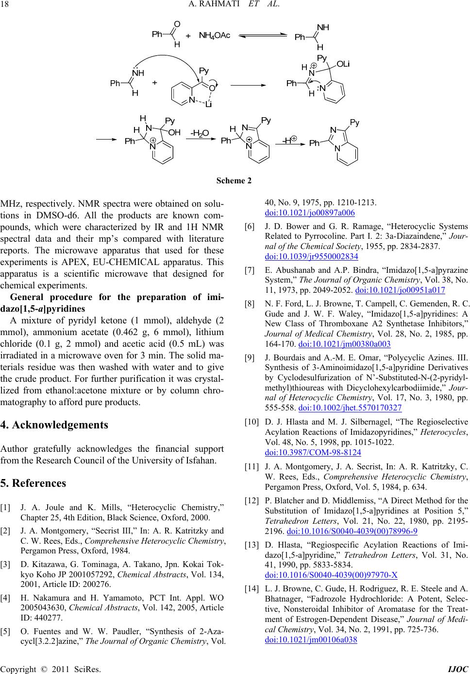 A. RAHMATI ET AL. 18 Scheme 2 MHz, respectively. NMR spectra were obtained on solu- tions in DMSO-d6. All the products are known com- pounds, which were characterized by IR and 1H NMR spectral data and their mp’s compared with literature reports. The microwave apparatus that used for these experiments is APEX, EU-CHEMICAL apparatus. This apparatus is a scientific microwave that designed for chemical experiments. General procedure for the preparation of imi- dazo[1,5-a]pyridines A mixture of pyridyl ketone (1 mmol), aldehyde (2 mmol), ammonium acetate (0.462 g, 6 mmol), lithium chloride (0.1 g, 2 mmol) and acetic acid (0.5 mL) was irradiated in a microwave oven for 3 min. The solid ma- terials residue was then washed with water and to give the crude product. For further purification it was crystal- lized from ethanol:acetone mixture or by column chro- matography t o aff or d p ure p ro duct s. 4. Acknowledgements Author gratefully acknowledges the financial support from the Research Council of the University of Isfahan. 5. References [1] J. A. Joule and K. Mills, “Heterocyclic Chemistry,” Chapter 25, 4th Edition, Black Science, Oxford, 2000. [2] J. A. Montgomery, “Secrist III,” In: A. R. Katritzky and C. W. Rees, Eds., Comprehensive Heterocyclic Chemistry, Pergamon Press, Oxford, 1984. [3] D. Kitazawa, G. Tominaga, A. Takano, Jpn. Kokai Tok- kyo Koho JP 2001057292, Chemical Abstracts, Vol. 134, 2001, Article ID: 200276. [4] H. Nakamura and H. Yamamoto, PCT Int. Appl. WO 2005043630, Chemical Abstracts, Vol. 142, 2005, Article ID: 440277. [5] O. Fuentes and W. W. Paudler, “Synthesis of 2-Aza- cycl[3.2.2]azine,” The Journal of Organic Chemistry, Vol. 40, No. 9, 1975, pp. 1210-1213. doi:10.1021/jo00897a006 [6] J. D. Bower and G. R. Ramage, “Heterocyclic Systems Related to Pyrrocoline. Part I. 2: 3a-Diazaindene,” Jour- nal of the Chemical Society, 1955, pp. 2834-2837. doi:10.1039/jr9550002834 [7] E. Abushanab and A.P. Bindra, “Imidazo[1,5-a]pyrazine System,” The Journal of Organic Chemistry, Vol. 38, No. 11, 1973, pp. 2049-2052. doi:10.1021/jo00951a017 [8] N. F. Ford, L. J. Browne, T. Campell, C. Gemenden, R. C. Gude and J. W. F. Waley, “Imidazo[1,5-a]pyridines: A New Class of Thromboxane A2 Synthetase Inhibitors,” Journal of Medical Chemistry, Vol. 28, No. 2, 1985, pp. 164-170. doi:10.1021/jm00380a003 [9] J. Bourdais and A.-M. E. Omar, “Polycyclic Azines. III. Synthesis of 3-Aminoimidazo[1,5-a]pyridine Derivatives by Cyclodesulfurization of N’-Substituted-N-(2-pyridyl- methyl)thioureas with Dicyclohexylcarbodiimide,” Jour- nal of Heterocyclic Chemistry, Vol. 17, No. 3, 1980, pp. 555-558. doi:10.1002/jhet.5570170327 [10] D. J. Hlasta and M. J. Silbernagel, “The Regioselective Acylation Reactions of Imidazopyridines,” Heterocycles, Vol. 48, No. 5, 1998, pp. 1015-1022. doi:10.3987/COM-98-8124 [11] J. A. Montgomery, J. A. Secrist, In: A. R. Katritzky, C. W. Rees, Eds., Comprehensive Heterocyclic Chemistry, Pergamon Press, Oxford, Vol. 5, 1984, p. 634. [12] P. Blatcher and D. Middlemiss, “A Direct Method for the Substitution of Imidazo[1,5-a]pyridines at Position 5,” Tetrahedron Letters, Vol. 21, No. 22, 1980, pp. 2195- 2196. doi:10.1016/S0040-4039(00)78996-9 [13] D. Hlasta, “Regiospecific Acylation Reactions of Imi- dazo[1,5-a]pyridine,” Tetrahedron Letters, Vol. 31, No. 41, 1990, pp. 5833-5834. doi:10.1016/S0040-4039(00)97970-X [14] L. J. Browne, C. Gude, H. Rodriguez, R. E. Steele and A. Bhatnager, “Fadrozole Hydrochloride: A Potent, Selec- tive, Nonsteroidal Inhibitor of Aromatase for the Treat- ment of Estrogen-Dependent Disease,” Journal of Medi- cal Chemistry, Vol. 34, No. 2, 1991, pp. 725-736. doi:10.1021/jm00106a038 Copyright © 2011 SciRes. IJOC