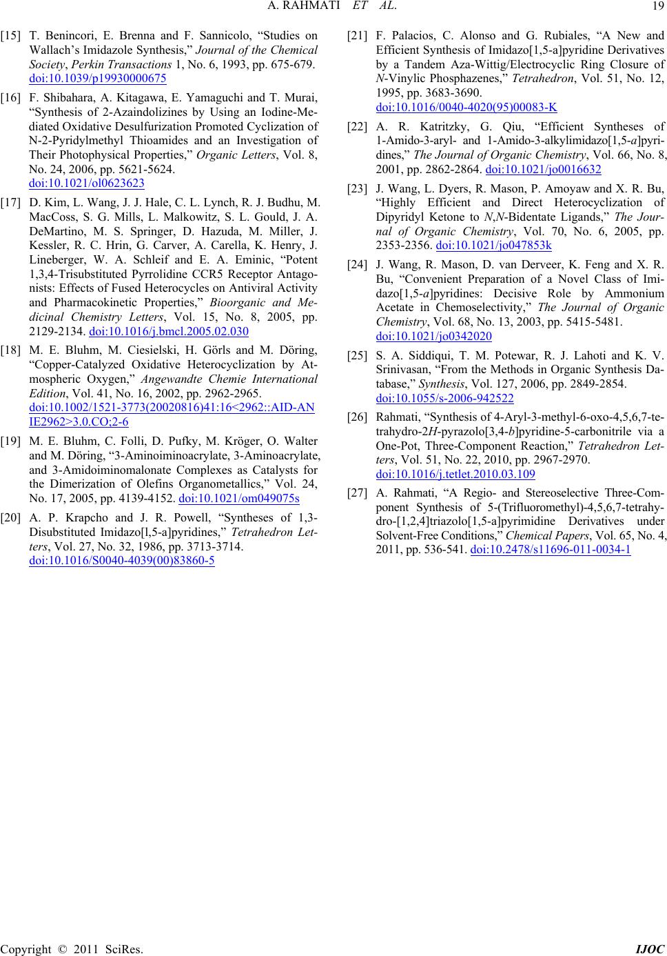 A. RAHMATI ET AL.19 [15] T. Benincori, E. Brenna and F. Sannicolo, “Studies on Wallach’s Imidaz ole Synthesis,” Journal of the Chemical Society, Perkin Transactions 1, No. 6, 1993, pp. 675-679. doi:10.1039/p19930000675 [16] F. Shibahara, A. Kitagawa, E. Yamaguchi and T. Murai, “Synthesis of 2-Azaindolizines by Using an Iodine-Me- diated Oxidative Desulfurization Promoted Cyclization of N-2-Pyridylmethyl Thioamides and an Investigation of Their Photophysical Properties,” Organic Letters, Vol. 8, No. 24, 2006, pp. 5621-5624. doi:10.1021/ol0623623 [17] D. Kim, L. Wang, J. J. Hale, C. L. Lynch, R. J. Budhu, M. MacCoss, S. G. Mills, L. Malkowitz, S. L. Gould, J. A. DeMartino, M. S. Springer, D. Hazuda, M. Miller, J. Kessler, R. C. Hrin, G. Carver, A. Carella, K. Henry, J. Lineberger, W. A. Schleif and E. A. Eminic, “Potent 1,3,4-Trisubstituted Pyrrolidine CCR5 Receptor Antago- nists: Effects of Fused Heterocycles on Antiviral Activity and Pharmacokinetic Properties,” Bioorganic and Me- dicinal Chemistry Letters, Vol. 15, No. 8, 2005, pp. 2129-2134. doi:10.1016/j.bmcl.2005.02.030 [18] M. E. Bluhm, M. Ciesielski, H. Görls and M. Döring, “Copper-Catalyzed Oxidative Heterocyclization by At- mospheric Oxygen,” Angewandte Chemie International Edition, Vol. 41, No. 16, 2002, pp. 2962-2965. doi:10.1002/1521-3773(20020816)41:16<2962::AID-AN IE2962>3.0.CO;2-6 [19] M. E. Bluhm, C. Folli, D. Pufky, M. Kröger, O. Walter and M. Döring, “3-Aminoiminoacrylate, 3-Aminoacrylate, and 3-Amidoiminomalonate Complexes as Catalysts for the Dimerization of Olefins Organometallics,” Vol. 24, No. 17, 2005, pp. 4139-4152. doi:10.1021/om049075s [20] A. P. Krapcho and J. R. Powell, “Syntheses of 1,3- Disubstituted Imidazo[l,5-a]pyridines,” Tetrahedron Let- ters, Vol. 27, No. 32, 1986, pp. 3713-3714. doi:10.1016/S0040-4039(00)83860-5 [21] F. Palacios, C. Alonso and G. Rubiales, “A New and Efficient Synthesis of Imidazo[1,5-a]pyridine Derivatives by a Tandem Aza-Wittig/Electrocyclic Ring Closure of N-Vinylic Phosphazenes,” Tetrahedron, Vol. 51, No. 12, 1995, pp. 3683-3690. doi:10.1016/0040-4020(95)00083-K [22] A. R. Katritzky, G. Qiu, “Efficient Syntheses of 1-Amido-3-aryl- and 1-Amido-3-alkylimidazo[1,5-a]pyri- dines,” The Journal of Organic Chemistry, Vol. 66, No. 8, 2001, pp. 2862-2864. doi:10.1021/jo0016632 [23] J. Wang, L. Dyers, R. Mason, P. Amoyaw and X. R. Bu, “Highly Efficient and Direct Heterocyclization of Dipyridyl Ketone to N,N-Bidentate Ligands,” The Jour- nal of Organic Chemistry, Vol. 70, No. 6, 2005, pp. 2353-2356. doi:10.1021/jo047853k [24] J. Wang, R. Mason, D. van Derveer, K. Feng and X. R. Bu, “Convenient Preparation of a Novel Class of Imi- dazo[1,5-a]pyridines: Decisive Role by Ammonium Acetate in Chemoselectivity,” The Journal of Organic Chemistry, Vol. 68, No. 13, 2003, pp. 5415-5481. doi:10.1021/jo0342020 [25] S. A. Siddiqui, T. M. Potewar, R. J. Lahoti and K. V. Srinivasan, “From the Methods in Organic Synthesis Da- tabase,” Synthesis, Vol. 127, 2006, pp. 2849-2854. doi:10.1055/s-2006-942522 [26] Rahmati, “Synthesis of 4-Aryl-3-methyl-6-oxo-4,5,6,7-te- trahydro-2H-pyrazolo[3,4-b]pyridine-5-carbonitrile via a One-Pot, Three-Component Reaction,” Tetrahedron Let- ters, Vol. 51, No. 22, 2010, pp. 2967-2970. doi:10.1016/j.tetlet.2010.03.109 [27] A. Rahmati, “A Regio- and Stereoselective Three-Com- ponent Synthesis of 5-(Trifluoromethyl)-4,5,6,7-tetrahy- dro-[1,2,4]triazolo[1,5-a]pyrimidine Derivatives under Solvent-Free Conditions,” Chemical Papers, Vol. 65, No. 4, 2011, pp. 536-541. doi:10.2478/s11696-011-0034-1 Copyright © 2011 SciRes. IJOC