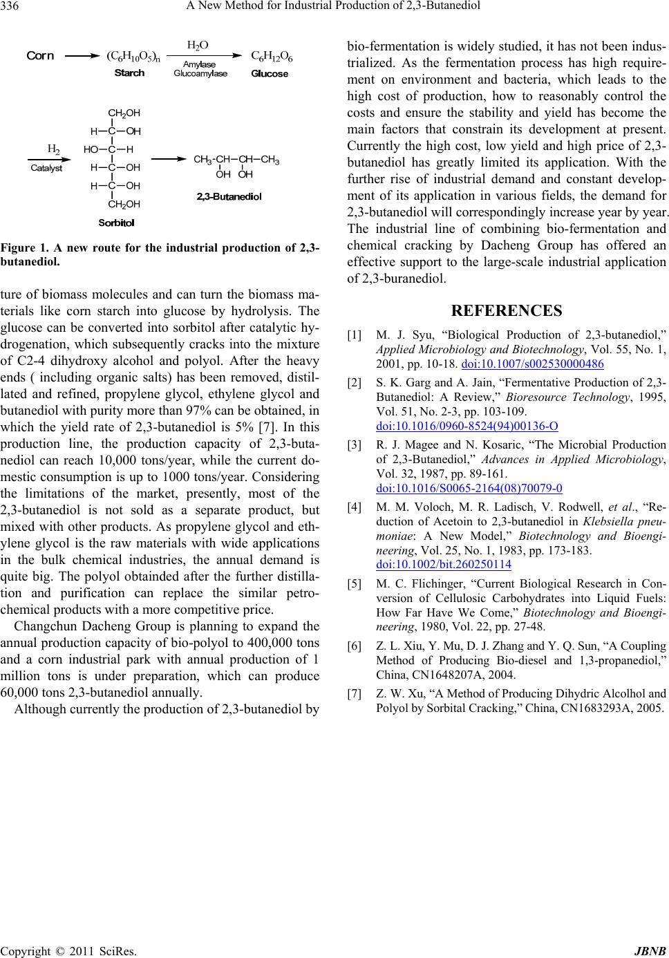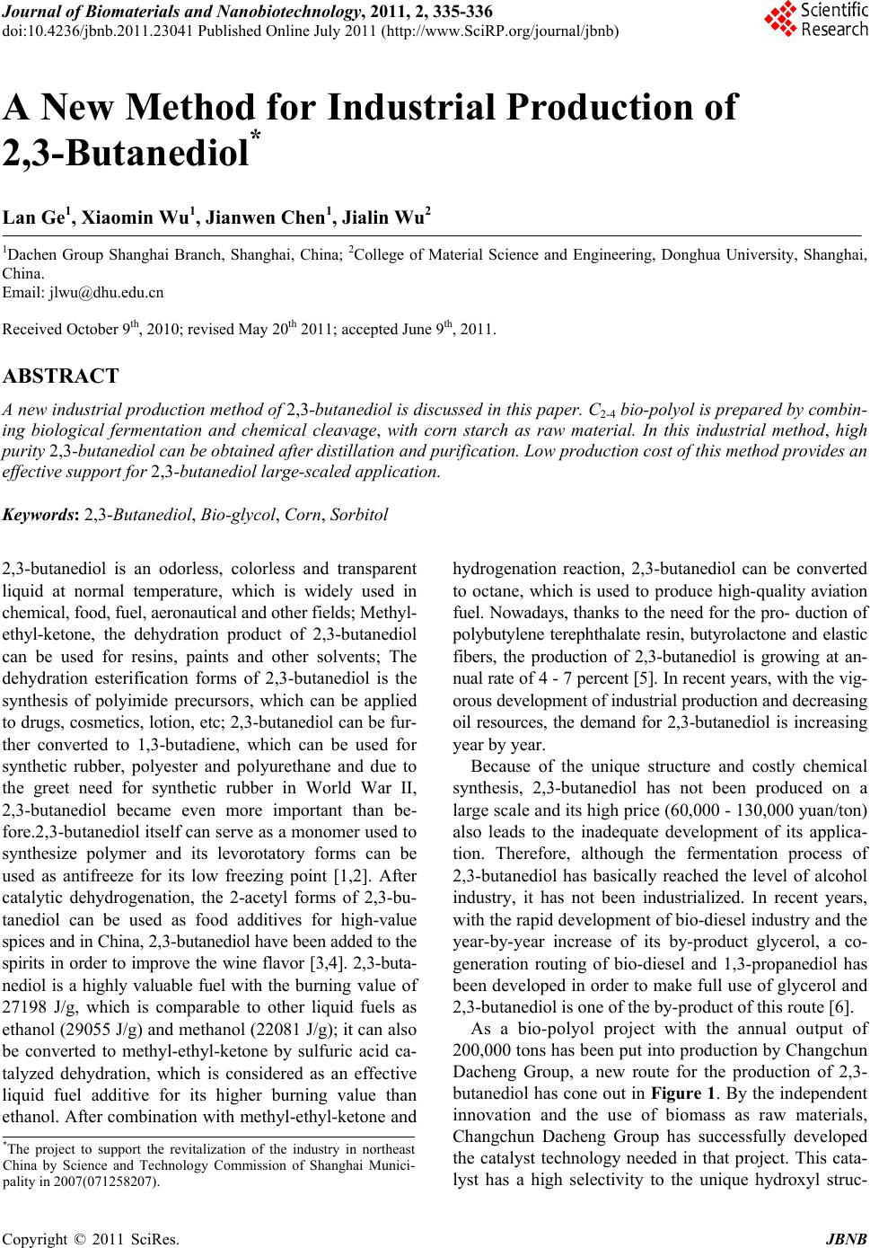![]() Journal of Biomaterials and Nanobiotechnology, 2011, 2, 335-336 doi:10.4236/jbnb.2011.23041 Published Online July 2011 (http://www.SciRP.org/journal/jbnb) Copyright © 2011 SciRes. JBNB 335 A New Method for Industrial Production of 2,3-Butanediol* Lan Ge1, Xiaomin Wu1, Jianwen Chen1, Jialin Wu2 1Dachen Group Shanghai Branch, Shanghai, China; 2College of Material Science and Engineering, Donghua University, Shanghai, China. Email: jlwu@dhu.edu.cn Received October 9th, 2010; revised May 20th 2011; accepted June 9th, 2011. ABSTRACT A new industrial production method of 2,3-butanediol is discussed in this paper. C2-4 bio-polyol is prepared by combin- ing biological fermentation and chemical cleavage, with corn starch as raw material. In this industrial method, high purity 2,3-butanediol can be obtained after distillation and purification. Low p rod uction cost of this method provides an effective support for 2,3-butaned iol large-scaled application. Keywords: 2,3-Butanediol, Bio-glycol, Corn, Sorbitol 2,3-butanediol is an odorless, colorless and transparent liquid at normal temperature, which is widely used in chemical, food, fuel , aeronautical and other fields; Methyl- ethyl-ketone, the dehydration product of 2,3-butanediol can be used for resins, paints and other solvents; The dehydration esterification forms of 2,3-butanediol is the synthesis of polyimide precursors, which can be applied to drugs, cosmetics, lotion, etc; 2,3-butanediol can be fur- ther converted to 1,3-butadiene, which can be used for synthetic rubber, polyester and polyurethane and due to the greet need for synthetic rubber in World War II, 2,3-butanediol became even more important than be- fore.2,3-butanedio l itself can serve as a monomer used to synthesize polymer and its levorotatory forms can be used as antifreeze for its low freezing point [1,2]. After catalytic dehydrogenation, the 2-acetyl forms of 2,3-bu- tanediol can be used as food additives for high-value spices and in China, 2,3-butanediol have been added to the spirits in order to improve the wine flavor [3,4]. 2,3-buta- nediol is a highly valuable fuel with the burning value of 27198 J/g, which is comparable to other liquid fuels as ethanol (29055 J/g) and methanol (22081 J/g); it can also be converted to methyl-ethyl-ketone by sulfuric acid ca- talyzed dehydration, which is considered as an effective liquid fuel additive for its higher burning value than ethanol. After combination with methyl-ethyl-ketone an d hydrogenation reaction, 2,3-butanediol can be converted to octane, which is used to produce high-quality aviation fuel. Nowadays, thanks to the need for the pro- duction of polybutylene terephthalate resin, butyrolactone and elastic fibers, the production of 2,3-butanediol is growing at an- nual rate of 4 - 7 percent [5]. In recent years, with the v ig- orous development of industrial production and decreasing oil resources, the demand for 2,3-butanediol is increasing year by year. Because of the unique structure and costly chemical synthesis, 2,3-butanediol has not been produced on a large scale and its high price (60,000 - 130,000 yuan/ton) also leads to the inadequate development of its applica- tion. Therefore, although the fermentation process of 2,3-butanediol has basically reached the level of alcohol industry, it has not been industrialized. In recent years, with the rapid development of bio-diesel industry and the year-by-year increase of its by-product glycerol, a co- generation routing of bio-diesel and 1,3-propanediol has been developed in order to make full use of glycerol and 2,3-butanediol is one of the by-pr o duct o f th i s rout e [6] . As a bio-polyol project with the annual output of 200,000 tons has been put into production by Changchun Dacheng Group, a new route for the production of 2,3- butanediol has cone out in Figure 1. By the independent innovation and the use of biomass as raw materials, Changchun Dacheng Group has successfully developed the catalyst technology needed in that project. This cata- lyst has a high selectivity to the unique hydroxyl struc- *The project to support the revitalization of the industry in northeast China by Science and Technology Commission of Shanghai Munici- p ality in 2007(07125820 7) . ![]() A New Method for Industrial Production of 2,3-Butanediol Copyright © 2011 SciRes. JBNB 336 Figure 1. A new route for the industrial production of 2,3- butanediol. ture of biomass molecules and can turn the biomass ma- terials like corn starch into glucose by hydrolysis. The glucose can be converted into sorbitol after catalytic hy- drogenation, which subsequently cracks into the mixture of C2-4 dihydroxy alcohol and polyol. After the heavy ends ( including organic salts) has been removed, distil- lated and refined, propylene glycol, ethylene glycol and butanediol with purity more than 97% can be obtain ed, in which the yield rate of 2,3-butanediol is 5% [7]. In this production line, the production capacity of 2,3-buta- nediol can reach 10,000 tons/year, while the current do- mestic consumption is up to 1000 tons/year. Con sidering the limitations of the market, presently, most of the 2,3-butanediol is not sold as a separate product, but mixed with other products. As propylene glycol and eth- ylene glycol is the raw materials with wide applications in the bulk chemical industries, the annual demand is quite big. The polyol obtainded after the further distilla- tion and purification can replace the similar petro- chemical products with a more competitive price. Changchun Dacheng Group is planning to expand the annual production cap acity of bio-polyol to 400,000 tons and a corn industrial park with annual production of 1 million tons is under preparation, which can produce 60,000 tons 2,3-butanediol annually. Although currently the production of 2,3-butanediol by bio-fermentation is widely studied, it has not b een indus- trialized. As the fermentation process has high require- ment on environment a