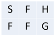 RL is characterized by the agent, the environment and their interaction. Therefore, each RL algorithm needs to be tested in certain environments. In this report, we use the grid world environment, which is a commonly adopted benchmark in RL. Compared with the contextual bandit problem studied in [19], the grid world is harder as it delays the positive reward until the goal state is reached. Grid world is a 2D rectangular grid, where an agent starts at one grid square (the start state) and tries to move to another grid square (the goal state). The goal of RL algorithms is for the agent to learn optimal paths on the grid to arrive at the goal state in the least number of steps. The agent can move in up, down, left, or right directions by one grid square. Our grid world is similar to the Frozen Lake environment from gym [https://gym.openai.com/envs/FrozenLake-v0/] but with a smaller 2 × 3 size while the standard size is 4 × 4. It is a 2 × 3 grid which contain four possible areas―Start (S), Frozen (F), Hole (H) and Goal (G) (Figure 1). The agent moves around the grid until it reaches the goal or the hole. If it falls into the hole, it has to start from the beginning and is rewarded the value 0. The process continues until it learns how to reach the goal eventually. The visual description of this grid world is in Figure 1.
