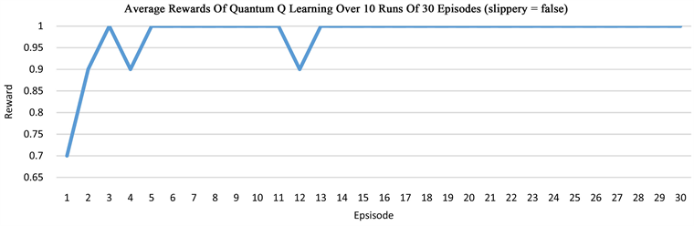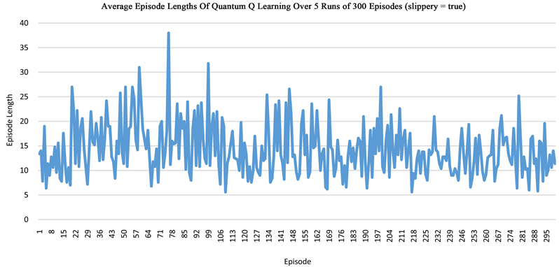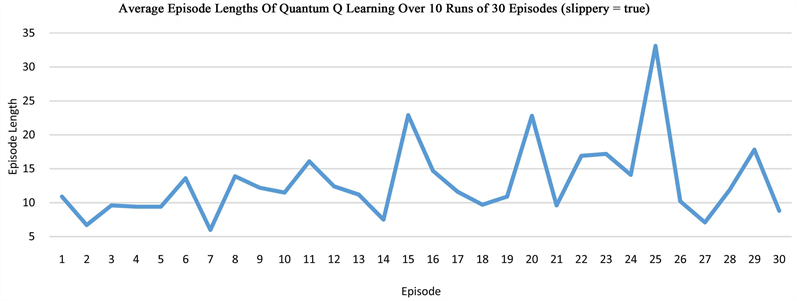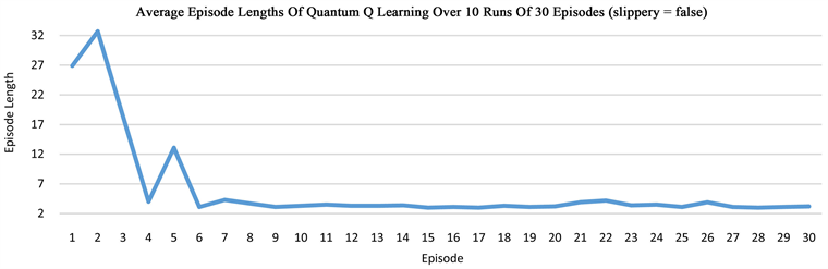 The grid world environment is widely used to evaluate RL algorithms. Our quantum Q learning is evaluated in this environment that is explained in Section 3.1. The aim of Q learning in this environment of size 2 × 3 is to discover a strategy that controls the behavior of an agent and helps to know how to act from a particular state. We run the algorithm in series of experiments, then take the average of the rewards and path lengths in each case, demonstrating that our quantum network is able to solve the grid world problem. In the non-slippery grid world, the optimal path length is 3, while in the slippery case, it takes more than 3 steps to arrive at the goal state G. One episode is defined as a sequence of moves from the start state S to a terminal state that can be either the hole H or the goal G in our grid world. Our results indicate that after about 5 episodes, the quantum network is able to learn how to reach the goal state G in three steps for the non-slippery case, but the learning in the slippery case is much harder (Figure 3).