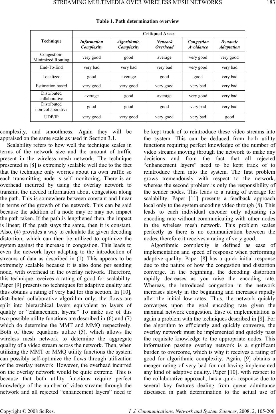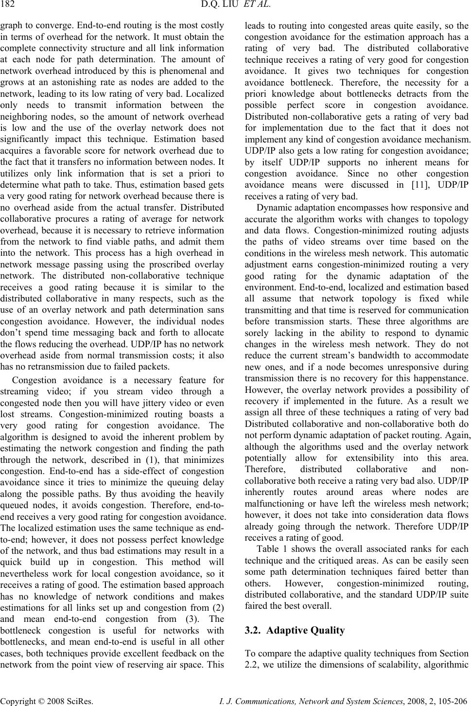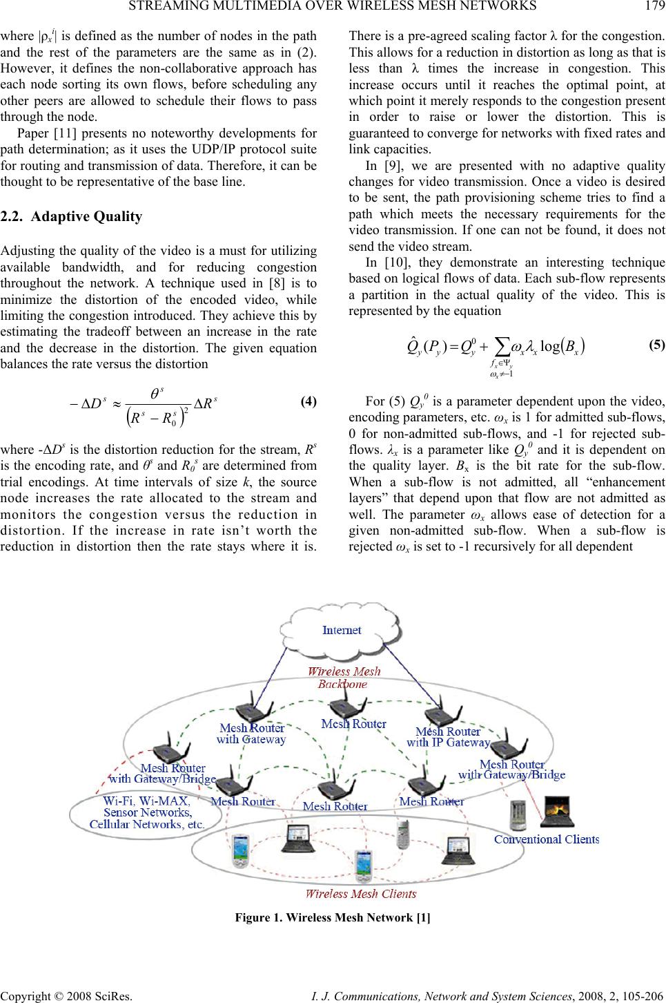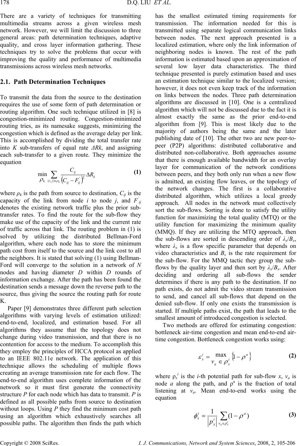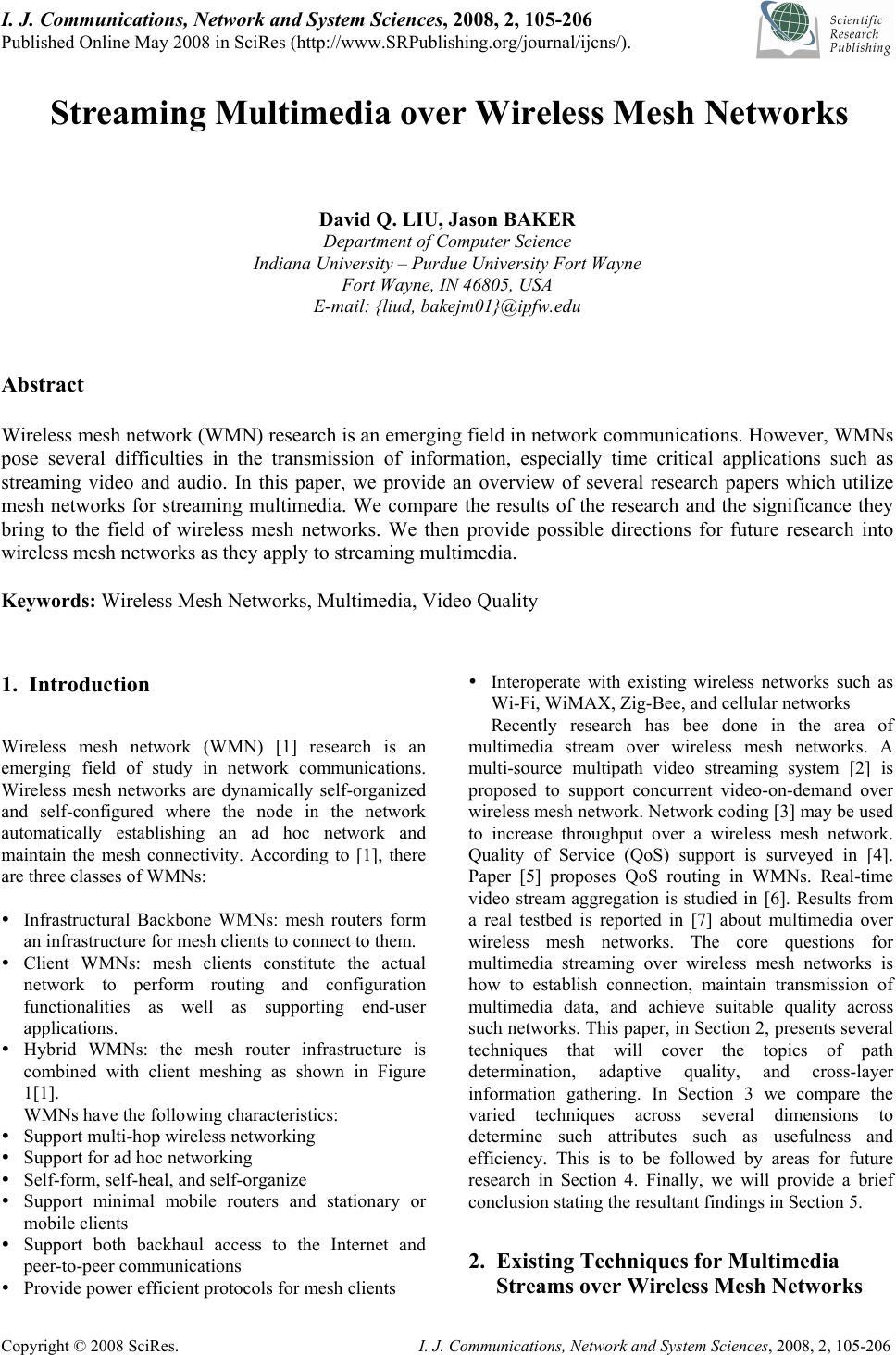 ![]() I. J. Communications, Network and System Sciences, 2008, 2, 105-206 Published Online May 2008 in SciRes (http://www.SRPublishing.org/journal/ijcns/). Copyright © 2008 SciRes. I. J. Communications, Network and System Sciences, 2008, 2, 105-206 Streaming Multimedia over Wireless Mesh Networks David Q. LIU, Jason BAKER Department of Computer Science Indiana University – Purdue University Fort Wayne Fort Wayne, IN 46805, USA E-mail: {liud, bakejm01}@ipfw.edu Abstract Wireless mesh network (WMN) research is an emerging field in network communications. However, WMNs pose several difficulties in the transmission of information, especially time critical applications such as streaming video and audio. In this paper, we provide an overview of several research papers which utilize mesh networks for streaming multimedia. We compare the results of the research and the significance they bring to the field of wireless mesh networks. We then provide possible directions for future research into wireless mesh networks as they apply to streaming multimedia. Keywords: Wireless Mesh Networks, Multimedia, Video Quality 1. Introduction Wireless mesh network (WMN) [1] research is an emerging field of study in network communications. Wireless mesh networks are dynamically self-organized and self-configured where the node in the network automatically establishing an ad hoc network and maintain the mesh connectivity. According to [1], there are three classes of WMNs: y Infrastructural Backbone WMNs: mesh routers form an infrastructure for mesh clients to connect to them. y Client WMNs: mesh clients constitute the actual network to perform routing and configuration functionalities as well as supporting end-user applications. y Hybrid WMNs: the mesh router infrastructure is combined with client meshing as shown in Figure 1[1]. WMNs have the following characteristics: y Support multi-hop wireless networking y Support for ad hoc networking y Self-form, self-heal, and self-organize y Support minimal mobile routers and stationary or mobile clients y Support both backhaul access to the Internet and peer-to-peer communications y Provide power efficient protocols for mesh clients y Interoperate with existing wireless networks such as Wi-Fi, WiMAX, Zig-Bee, and cellular networks Recently research has bee done in the area of multimedia stream over wireless mesh networks. A multi-source multipath video streaming system [2] is proposed to support concurrent video-on-demand over wireless mesh network. Network coding [3] may be used to increase throughput over a wireless mesh network. Quality of Service (QoS) support is surveyed in [4]. Paper [5] proposes QoS routing in WMNs. Real-time video stream aggregation is studied in [6]. Results from a real testbed is reported in [7] about multimedia over wireless mesh networks. The core questions for multimedia streaming over wireless mesh networks is how to establish connection, maintain transmission of multimedia data, and achieve suitable quality across such networks. This paper, in Section 2, presents several techniques that will cover the topics of path determination, adaptive quality, and cross-layer information gathering. In Section 3 we compare the varied techniques across several dimensions to determine such attributes such as usefulness and efficiency. This is to be followed by areas for future research in Section 4. Finally, we will provide a brief conclusion stating the resultant findings in Section 5. 2. Existing Techniques for Multimedia Streams over Wireless Mesh Networks ![]() 178 D.Q. LIU ET AL. Copyright © 2008 SciRes. I. J. Communications, Network and System Sciences, 2008, 2, 105-206 There are a variety of techniques for transmitting multimedia streams across a given wireless mesh network. However, we will limit the discussion to three general areas: path determination techniques, adaptive quality, and cross layer information gathering. These techniques try to solve the problems that occur with improving the quality and performance of multimedia transmissions across wireless mesh networks. 2.1. Path Determination Techniques To transmit the data from the source to the destination requires the use of some form of path determination or routing algorithm. One such technique utilized in [8] is congestion-minimized routing. Congestion-minimized routing tries, as its namesake suggests, minimizing the congestion which is defined as the average delay per link. This is accomplished by dividing the total transfer rate into K sub-transfers of equal rate ∆Rk, and assigning each sub-transfer to a given route. They minimize the equation () ∑ ∈ ∆ − k ji k ijij ij k R FC C ρ ρ ),( 2 ' min (1) where ρk is the path from source to destination, Cij is the capacity of the link from node i to node j, and F’ ij denotes the existing network traffic plus the prior sub- transfer rates. To find the route for the sub-flow they make use of the capacity of the link and the current rate of traffic across that link. The routing problem in (1) is solved by utilizing the distributed Bellman-Ford algorithm, where each node has to store the minimum path cost from itself to the source and the link cost to all the neighbors. It is stated that solving (1) using Bellman- Ford will converge to the solution in a network of N nodes and having diameter D within D rounds of information exchange. After the path has been found the destination sends a message down the reverse path to the source, thus giving the source the routing path for route K. Paper [9] demonstrates three different path selection algorithms with varying levels of estimation utilized: end-to-end, localized, and estimation based. For all algorithms they assume that the topology does not change during video transmission, and that there is no contention for access to the medium. To accomplish this they employ the principles of HCCA protocol as applied to an IEEE 802.11e network. The application of this technique allows the 