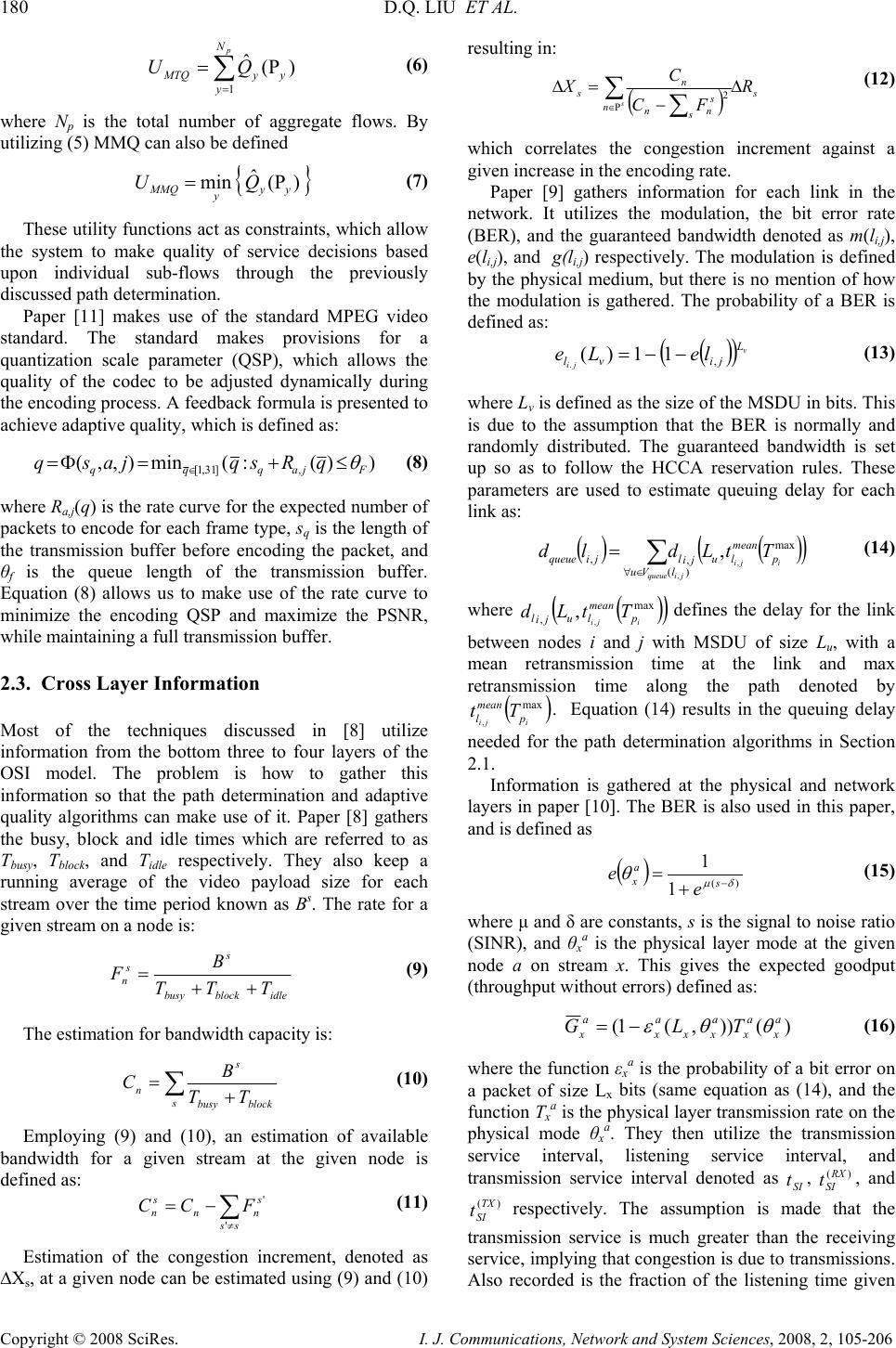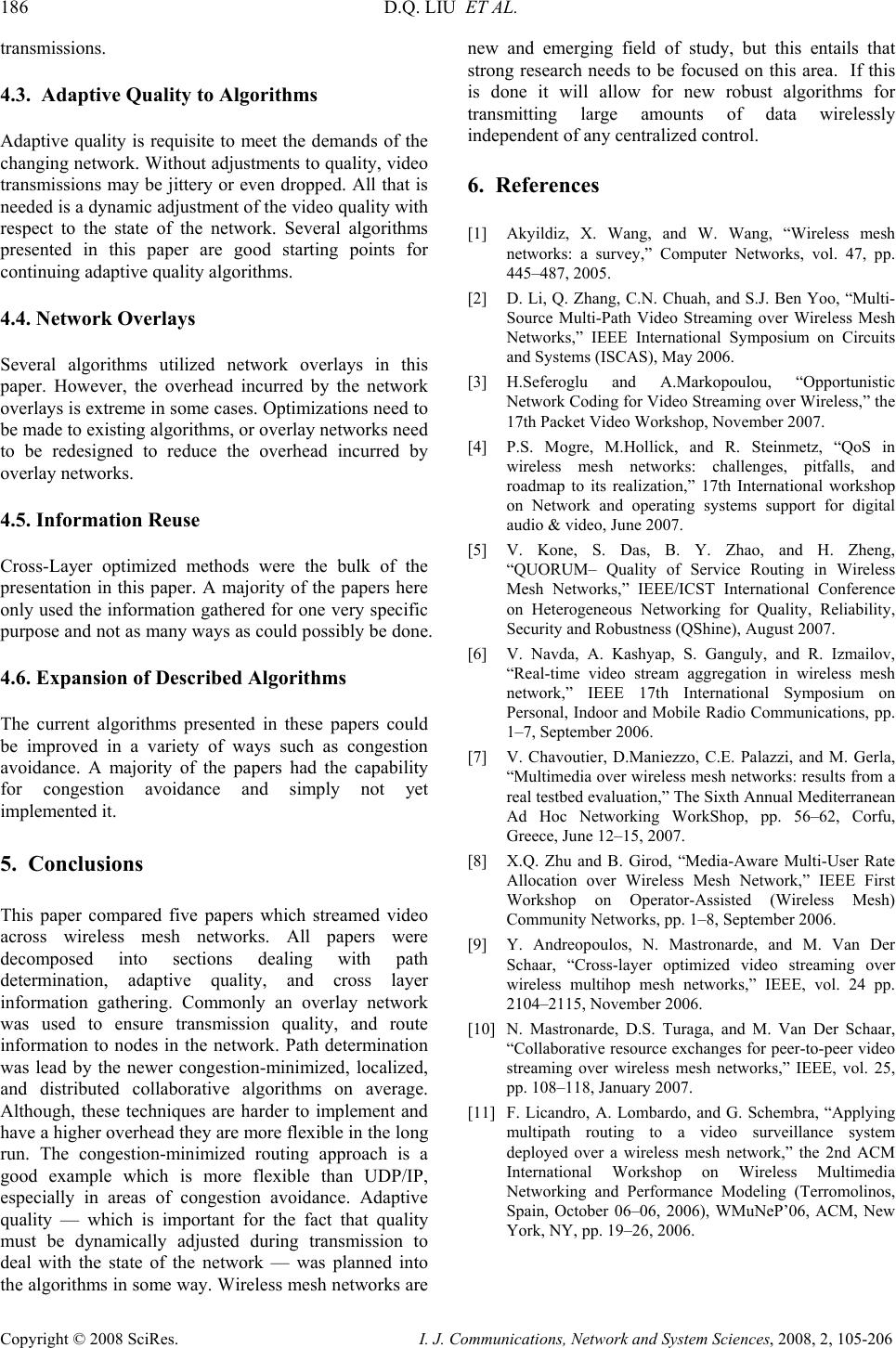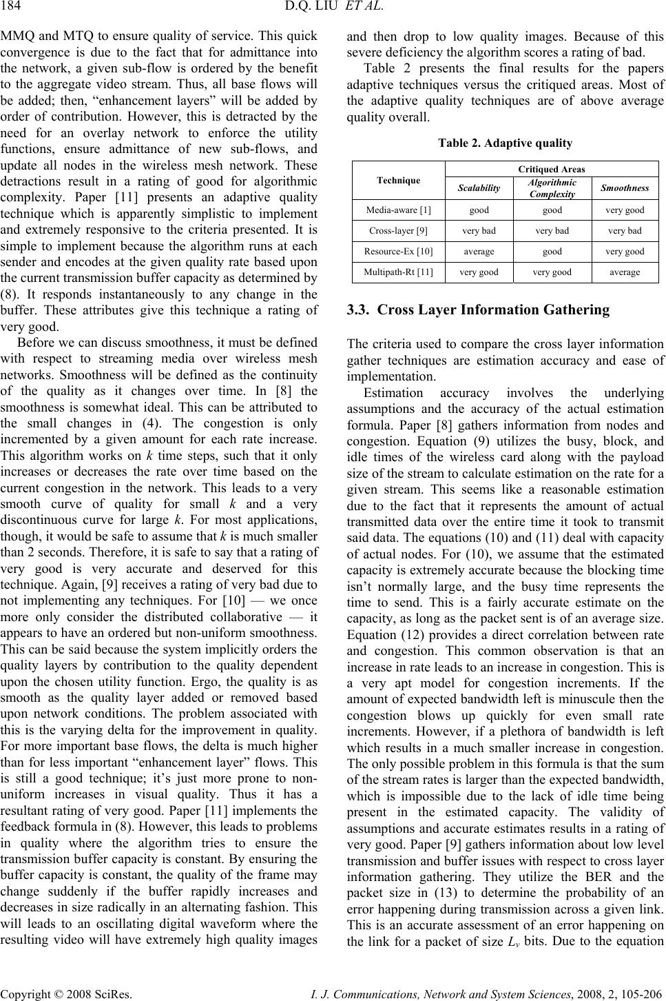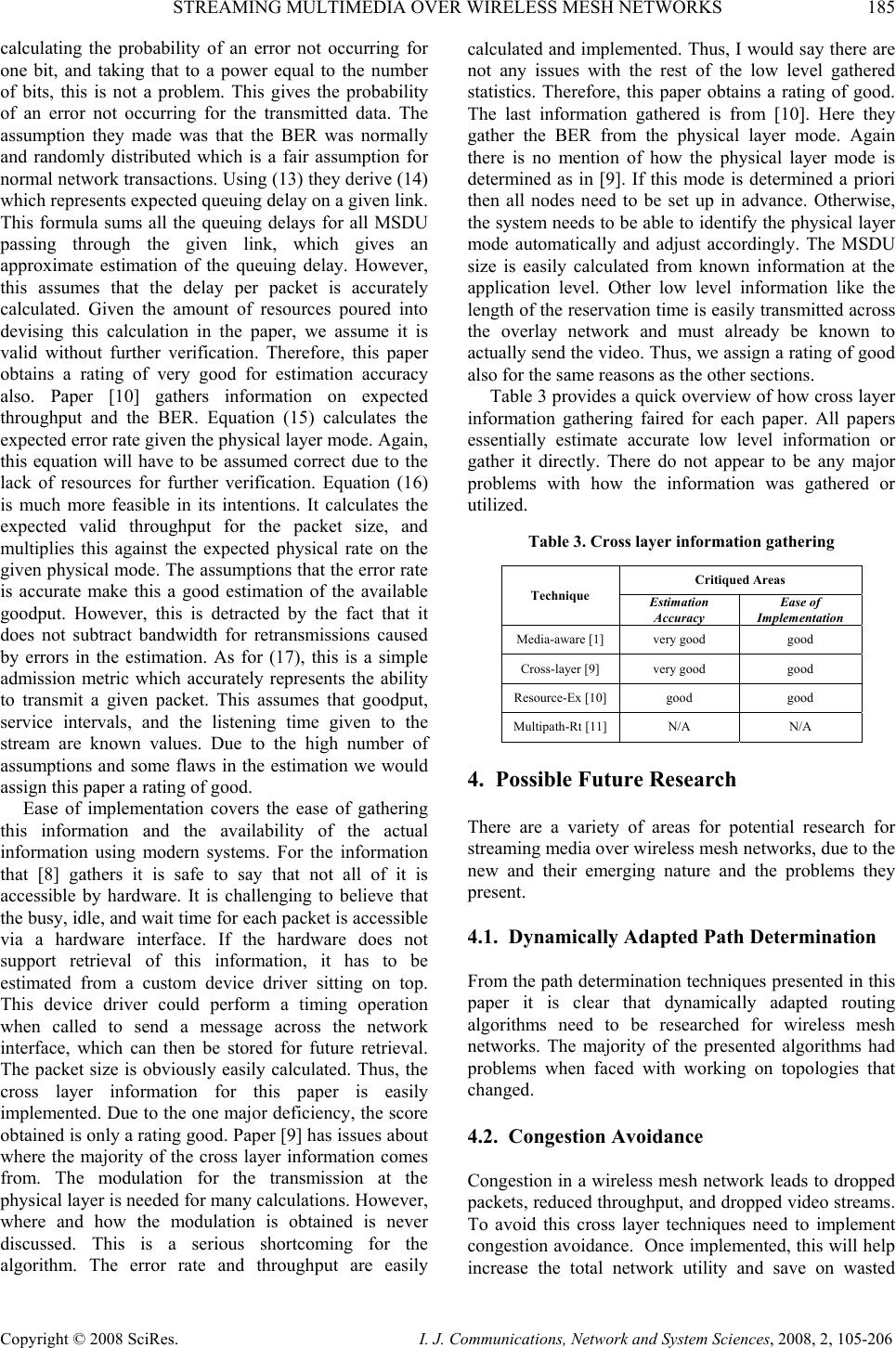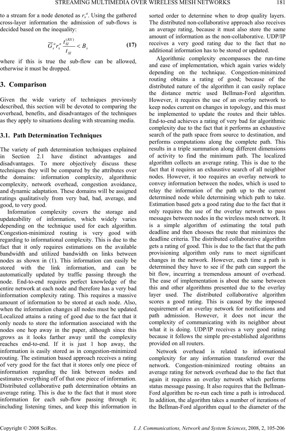 ![]() I. J. Communications, Network and System Sciences, 2008, 2, 105-206 Published Online May 2008 in SciRes (http://www.SRPublishing.org/journal/ijcns/). Copyright © 2008 SciRes. I. J. Communications, Network and System Sciences, 2008, 2, 105-206 Streaming Multimedia over Wireless Mesh Networks David Q. LIU, Jason BAKER Department of Computer Science Indiana University – Purdue University Fort Wayne Fort Wayne, IN 46805, USA E-mail: {liud, bakejm01}@ipfw.edu Abstract Wireless mesh network (WMN) research is an emerging field in network communications. However, WMNs pose several difficulties in the transmission of information, especially time critical applications such as streaming video and audio. In this paper, we provide an overview of several research papers which utilize mesh networks for streaming multimedia. We compare the results of the research and the significance they bring to the field of wireless mesh networks. We then provide possible directions for future research into wireless mesh networks as they apply to streaming multimedia. Keywords: Wireless Mesh Networks, Multimedia, Video Quality 1. Introduction Wireless mesh network (WMN) [1] research is an emerging field of study in network communications. Wireless mesh networks are dynamically self-organized and self-configured where the node in the network automatically establishing an ad hoc network and maintain the mesh connectivity. According to [1], there are three classes of WMNs: y Infrastructural Backbone WMNs: mesh routers form an infrastructure for mesh clients to connect to them. y Client WMNs: mesh clients constitute the actual network to perform routing and configuration functionalities as well as supporting end-user applications. y Hybrid WMNs: the mesh router infrastructure is combined with client meshing as shown in Figure 1[1]. WMNs have the following characteristics: y Support multi-hop wireless networking y Support for ad hoc networking y Self-form, self-heal, and self-organize y Support minimal mobile routers and stationary or mobile clients y Support both backhaul access to the Internet and peer-to-peer communications y Provide power efficient protocols for mesh clients y Interoperate with existing wireless networks such as Wi-Fi, WiMAX, Zig-Bee, and cellular networks Recently research has bee done in the area of multimedia stream over wireless mesh networks. A multi-source multipath video streaming system [2] is proposed to support concurrent video-on-demand over wireless mesh network. Network coding [3] may be used to increase throughput over a wireless mesh network. Quality of Service (QoS) support is surveyed in [4]. Paper [5] proposes QoS routing in WMNs. Real-time video stream aggregation is studied in [6]. Results from a real testbed is reported in [7] about multimedia over wireless mesh networks. The core questions for multimedia streaming over wireless mesh networks is how to establish connection, maintain transmission of multimedia data, and achieve suitable quality across such networks. This paper, in Section 2, presents several techniques that will cover the topics of path determination, adaptive quality, and cross-layer information gathering. In Section 3 we compare the varied techniques across several dimensions to determine such attributes such as usefulness and efficiency. This is to be followed by areas for future research in Section 4. Finally, we will provide a brief conclusion stating the resultant findings in Section 5. 2. Existing Techniques for Multimedia Streams over Wireless Mesh Networks ![]() 178 D.Q. LIU ET AL. Copyright © 2008 SciRes. I. J. Communications, Network and System Sciences, 2008, 2, 105-206 There are a variety of techniques for transmitting multimedia streams across a given wireless mesh network. However, we will limit the discussion to three general areas: path determination techniques, adaptive quality, and cross layer information gathering. These techniques try to solve the problems that occur with improving the quality and performance of multimedia transmissions across wireless mesh networks. 2.1. Path Determination Techniques To transmit the data from the source to the destination requires the use of some form of path determination or routing algorithm. One such technique utilized in [8] is congestion-minimized routing. Congestion-minimized routing tries, as its namesake suggests, minimizing the congestion which is defined as the average delay per link. This is accomplished by dividing the total transfer rate into K sub-transfers of equal rate ∆Rk, and assigning each sub-transfer to a given route. They minimize the equation () ∑ ∈ ∆ − k ji k ijij ij k R FC C ρ ρ ),( 2 ' min (1) where ρk is the path from source to destination, Cij is the capacity of the link from node i to node j, and F’ ij denotes the existing network traffic plus the prior sub- transfer rates. To find the route for the sub-flow they make use of the capacity of the link and the current rate of traffic across that link. The routing problem in (1) is solved by utilizing the distributed Bellman-Ford algorithm, where each node has to store the minimum path cost from itself to the source and the link cost to all the neighbors. It is stated that solving (1) using Bellman- Ford will converge to the solution in a network of N nodes and having diameter D within D rounds of information exchange. After the path has been found the destination sends a message down the reverse path to the source, thus giving the source the routing path for route K. Paper [9] demonstrates three different path selection algorithms with varying levels of estimation utilized: end-to-end, localized, and estimation based. For all algorithms they assume that the topology does not change during video transmission, and that there is no contention for access to the medium. To accomplish this they employ the principles of HCCA protocol as applied to an IEEE 802.11e network. The application of this technique allows the 