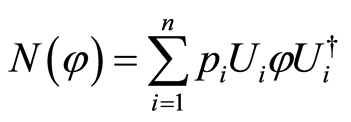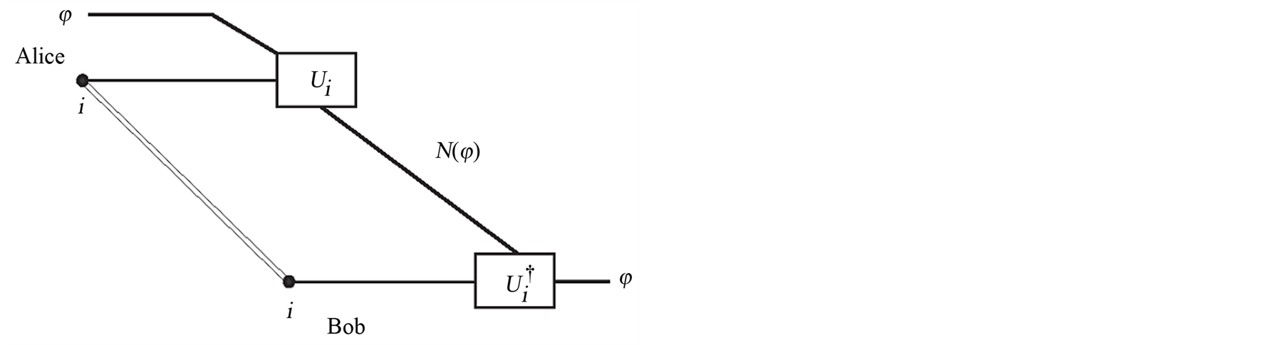 Figure 1. Private quantum channel: Alice applies Ui’s for encoding of φ and Bob decodes N(φ) with a secret key i which is pre-shared log n-bits of classical information.