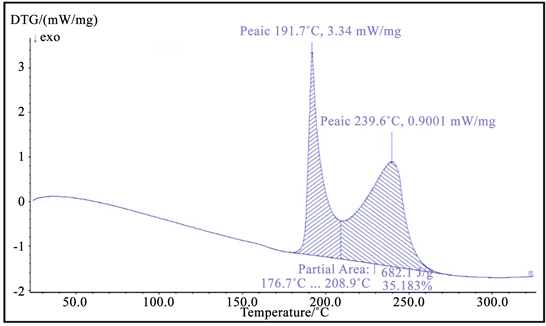 The curve shows a sharp weight loss at 190˚C without any intermediate stages, which is assigned as melting point of the crystal [22]. There is no weight loss below 190˚C, illustrating the absence of absorbed water in the crystal.