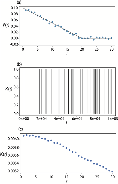 which is shown as the solid line in Figure 4(a). This function is plausible in the sense that memory decreases as lag r increases. We set other conditions as and , tentatively determined to fit actual word occurrences. We then generate signals according to the conditional probability given by Equation (9) using a simple Monte Carlo procedure, the algorithm for which is basically the same as that for generating using the first-order Markov chain. The Monte Carlo simulation to generate applies two conditions (C1) and (C2), as follows: