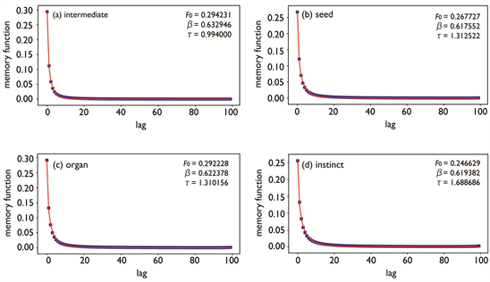 obtained for typical Type-I words. When calculating , we have used represented by best-fitted KWW functions at each lag step instead of the original ACVFs to reduce noise effects. Red lines in that figure represent results fitted to by use of KWW functions, indicating that memory functions for Type-I words can also be well described by KWW functions as in the case of fitting ACVFs.