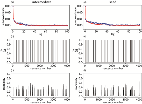 Figure 6. (a) and (d) ACVFs calculated from actual signals Xt observed in the text (blue plots) and those reproduced from simulated signals Xn (red plots); (b) and (e) Simulated signals Xn generated using the simple Monte Carlo procedures; (c) and (f) Conditional probabilities of Xn being 1 calculated using Equation (9). The left and right columns show results for the words “intermediate” and “seed” respectively.