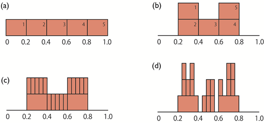 4) Division into five subintervals, choosing indices ,,, and and the stacking of probabilities are repeated for each portion of the top layer in the probability distribution as in Figure 8(c) and Figure 8(d). This procedure is recursively repeated to form a desired hierarchical structure for the probability distribution. For example, if we repeat this procedure twice, we obtain the probability distribution in Figure 8(d) with four different density function values (zero and three positive values 1, 2 and 3). Similarly, by repeating this three times, we obtain a probability distribution with five function values.