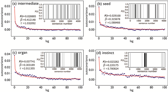 Figure 1. Examples of Xt (insets) and ACVFs (blue plots) for typical Type-I words. Red curves represent the best-fitted KWW functions (see Section 4) of which optimized parameters are shown in the plot areas. Xt and ACVFs for (a) “intermediate”, (b) “seed”, (c) “organ” and (d) “instinct”, from a set of frequent words in Darwin text.