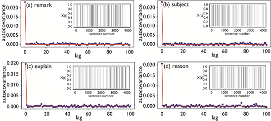 Figure 2. Examples of Xt (insets) and ACVFs (blue plots) for typical Type-II words. Red lines represent the stepdown functions. Xt and ACVFs for (a) “remark”, (b) “subject”, (c) “explanation”, and (d) “reason”, from a set of frequently used words in the Darwin text.