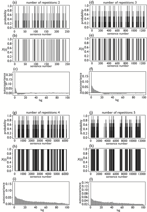 Figure 9. Time-varying probabilities of word occurrence ((a), (d), (g) and (j)), simulated signals Xt generated using a simple Monte Carlo procedure with the time-varying probabilities ((b), (e), (h) and (k)), and ACVFs calculated from simulated signals Xt ((c), (f), (i) and (l)). Plots (a)-(c) show the case of two repetitions of the recursive procedure, (d)-(f) show the case of three repetitions, (g)-(i) show the case of four repetitions, and (j)-(l) show the case of five repetitions.