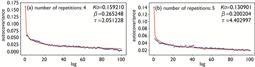 Figure 10. Fitting results by use of KWW function (red curves) to ACVFs (blue plots) obtained from simulated Xt. The recursive procedure for constructing the time-varying probability was repeated (a) 4 times and (b) 5 times.