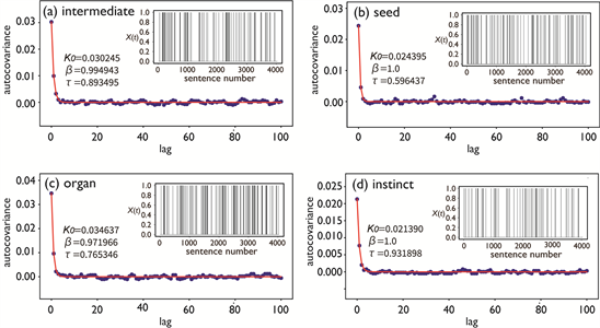 Figure 3. Simulated signals Xt (insets) for the typical Type-I words obtained as a realization of first-order Markov chains and ACVFs (blue plots) calculated from those Xt. Red curves represent best-fitted KWW functions, optimized parameters for which are shown in the plot areas. Results are for the words (a) “intermediate”, (b) “seed”, (c) “organ”, and (d) “instinct”.