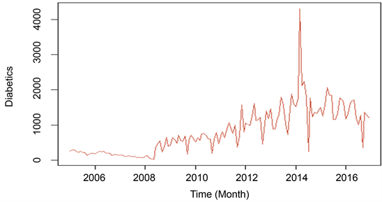 The sequence chart of diabetes patients attended at Al-Baha hospitals from the period January 2006 to November 2016 fluctuates is shown in Figure 1.