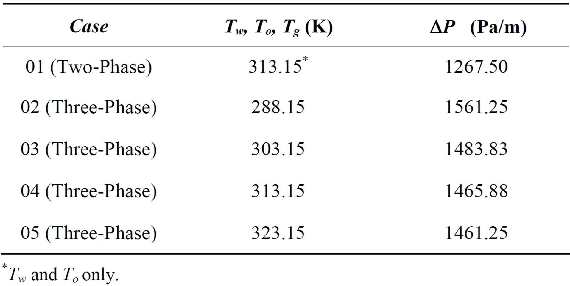 Table 4 presents the values for the pressure drop as a function of temperature for Cases 01 to 05 (two and three phases). It can be seen that for the three-phase flow (oilwater-gas) an increase in temperature results in a reduction of pressure drop,